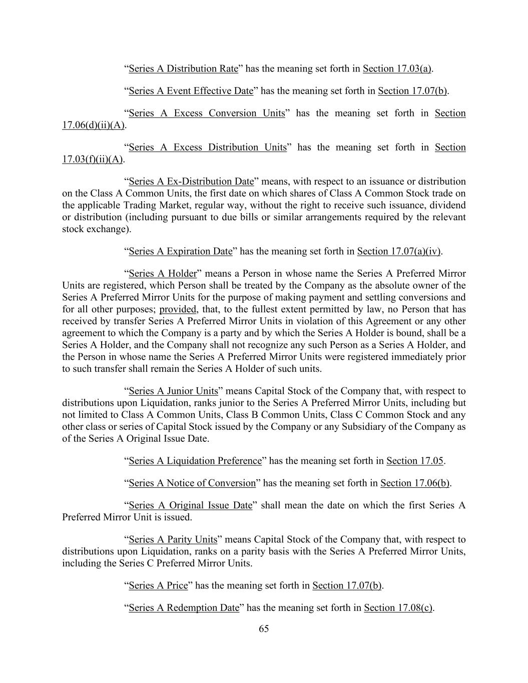 65 “Series A Distribution Rate” has the meaning set forth in Section 17.03(a). “Series A Event Effective Date” has the meaning set forth in Section 17.07(b). “Series A Excess Conversion Units” has the meaning set forth in Section 17.06(d)(ii)(A). “Series A Excess Distribution Units” has the meaning set forth in Section 17.03(f)(ii)(A). “Series A Ex-Distribution Date” means, with respect to an issuance or distribution on the Class A Common Units, the first date on which shares of Class A Common Stock trade on the applicable Trading Market, regular way, without the right to receive such issuance, dividend or distribution (including pursuant to due bills or similar arrangements required by the relevant stock exchange). “Series A Expiration Date” has the meaning set forth in Section 17.07(a)(iv). “Series A Holder” means a Person in whose name the Series A Preferred Mirror Units are registered, which Person shall be treated by the Company as the absolute owner of the Series A Preferred Mirror Units for the purpose of making payment and settling conversions and for all other purposes; provided, that, to the fullest extent permitted by law, no Person that has received by transfer Series A Preferred Mirror Units in violation of this Agreement or any other agreement to which the Company is a party and by which the Series A Holder is bound, shall be a Series A Holder, and the Company shall not recognize any such Person as a Series A Holder, and the Person in whose name the Series A Preferred Mirror Units were registered immediately prior to such transfer shall remain the Series A Holder of such units. “Series A Junior Units” means Capital Stock of the Company that, with respect to distributions upon Liquidation, ranks junior to the Series A Preferred Mirror Units, including but not limited to Class A Common Units, Class B Common Units, Class C Common Stock and any other class or series of Capital Stock issued by the Company or any Subsidiary of the Company as of the Series A Original Issue Date. “Series A Liquidation Preference” has the meaning set forth in Section 17.05. “Series A Notice of Conversion” has the meaning set forth in Section 17.06(b). “Series A Original Issue Date” shall mean the date on which the first Series A Preferred Mirror Unit is issued. “Series A Parity Units” means Capital Stock of the Company that, with respect to distributions upon Liquidation, ranks on a parity basis with the Series A Preferred Mirror Units, including the Series C Preferred Mirror Units. “Series A Price” has the meaning set forth in Section 17.07(b). “Series A Redemption Date” has the meaning set forth in Section 17.08(c).