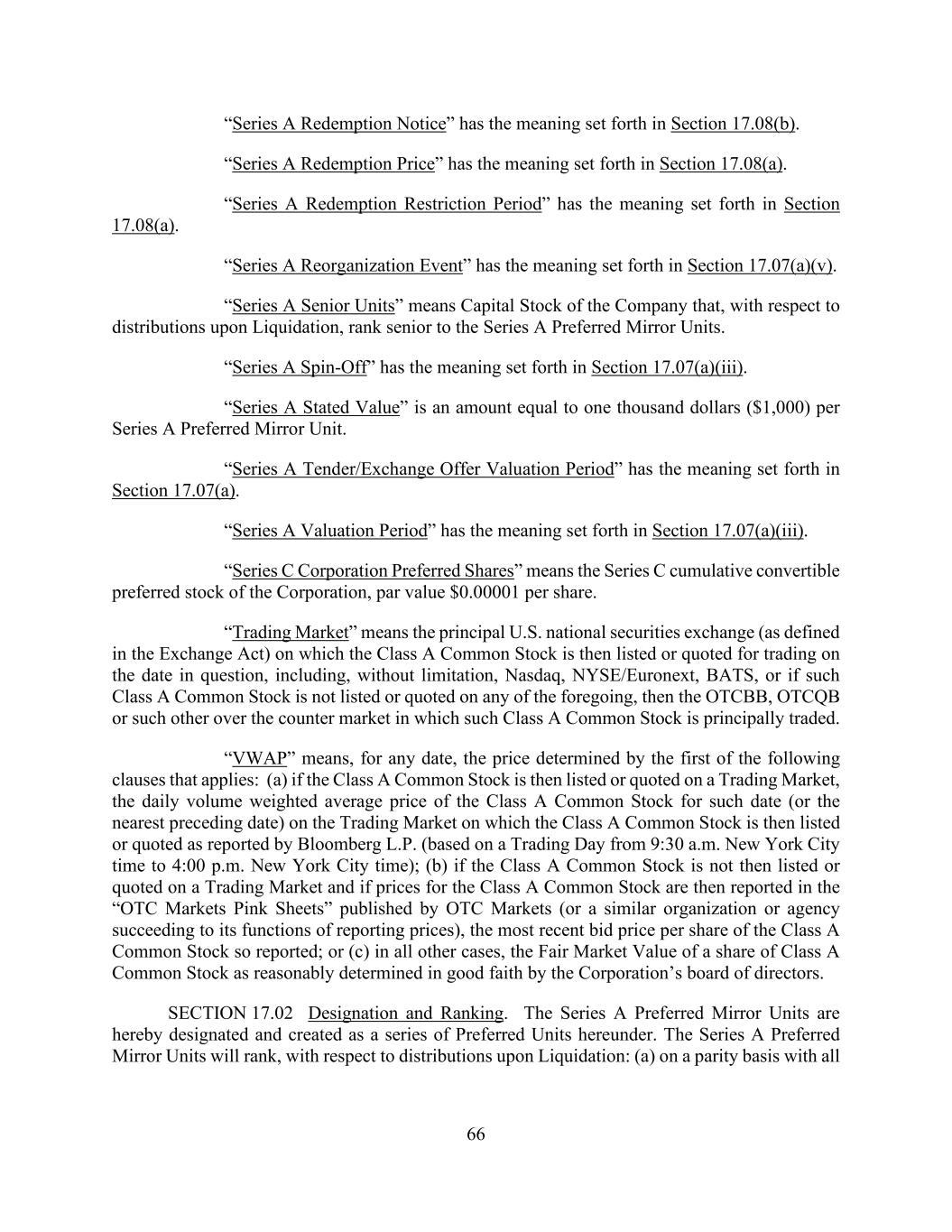 66 “Series A Redemption Notice” has the meaning set forth in Section 17.08(b). “Series A Redemption Price” has the meaning set forth in Section 17.08(a). “Series A Redemption Restriction Period” has the meaning set forth in Section 17.08(a). “Series A Reorganization Event” has the meaning set forth in Section 17.07(a)(v). “Series A Senior Units” means Capital Stock of the Company that, with respect to distributions upon Liquidation, rank senior to the Series A Preferred Mirror Units. “Series A Spin-Off” has the meaning set forth in Section 17.07(a)(iii). “Series A Stated Value” is an amount equal to one thousand dollars ($1,000) per Series A Preferred Mirror Unit. “Series A Tender/Exchange Offer Valuation Period” has the meaning set forth in Section 17.07(a). “Series A Valuation Period” has the meaning set forth in Section 17.07(a)(iii). “Series C Corporation Preferred Shares” means the Series C cumulative convertible preferred stock of the Corporation, par value $0.00001 per share. “Trading Market” means the principal U.S. national securities exchange (as defined in the Exchange Act) on which the Class A Common Stock is then listed or quoted for trading on the date in question, including, without limitation, Nasdaq, NYSE/Euronext, BATS, or if such Class A Common Stock is not listed or quoted on any of the foregoing, then the OTCBB, OTCQB or such other over the counter market in which such Class A Common Stock is principally traded. “VWAP” means, for any date, the price determined by the first of the following clauses that applies: (a) if the Class A Common Stock is then listed or quoted on a Trading Market, the daily volume weighted average price of the Class A Common Stock for such date (or the nearest preceding date) on the Trading Market on which the Class A Common Stock is then listed or quoted as reported by Bloomberg L.P. (based on a Trading Day from 9:30 a.m. New York City time to 4:00 p.m. New York City time); (b) if the Class A Common Stock is not then listed or quoted on a Trading Market and if prices for the Class A Common Stock are then reported in the “OTC Markets Pink Sheets” published by OTC Markets (or a similar organization or agency succeeding to its functions of reporting prices), the most recent bid price per share of the Class A Common Stock so reported; or (c) in all other cases, the Fair Market Value of a share of Class A Common Stock as reasonably determined in good faith by the Corporation’s board of directors. SECTION 17.02 Designation and Ranking. The Series A Preferred Mirror Units are hereby designated and created as a series of Preferred Units hereunder. The Series A Preferred Mirror Units will rank, with respect to distributions upon Liquidation: (a) on a parity basis with all