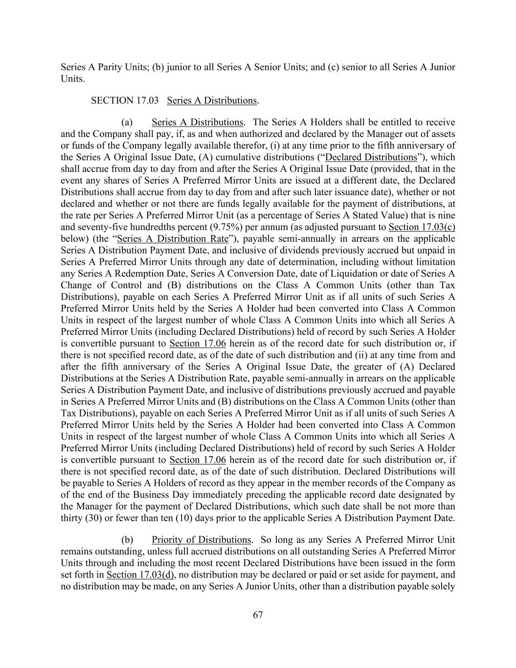 67 Series A Parity Units; (b) junior to all Series A Senior Units; and (c) senior to all Series A Junior Units. SECTION 17.03 Series A Distributions. (a) Series A Distributions. The Series A Holders shall be entitled to receive and the Company shall pay, if, as and when authorized and declared by the Manager out of assets or funds of the Company legally available therefor, (i) at any time prior to the fifth anniversary of the Series A Original Issue Date, (A) cumulative distributions (“Declared Distributions”), which shall accrue from day to day from and after the Series A Original Issue Date (provided, that in the event any shares of Series A Preferred Mirror Units are issued at a different date, the Declared Distributions shall accrue from day to day from and after such later issuance date), whether or not declared and whether or not there are funds legally available for the payment of distributions, at the rate per Series A Preferred Mirror Unit (as a percentage of Series A Stated Value) that is nine and seventy-five hundredths percent (9.75%) per annum (as adjusted pursuant to Section 17.03(c) below) (the “Series A Distribution Rate”), payable semi-annually in arrears on the applicable Series A Distribution Payment Date, and inclusive of dividends previously accrued but unpaid in Series A Preferred Mirror Units through any date of determination, including without limitation any Series A Redemption Date, Series A Conversion Date, date of Liquidation or date of Series A Change of Control and (B) distributions on the Class A Common Units (other than Tax Distributions), payable on each Series A Preferred Mirror Unit as if all units of such Series A Preferred Mirror Units held by the Series A Holder had been converted into Class A Common Units in respect of the largest number of whole Class A Common Units into which all Series A Preferred Mirror Units (including Declared Distributions) held of record by such Series A Holder is convertible pursuant to Section 17.06 herein as of the record date for such distribution or, if there is not specified record date, as of the date of such distribution and (ii) at any time from and after the fifth anniversary of the Series A Original Issue Date, the greater of (A) Declared Distributions at the Series A Distribution Rate, payable semi-annually in arrears on the applicable Series A Distribution Payment Date, and inclusive of distributions previously accrued and payable in Series A Preferred Mirror Units and (B) distributions on the Class A Common Units (other than Tax Distributions), payable on each Series A Preferred Mirror Unit as if all units of such Series A Preferred Mirror Units held by the Series A Holder had been converted into Class A Common Units in respect of the largest number of whole Class A Common Units into which all Series A Preferred Mirror Units (including Declared Distributions) held of record by such Series A Holder is convertible pursuant to Section 17.06 herein as of the record date for such distribution or, if there is not specified record date, as of the date of such distribution. Declared Distributions will be payable to Series A Holders of record as they appear in the member records of the Company as of the end of the Business Day immediately preceding the applicable record date designated by the Manager for the payment of Declared Distributions, which such date shall be not more than thirty (30) or fewer than ten (10) days prior to the applicable Series A Distribution Payment Date. (b) Priority of Distributions. So long as any Series A Preferred Mirror Unit remains outstanding, unless full accrued distributions on all outstanding Series A Preferred Mirror Units through and including the most recent Declared Distributions have been issued in the form set forth in Section 17.03(d), no distribution may be declared or paid or set aside for payment, and no distribution may be made, on any Series A Junior Units, other than a distribution payable solely