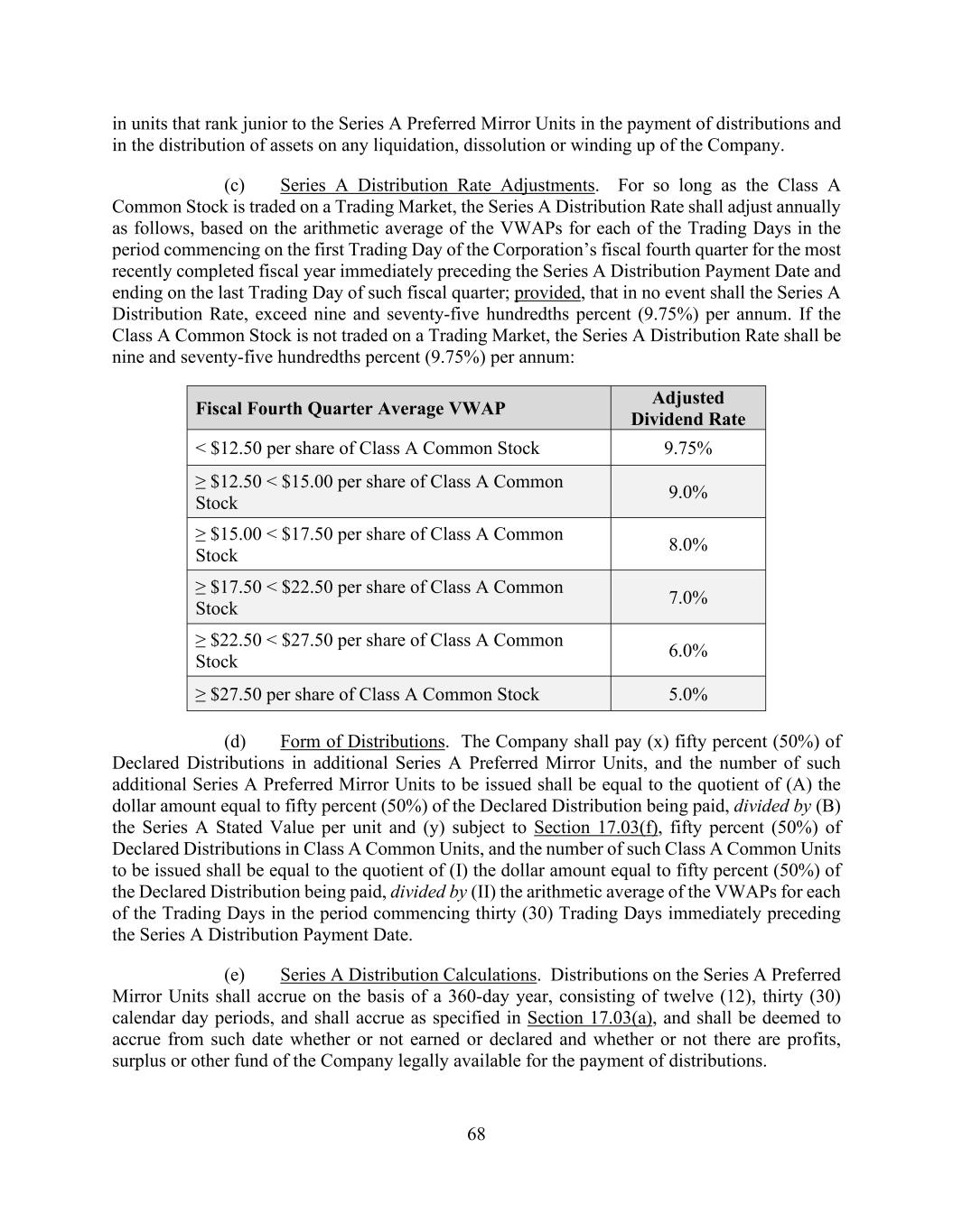 68 in units that rank junior to the Series A Preferred Mirror Units in the payment of distributions and in the distribution of assets on any liquidation, dissolution or winding up of the Company. (c) Series A Distribution Rate Adjustments. For so long as the Class A Common Stock is traded on a Trading Market, the Series A Distribution Rate shall adjust annually as follows, based on the arithmetic average of the VWAPs for each of the Trading Days in the period commencing on the first Trading Day of the Corporation’s fiscal fourth quarter for the most recently completed fiscal year immediately preceding the Series A Distribution Payment Date and ending on the last Trading Day of such fiscal quarter; provided, that in no event shall the Series A Distribution Rate, exceed nine and seventy-five hundredths percent (9.75%) per annum. If the Class A Common Stock is not traded on a Trading Market, the Series A Distribution Rate shall be nine and seventy-five hundredths percent (9.75%) per annum: Fiscal Fourth Quarter Average VWAP Adjusted Dividend Rate < $12.50 per share of Class A Common Stock 9.75% ≥ $12.50 < $15.00 per share of Class A Common Stock 9.0% ≥ $15.00 < $17.50 per share of Class A Common Stock 8.0% ≥ $17.50 < $22.50 per share of Class A Common Stock 7.0% ≥ $22.50 < $27.50 per share of Class A Common Stock 6.0% ≥ $27.50 per share of Class A Common Stock 5.0% (d) Form of Distributions. The Company shall pay (x) fifty percent (50%) of Declared Distributions in additional Series A Preferred Mirror Units, and the number of such additional Series A Preferred Mirror Units to be issued shall be equal to the quotient of (A) the dollar amount equal to fifty percent (50%) of the Declared Distribution being paid, divided by (B) the Series A Stated Value per unit and (y) subject to Section 17.03(f), fifty percent (50%) of Declared Distributions in Class A Common Units, and the number of such Class A Common Units to be issued shall be equal to the quotient of (I) the dollar amount equal to fifty percent (50%) of the Declared Distribution being paid, divided by (II) the arithmetic average of the VWAPs for each of the Trading Days in the period commencing thirty (30) Trading Days immediately preceding the Series A Distribution Payment Date. (e) Series A Distribution Calculations. Distributions on the Series A Preferred Mirror Units shall accrue on the basis of a 360-day year, consisting of twelve (12), thirty (30) calendar day periods, and shall accrue as specified in Section 17.03(a), and shall be deemed to accrue from such date whether or not earned or declared and whether or not there are profits, surplus or other fund of the Company legally available for the payment of distributions.