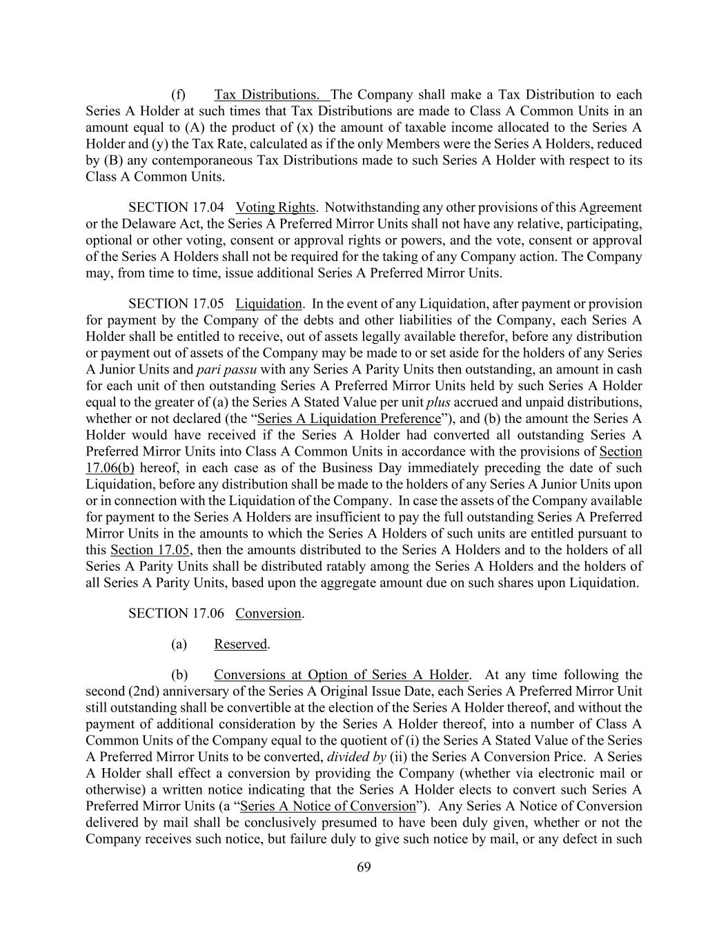 69 (f) Tax Distributions. The Company shall make a Tax Distribution to each Series A Holder at such times that Tax Distributions are made to Class A Common Units in an amount equal to (A) the product of (x) the amount of taxable income allocated to the Series A Holder and (y) the Tax Rate, calculated as if the only Members were the Series A Holders, reduced by (B) any contemporaneous Tax Distributions made to such Series A Holder with respect to its Class A Common Units. SECTION 17.04 Voting Rights. Notwithstanding any other provisions of this Agreement or the Delaware Act, the Series A Preferred Mirror Units shall not have any relative, participating, optional or other voting, consent or approval rights or powers, and the vote, consent or approval of the Series A Holders shall not be required for the taking of any Company action. The Company may, from time to time, issue additional Series A Preferred Mirror Units. SECTION 17.05 Liquidation. In the event of any Liquidation, after payment or provision for payment by the Company of the debts and other liabilities of the Company, each Series A Holder shall be entitled to receive, out of assets legally available therefor, before any distribution or payment out of assets of the Company may be made to or set aside for the holders of any Series A Junior Units and pari passu with any Series A Parity Units then outstanding, an amount in cash for each unit of then outstanding Series A Preferred Mirror Units held by such Series A Holder equal to the greater of (a) the Series A Stated Value per unit plus accrued and unpaid distributions, whether or not declared (the “Series A Liquidation Preference”), and (b) the amount the Series A Holder would have received if the Series A Holder had converted all outstanding Series A Preferred Mirror Units into Class A Common Units in accordance with the provisions of Section 17.06(b) hereof, in each case as of the Business Day immediately preceding the date of such Liquidation, before any distribution shall be made to the holders of any Series A Junior Units upon or in connection with the Liquidation of the Company. In case the assets of the Company available for payment to the Series A Holders are insufficient to pay the full outstanding Series A Preferred Mirror Units in the amounts to which the Series A Holders of such units are entitled pursuant to this Section 17.05, then the amounts distributed to the Series A Holders and to the holders of all Series A Parity Units shall be distributed ratably among the Series A Holders and the holders of all Series A Parity Units, based upon the aggregate amount due on such shares upon Liquidation. SECTION 17.06 Conversion. (a) Reserved. (b) Conversions at Option of Series A Holder. At any time following the second (2nd) anniversary of the Series A Original Issue Date, each Series A Preferred Mirror Unit still outstanding shall be convertible at the election of the Series A Holder thereof, and without the payment of additional consideration by the Series A Holder thereof, into a number of Class A Common Units of the Company equal to the quotient of (i) the Series A Stated Value of the Series A Preferred Mirror Units to be converted, divided by (ii) the Series A Conversion Price. A Series A Holder shall effect a conversion by providing the Company (whether via electronic mail or otherwise) a written notice indicating that the Series A Holder elects to convert such Series A Preferred Mirror Units (a “Series A Notice of Conversion”). Any Series A Notice of Conversion delivered by mail shall be conclusively presumed to have been duly given, whether or not the Company receives such notice, but failure duly to give such notice by mail, or any defect in such
