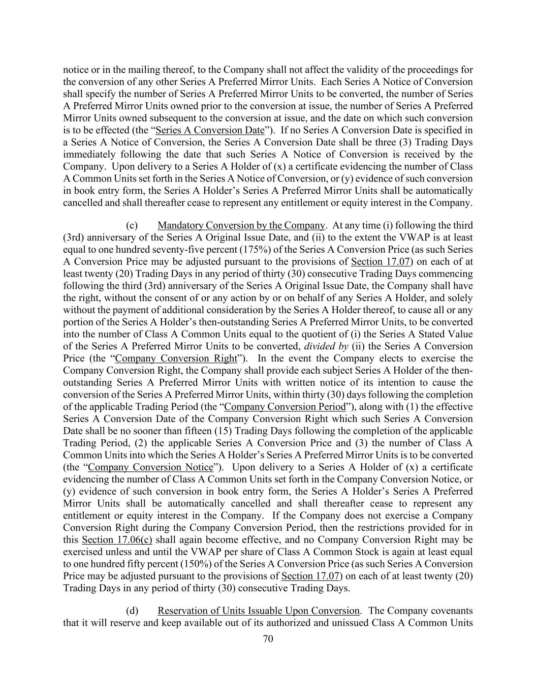 70 notice or in the mailing thereof, to the Company shall not affect the validity of the proceedings for the conversion of any other Series A Preferred Mirror Units. Each Series A Notice of Conversion shall specify the number of Series A Preferred Mirror Units to be converted, the number of Series A Preferred Mirror Units owned prior to the conversion at issue, the number of Series A Preferred Mirror Units owned subsequent to the conversion at issue, and the date on which such conversion is to be effected (the “Series A Conversion Date”). If no Series A Conversion Date is specified in a Series A Notice of Conversion, the Series A Conversion Date shall be three (3) Trading Days immediately following the date that such Series A Notice of Conversion is received by the Company. Upon delivery to a Series A Holder of (x) a certificate evidencing the number of Class A Common Units set forth in the Series A Notice of Conversion, or (y) evidence of such conversion in book entry form, the Series A Holder’s Series A Preferred Mirror Units shall be automatically cancelled and shall thereafter cease to represent any entitlement or equity interest in the Company. (c) Mandatory Conversion by the Company. At any time (i) following the third (3rd) anniversary of the Series A Original Issue Date, and (ii) to the extent the VWAP is at least equal to one hundred seventy-five percent (175%) of the Series A Conversion Price (as such Series A Conversion Price may be adjusted pursuant to the provisions of Section 17.07) on each of at least twenty (20) Trading Days in any period of thirty (30) consecutive Trading Days commencing following the third (3rd) anniversary of the Series A Original Issue Date, the Company shall have the right, without the consent of or any action by or on behalf of any Series A Holder, and solely without the payment of additional consideration by the Series A Holder thereof, to cause all or any portion of the Series A Holder’s then-outstanding Series A Preferred Mirror Units, to be converted into the number of Class A Common Units equal to the quotient of (i) the Series A Stated Value of the Series A Preferred Mirror Units to be converted, divided by (ii) the Series A Conversion Price (the “Company Conversion Right”). In the event the Company elects to exercise the Company Conversion Right, the Company shall provide each subject Series A Holder of the then- outstanding Series A Preferred Mirror Units with written notice of its intention to cause the conversion of the Series A Preferred Mirror Units, within thirty (30) days following the completion of the applicable Trading Period (the “Company Conversion Period”), along with (1) the effective Series A Conversion Date of the Company Conversion Right which such Series A Conversion Date shall be no sooner than fifteen (15) Trading Days following the completion of the applicable Trading Period, (2) the applicable Series A Conversion Price and (3) the number of Class A Common Units into which the Series A Holder’s Series A Preferred Mirror Units is to be converted (the “Company Conversion Notice”). Upon delivery to a Series A Holder of (x) a certificate evidencing the number of Class A Common Units set forth in the Company Conversion Notice, or (y) evidence of such conversion in book entry form, the Series A Holder’s Series A Preferred Mirror Units shall be automatically cancelled and shall thereafter cease to represent any entitlement or equity interest in the Company. If the Company does not exercise a Company Conversion Right during the Company Conversion Period, then the restrictions provided for in this Section 17.06(c) shall again become effective, and no Company Conversion Right may be exercised unless and until the VWAP per share of Class A Common Stock is again at least equal to one hundred fifty percent (150%) of the Series A Conversion Price (as such Series A Conversion Price may be adjusted pursuant to the provisions of Section 17.07) on each of at least twenty (20) Trading Days in any period of thirty (30) consecutive Trading Days. (d) Reservation of Units Issuable Upon Conversion. The Company covenants that it will reserve and keep available out of its authorized and unissued Class A Common Units