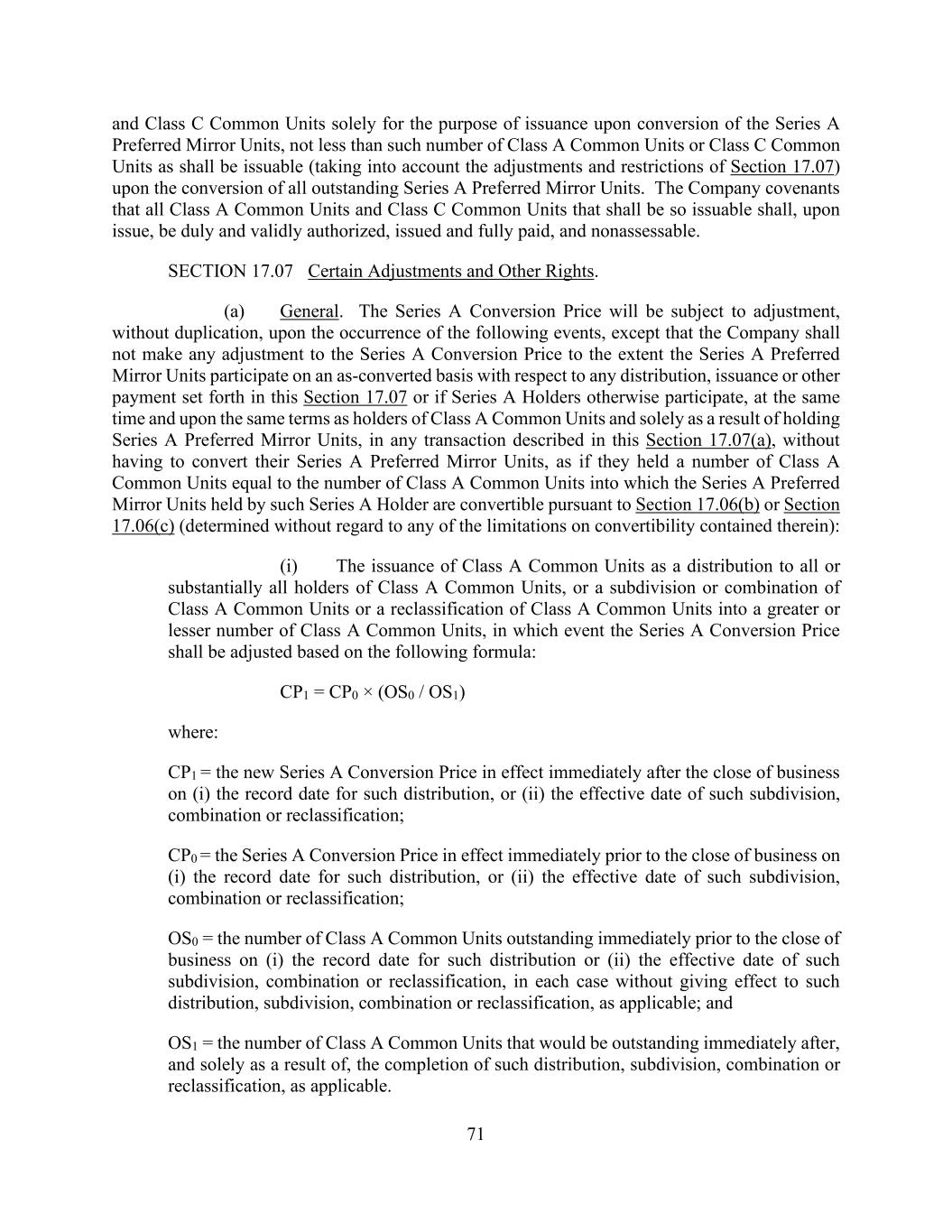 71 and Class C Common Units solely for the purpose of issuance upon conversion of the Series A Preferred Mirror Units, not less than such number of Class A Common Units or Class C Common Units as shall be issuable (taking into account the adjustments and restrictions of Section 17.07) upon the conversion of all outstanding Series A Preferred Mirror Units. The Company covenants that all Class A Common Units and Class C Common Units that shall be so issuable shall, upon issue, be duly and validly authorized, issued and fully paid, and nonassessable. SECTION 17.07 Certain Adjustments and Other Rights. (a) General. The Series A Conversion Price will be subject to adjustment, without duplication, upon the occurrence of the following events, except that the Company shall not make any adjustment to the Series A Conversion Price to the extent the Series A Preferred Mirror Units participate on an as-converted basis with respect to any distribution, issuance or other payment set forth in this Section 17.07 or if Series A Holders otherwise participate, at the same time and upon the same terms as holders of Class A Common Units and solely as a result of holding Series A Preferred Mirror Units, in any transaction described in this Section 17.07(a), without having to convert their Series A Preferred Mirror Units, as if they held a number of Class A Common Units equal to the number of Class A Common Units into which the Series A Preferred Mirror Units held by such Series A Holder are convertible pursuant to Section 17.06(b) or Section 17.06(c) (determined without regard to any of the limitations on convertibility contained therein): (i) The issuance of Class A Common Units as a distribution to all or substantially all holders of Class A Common Units, or a subdivision or combination of Class A Common Units or a reclassification of Class A Common Units into a greater or lesser number of Class A Common Units, in which event the Series A Conversion Price shall be adjusted based on the following formula: CP1 = CP0 × (OS0 / OS1) where: CP1 = the new Series A Conversion Price in effect immediately after the close of business on (i) the record date for such distribution, or (ii) the effective date of such subdivision, combination or reclassification; CP0 = the Series A Conversion Price in effect immediately prior to the close of business on (i) the record date for such distribution, or (ii) the effective date of such subdivision, combination or reclassification; OS0 = the number of Class A Common Units outstanding immediately prior to the close of business on (i) the record date for such distribution or (ii) the effective date of such subdivision, combination or reclassification, in each case without giving effect to such distribution, subdivision, combination or reclassification, as applicable; and OS1 = the number of Class A Common Units that would be outstanding immediately after, and solely as a result of, the completion of such distribution, subdivision, combination or reclassification, as applicable.
