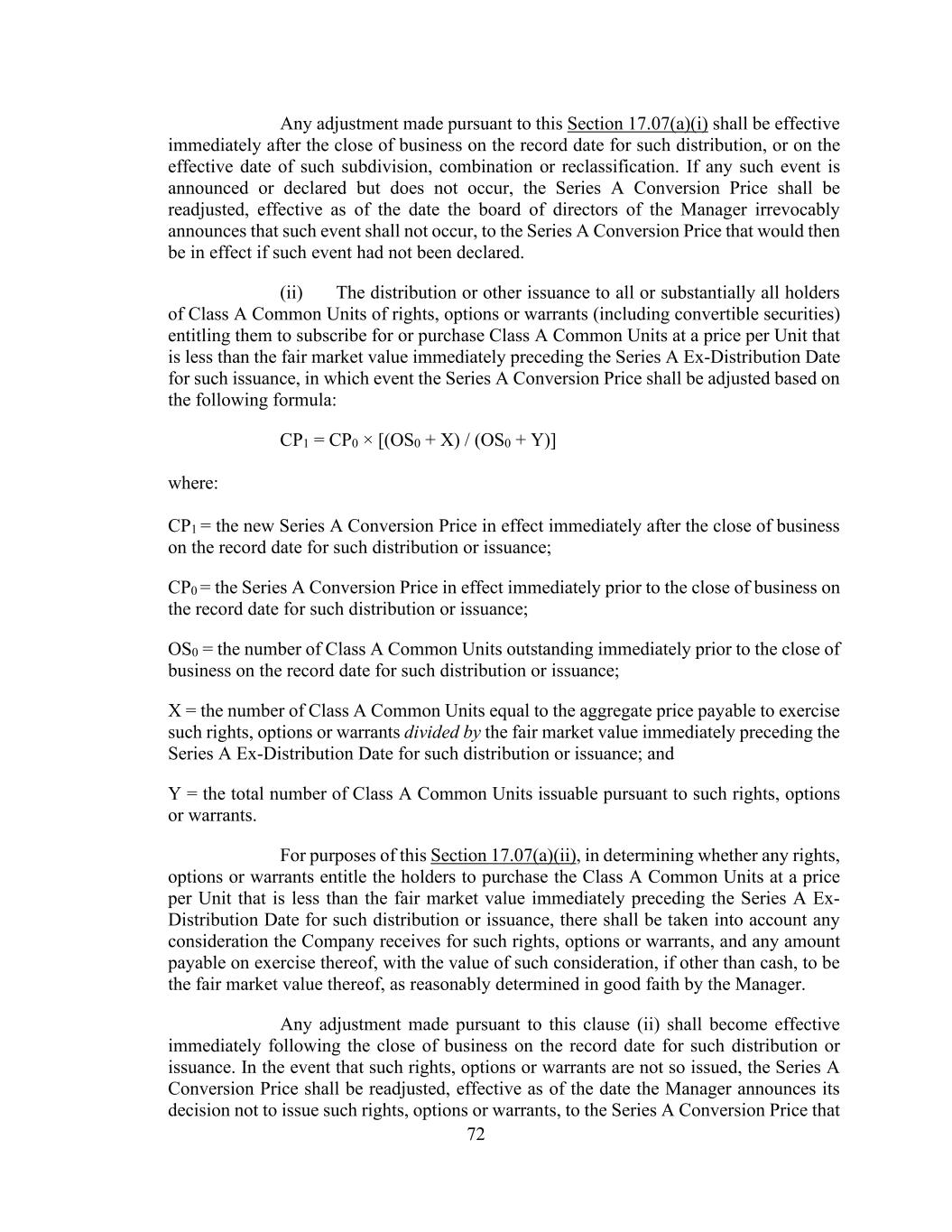72 Any adjustment made pursuant to this Section 17.07(a)(i) shall be effective immediately after the close of business on the record date for such distribution, or on the effective date of such subdivision, combination or reclassification. If any such event is announced or declared but does not occur, the Series A Conversion Price shall be readjusted, effective as of the date the board of directors of the Manager irrevocably announces that such event shall not occur, to the Series A Conversion Price that would then be in effect if such event had not been declared. (ii) The distribution or other issuance to all or substantially all holders of Class A Common Units of rights, options or warrants (including convertible securities) entitling them to subscribe for or purchase Class A Common Units at a price per Unit that is less than the fair market value immediately preceding the Series A Ex-Distribution Date for such issuance, in which event the Series A Conversion Price shall be adjusted based on the following formula: CP1 = CP0 × [(OS0 + X) / (OS0 + Y)] where: CP1 = the new Series A Conversion Price in effect immediately after the close of business on the record date for such distribution or issuance; CP0 = the Series A Conversion Price in effect immediately prior to the close of business on the record date for such distribution or issuance; OS0 = the number of Class A Common Units outstanding immediately prior to the close of business on the record date for such distribution or issuance; X = the number of Class A Common Units equal to the aggregate price payable to exercise such rights, options or warrants divided by the fair market value immediately preceding the Series A Ex-Distribution Date for such distribution or issuance; and Y = the total number of Class A Common Units issuable pursuant to such rights, options or warrants. For purposes of this Section 17.07(a)(ii), in determining whether any rights, options or warrants entitle the holders to purchase the Class A Common Units at a price per Unit that is less than the fair market value immediately preceding the Series A Ex- Distribution Date for such distribution or issuance, there shall be taken into account any consideration the Company receives for such rights, options or warrants, and any amount payable on exercise thereof, with the value of such consideration, if other than cash, to be the fair market value thereof, as reasonably determined in good faith by the Manager. Any adjustment made pursuant to this clause (ii) shall become effective immediately following the close of business on the record date for such distribution or issuance. In the event that such rights, options or warrants are not so issued, the Series A Conversion Price shall be readjusted, effective as of the date the Manager announces its decision not to issue such rights, options or warrants, to the Series A Conversion Price that