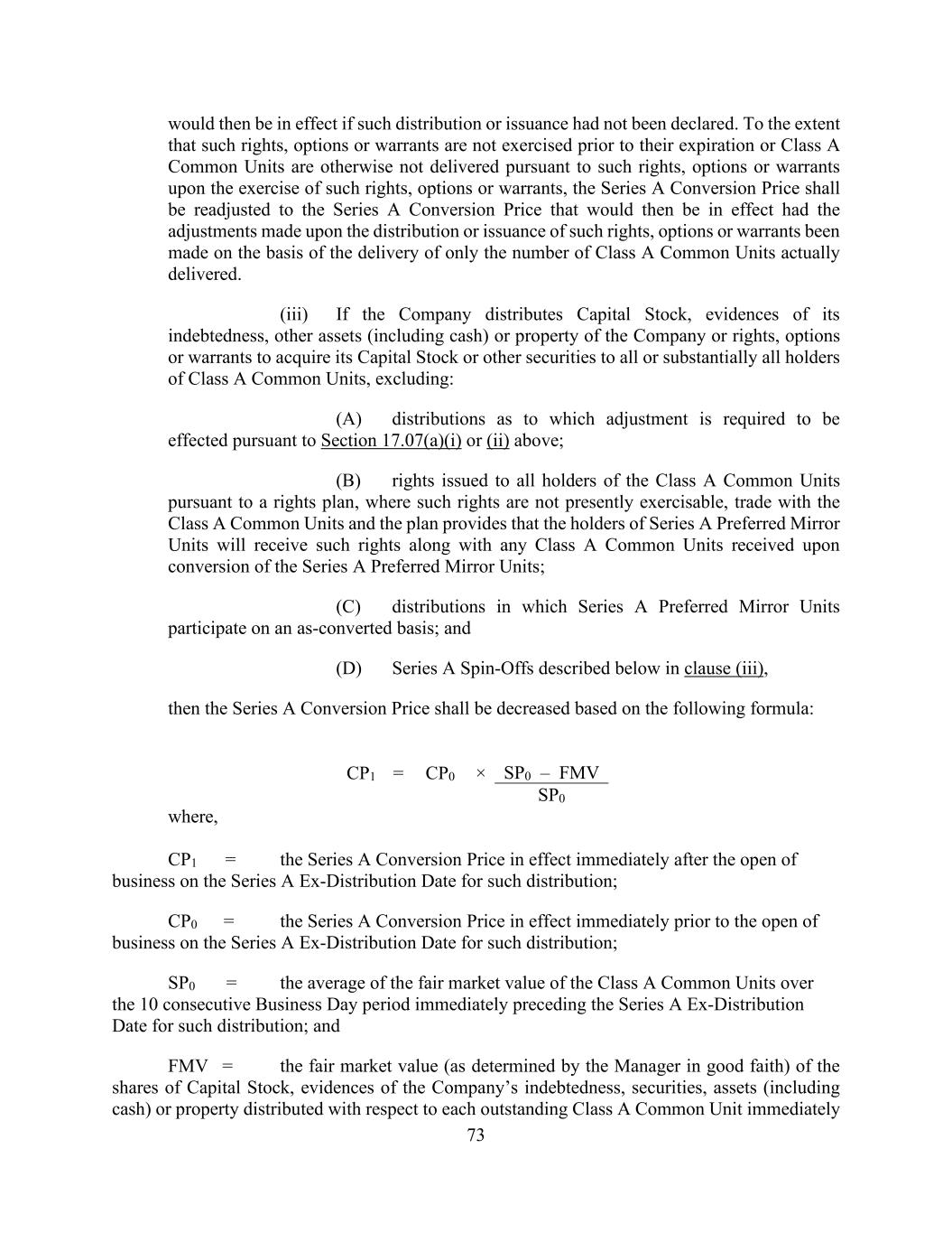 73 would then be in effect if such distribution or issuance had not been declared. To the extent that such rights, options or warrants are not exercised prior to their expiration or Class A Common Units are otherwise not delivered pursuant to such rights, options or warrants upon the exercise of such rights, options or warrants, the Series A Conversion Price shall be readjusted to the Series A Conversion Price that would then be in effect had the adjustments made upon the distribution or issuance of such rights, options or warrants been made on the basis of the delivery of only the number of Class A Common Units actually delivered. (iii) If the Company distributes Capital Stock, evidences of its indebtedness, other assets (including cash) or property of the Company or rights, options or warrants to acquire its Capital Stock or other securities to all or substantially all holders of Class A Common Units, excluding: (A) distributions as to which adjustment is required to be effected pursuant to Section 17.07(a)(i) or (ii) above; (B) rights issued to all holders of the Class A Common Units pursuant to a rights plan, where such rights are not presently exercisable, trade with the Class A Common Units and the plan provides that the holders of Series A Preferred Mirror Units will receive such rights along with any Class A Common Units received upon conversion of the Series A Preferred Mirror Units; (C) distributions in which Series A Preferred Mirror Units participate on an as-converted basis; and (D) Series A Spin-Offs described below in clause (iii), then the Series A Conversion Price shall be decreased based on the following formula: CP1 = CP0 × SP0 – FMV SP0 where, CP1 = the Series A Conversion Price in effect immediately after the open of business on the Series A Ex-Distribution Date for such distribution; CP0 = the Series A Conversion Price in effect immediately prior to the open of business on the Series A Ex-Distribution Date for such distribution; SP0 = the average of the fair market value of the Class A Common Units over the 10 consecutive Business Day period immediately preceding the Series A Ex-Distribution Date for such distribution; and FMV = the fair market value (as determined by the Manager in good faith) of the shares of Capital Stock, evidences of the Company’s indebtedness, securities, assets (including cash) or property distributed with respect to each outstanding Class A Common Unit immediately
