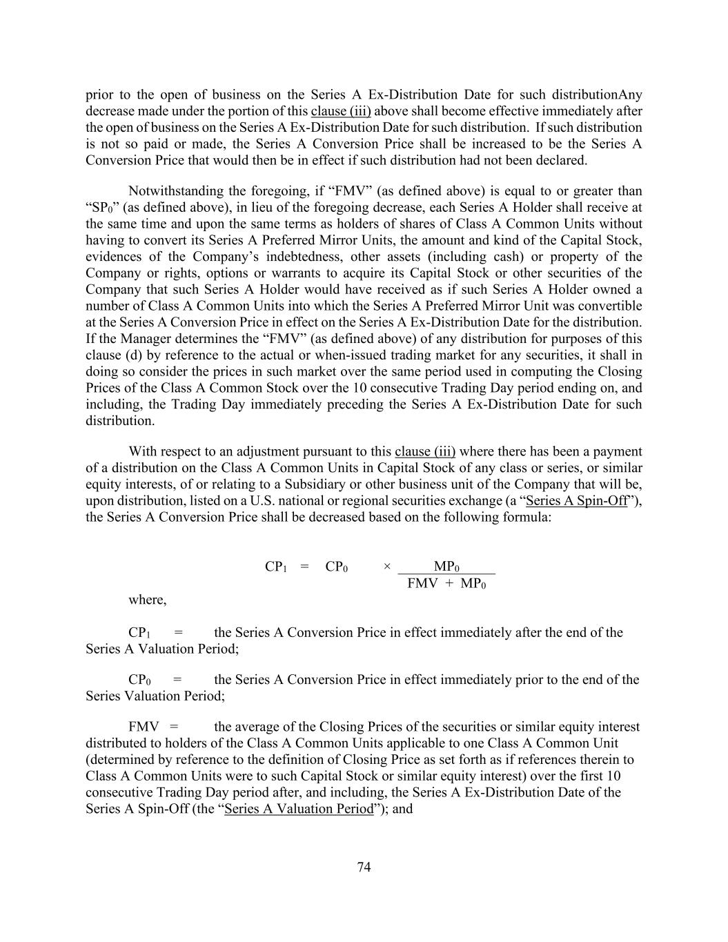 74 prior to the open of business on the Series A Ex-Distribution Date for such distributionAny decrease made under the portion of this clause (iii) above shall become effective immediately after the open of business on the Series A Ex-Distribution Date for such distribution. If such distribution is not so paid or made, the Series A Conversion Price shall be increased to be the Series A Conversion Price that would then be in effect if such distribution had not been declared. Notwithstanding the foregoing, if “FMV” (as defined above) is equal to or greater than “SP0” (as defined above), in lieu of the foregoing decrease, each Series A Holder shall receive at the same time and upon the same terms as holders of shares of Class A Common Units without having to convert its Series A Preferred Mirror Units, the amount and kind of the Capital Stock, evidences of the Company’s indebtedness, other assets (including cash) or property of the Company or rights, options or warrants to acquire its Capital Stock or other securities of the Company that such Series A Holder would have received as if such Series A Holder owned a number of Class A Common Units into which the Series A Preferred Mirror Unit was convertible at the Series A Conversion Price in effect on the Series A Ex-Distribution Date for the distribution. If the Manager determines the “FMV” (as defined above) of any distribution for purposes of this clause (d) by reference to the actual or when-issued trading market for any securities, it shall in doing so consider the prices in such market over the same period used in computing the Closing Prices of the Class A Common Stock over the 10 consecutive Trading Day period ending on, and including, the Trading Day immediately preceding the Series A Ex-Distribution Date for such distribution. With respect to an adjustment pursuant to this clause (iii) where there has been a payment of a distribution on the Class A Common Units in Capital Stock of any class or series, or similar equity interests, of or relating to a Subsidiary or other business unit of the Company that will be, upon distribution, listed on a U.S. national or regional securities exchange (a “Series A Spin-Off”), the Series A Conversion Price shall be decreased based on the following formula: CP1 = CP0 × MP0 FMV + MP0 where, CP1 = the Series A Conversion Price in effect immediately after the end of the Series A Valuation Period; CP0 = the Series A Conversion Price in effect immediately prior to the end of the Series Valuation Period; FMV = the average of the Closing Prices of the securities or similar equity interest distributed to holders of the Class A Common Units applicable to one Class A Common Unit (determined by reference to the definition of Closing Price as set forth as if references therein to Class A Common Units were to such Capital Stock or similar equity interest) over the first 10 consecutive Trading Day period after, and including, the Series A Ex-Distribution Date of the Series A Spin-Off (the “Series A Valuation Period”); and