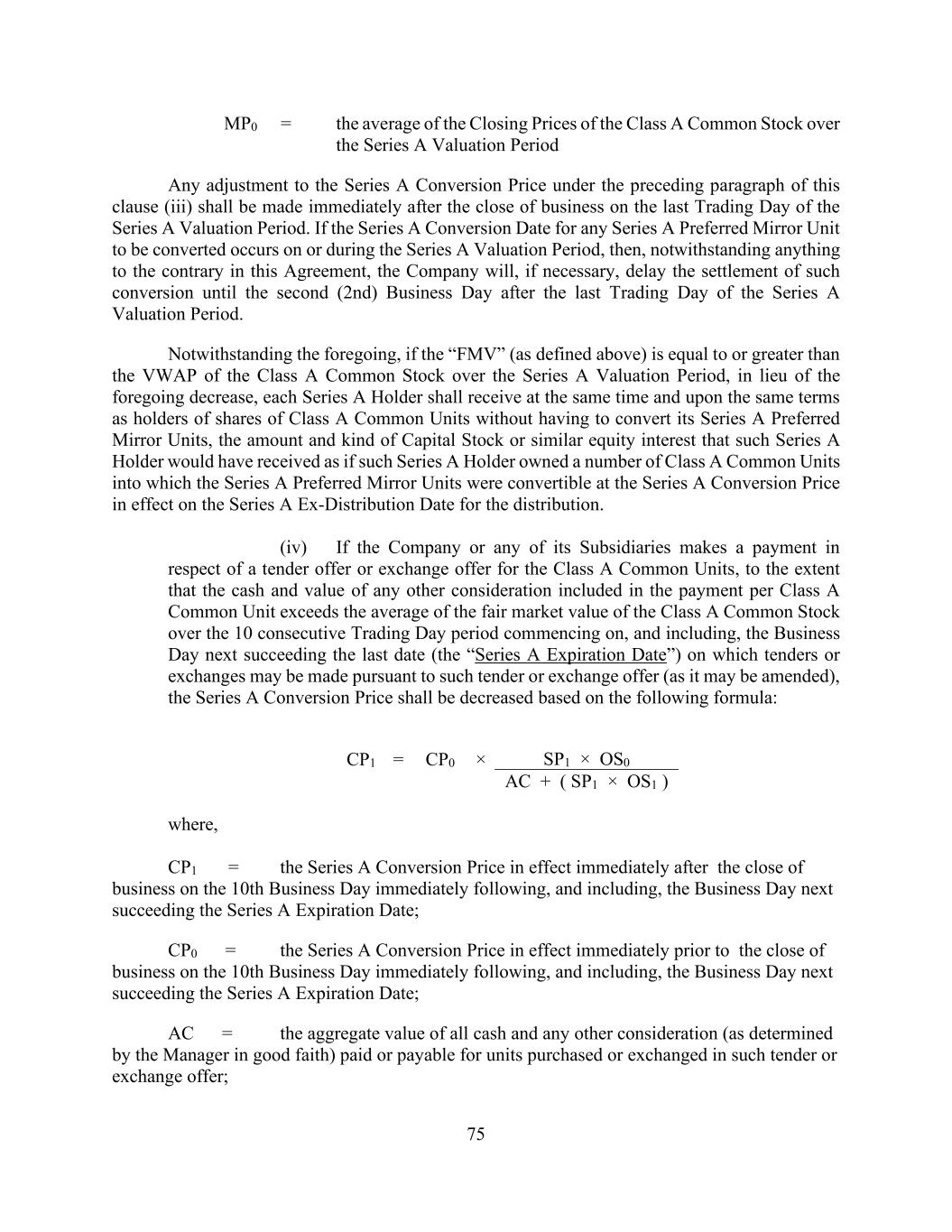 75 MP0 = the average of the Closing Prices of the Class A Common Stock over the Series A Valuation Period Any adjustment to the Series A Conversion Price under the preceding paragraph of this clause (iii) shall be made immediately after the close of business on the last Trading Day of the Series A Valuation Period. If the Series A Conversion Date for any Series A Preferred Mirror Unit to be converted occurs on or during the Series A Valuation Period, then, notwithstanding anything to the contrary in this Agreement, the Company will, if necessary, delay the settlement of such conversion until the second (2nd) Business Day after the last Trading Day of the Series A Valuation Period. Notwithstanding the foregoing, if the “FMV” (as defined above) is equal to or greater than the VWAP of the Class A Common Stock over the Series A Valuation Period, in lieu of the foregoing decrease, each Series A Holder shall receive at the same time and upon the same terms as holders of shares of Class A Common Units without having to convert its Series A Preferred Mirror Units, the amount and kind of Capital Stock or similar equity interest that such Series A Holder would have received as if such Series A Holder owned a number of Class A Common Units into which the Series A Preferred Mirror Units were convertible at the Series A Conversion Price in effect on the Series A Ex-Distribution Date for the distribution. (iv) If the Company or any of its Subsidiaries makes a payment in respect of a tender offer or exchange offer for the Class A Common Units, to the extent that the cash and value of any other consideration included in the payment per Class A Common Unit exceeds the average of the fair market value of the Class A Common Stock over the 10 consecutive Trading Day period commencing on, and including, the Business Day next succeeding the last date (the “Series A Expiration Date”) on which tenders or exchanges may be made pursuant to such tender or exchange offer (as it may be amended), the Series A Conversion Price shall be decreased based on the following formula: CP1 = CP0 × SP1 × OS0 AC + ( SP1 × OS1 ) where, CP1 = the Series A Conversion Price in effect immediately after the close of business on the 10th Business Day immediately following, and including, the Business Day next succeeding the Series A Expiration Date; CP0 = the Series A Conversion Price in effect immediately prior to the close of business on the 10th Business Day immediately following, and including, the Business Day next succeeding the Series A Expiration Date; AC = the aggregate value of all cash and any other consideration (as determined by the Manager in good faith) paid or payable for units purchased or exchanged in such tender or exchange offer;
