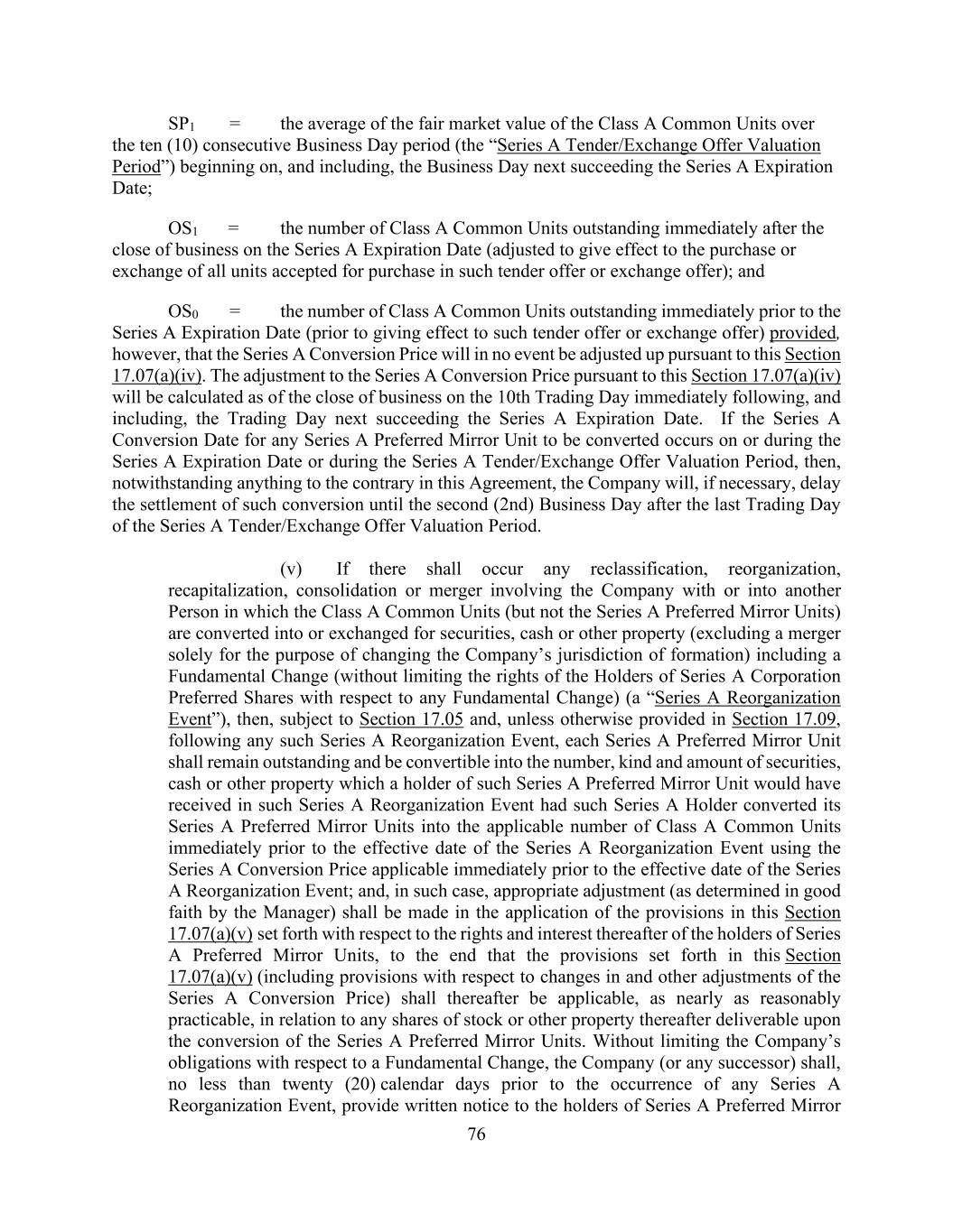 76 SP1 = the average of the fair market value of the Class A Common Units over the ten (10) consecutive Business Day period (the “Series A Tender/Exchange Offer Valuation Period”) beginning on, and including, the Business Day next succeeding the Series A Expiration Date; OS1 = the number of Class A Common Units outstanding immediately after the close of business on the Series A Expiration Date (adjusted to give effect to the purchase or exchange of all units accepted for purchase in such tender offer or exchange offer); and OS0 = the number of Class A Common Units outstanding immediately prior to the Series A Expiration Date (prior to giving effect to such tender offer or exchange offer) provided, however, that the Series A Conversion Price will in no event be adjusted up pursuant to this Section 17.07(a)(iv). The adjustment to the Series A Conversion Price pursuant to this Section 17.07(a)(iv) will be calculated as of the close of business on the 10th Trading Day immediately following, and including, the Trading Day next succeeding the Series A Expiration Date. If the Series A Conversion Date for any Series A Preferred Mirror Unit to be converted occurs on or during the Series A Expiration Date or during the Series A Tender/Exchange Offer Valuation Period, then, notwithstanding anything to the contrary in this Agreement, the Company will, if necessary, delay the settlement of such conversion until the second (2nd) Business Day after the last Trading Day of the Series A Tender/Exchange Offer Valuation Period. (v) If there shall occur any reclassification, reorganization, recapitalization, consolidation or merger involving the Company with or into another Person in which the Class A Common Units (but not the Series A Preferred Mirror Units) are converted into or exchanged for securities, cash or other property (excluding a merger solely for the purpose of changing the Company’s jurisdiction of formation) including a Fundamental Change (without limiting the rights of the Holders of Series A Corporation Preferred Shares with respect to any Fundamental Change) (a “Series A Reorganization Event”), then, subject to Section 17.05 and, unless otherwise provided in Section 17.09, following any such Series A Reorganization Event, each Series A Preferred Mirror Unit shall remain outstanding and be convertible into the number, kind and amount of securities, cash or other property which a holder of such Series A Preferred Mirror Unit would have received in such Series A Reorganization Event had such Series A Holder converted its Series A Preferred Mirror Units into the applicable number of Class A Common Units immediately prior to the effective date of the Series A Reorganization Event using the Series A Conversion Price applicable immediately prior to the effective date of the Series A Reorganization Event; and, in such case, appropriate adjustment (as determined in good faith by the Manager) shall be made in the application of the provisions in this Section 17.07(a)(v) set forth with respect to the rights and interest thereafter of the holders of Series A Preferred Mirror Units, to the end that the provisions set forth in this Section 17.07(a)(v) (including provisions with respect to changes in and other adjustments of the Series A Conversion Price) shall thereafter be applicable, as nearly as reasonably practicable, in relation to any shares of stock or other property thereafter deliverable upon the conversion of the Series A Preferred Mirror Units. Without limiting the Company’s obligations with respect to a Fundamental Change, the Company (or any successor) shall, no less than twenty (20) calendar days prior to the occurrence of any Series A Reorganization Event, provide written notice to the holders of Series A Preferred Mirror