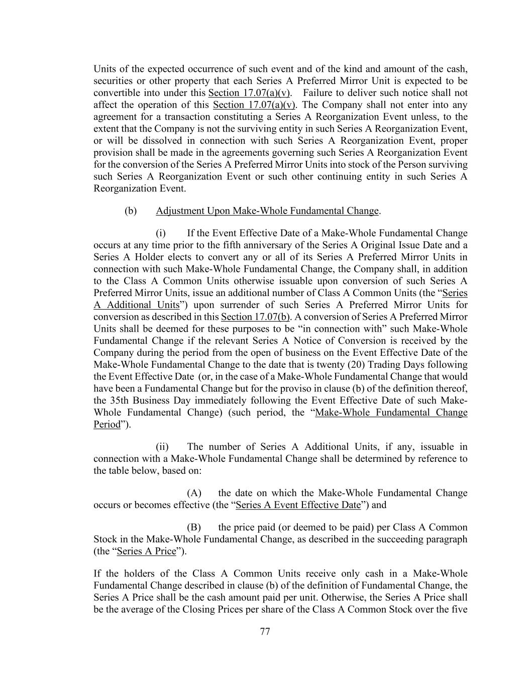 77 Units of the expected occurrence of such event and of the kind and amount of the cash, securities or other property that each Series A Preferred Mirror Unit is expected to be convertible into under this Section 17.07(a)(v). Failure to deliver such notice shall not affect the operation of this Section 17.07(a)(v). The Company shall not enter into any agreement for a transaction constituting a Series A Reorganization Event unless, to the extent that the Company is not the surviving entity in such Series A Reorganization Event, or will be dissolved in connection with such Series A Reorganization Event, proper provision shall be made in the agreements governing such Series A Reorganization Event for the conversion of the Series A Preferred Mirror Units into stock of the Person surviving such Series A Reorganization Event or such other continuing entity in such Series A Reorganization Event. (b) Adjustment Upon Make-Whole Fundamental Change. (i) If the Event Effective Date of a Make-Whole Fundamental Change occurs at any time prior to the fifth anniversary of the Series A Original Issue Date and a Series A Holder elects to convert any or all of its Series A Preferred Mirror Units in connection with such Make-Whole Fundamental Change, the Company shall, in addition to the Class A Common Units otherwise issuable upon conversion of such Series A Preferred Mirror Units, issue an additional number of Class A Common Units (the “Series A Additional Units”) upon surrender of such Series A Preferred Mirror Units for conversion as described in this Section 17.07(b). A conversion of Series A Preferred Mirror Units shall be deemed for these purposes to be “in connection with” such Make-Whole Fundamental Change if the relevant Series A Notice of Conversion is received by the Company during the period from the open of business on the Event Effective Date of the Make-Whole Fundamental Change to the date that is twenty (20) Trading Days following the Event Effective Date (or, in the case of a Make-Whole Fundamental Change that would have been a Fundamental Change but for the proviso in clause (b) of the definition thereof, the 35th Business Day immediately following the Event Effective Date of such Make- Whole Fundamental Change) (such period, the “Make-Whole Fundamental Change Period”). (ii) The number of Series A Additional Units, if any, issuable in connection with a Make-Whole Fundamental Change shall be determined by reference to the table below, based on: (A) the date on which the Make-Whole Fundamental Change occurs or becomes effective (the “Series A Event Effective Date”) and (B) the price paid (or deemed to be paid) per Class A Common Stock in the Make-Whole Fundamental Change, as described in the succeeding paragraph (the “Series A Price”). If the holders of the Class A Common Units receive only cash in a Make-Whole Fundamental Change described in clause (b) of the definition of Fundamental Change, the Series A Price shall be the cash amount paid per unit. Otherwise, the Series A Price shall be the average of the Closing Prices per share of the Class A Common Stock over the five
