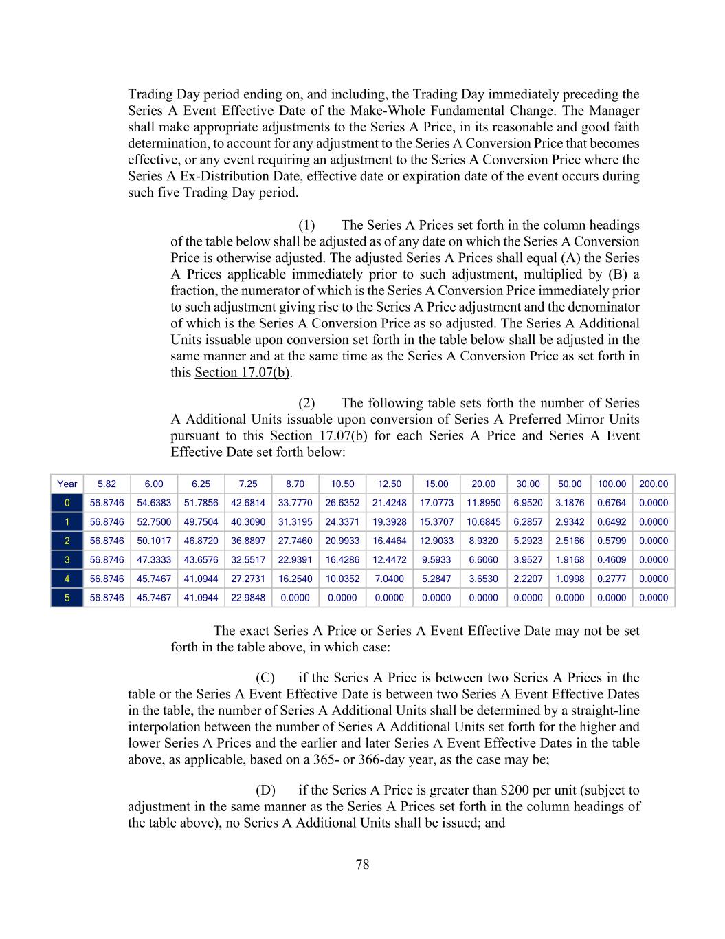 78 Trading Day period ending on, and including, the Trading Day immediately preceding the Series A Event Effective Date of the Make-Whole Fundamental Change. The Manager shall make appropriate adjustments to the Series A Price, in its reasonable and good faith determination, to account for any adjustment to the Series A Conversion Price that becomes effective, or any event requiring an adjustment to the Series A Conversion Price where the Series A Ex-Distribution Date, effective date or expiration date of the event occurs during such five Trading Day period. (1) The Series A Prices set forth in the column headings of the table below shall be adjusted as of any date on which the Series A Conversion Price is otherwise adjusted. The adjusted Series A Prices shall equal (A) the Series A Prices applicable immediately prior to such adjustment, multiplied by (B) a fraction, the numerator of which is the Series A Conversion Price immediately prior to such adjustment giving rise to the Series A Price adjustment and the denominator of which is the Series A Conversion Price as so adjusted. The Series A Additional Units issuable upon conversion set forth in the table below shall be adjusted in the same manner and at the same time as the Series A Conversion Price as set forth in this Section 17.07(b). (2) The following table sets forth the number of Series A Additional Units issuable upon conversion of Series A Preferred Mirror Units pursuant to this Section 17.07(b) for each Series A Price and Series A Event Effective Date set forth below: Year 5.82 6.00 6.25 7.25 8.70 10.50 12.50 15.00 20.00 30.00 50.00 100.00 200.00 0 56.8746 54.6383 51.7856 42.6814 33.7770 26.6352 21.4248 17.0773 11.8950 6.9520 3.1876 0.6764 0.0000 1 56.8746 52.7500 49.7504 40.3090 31.3195 24.3371 19.3928 15.3707 10.6845 6.2857 2.9342 0.6492 0.0000 2 56.8746 50.1017 46.8720 36.8897 27.7460 20.9933 16.4464 12.9033 8.9320 5.2923 2.5166 0.5799 0.0000 3 56.8746 47.3333 43.6576 32.5517 22.9391 16.4286 12.4472 9.5933 6.6060 3.9527 1.9168 0.4609 0.0000 4 56.8746 45.7467 41.0944 27.2731 16.2540 10.0352 7.0400 5.2847 3.6530 2.2207 1.0998 0.2777 0.0000 5 56.8746 45.7467 41.0944 22.9848 0.0000 0.0000 0.0000 0.0000 0.0000 0.0000 0.0000 0.0000 0.0000 The exact Series A Price or Series A Event Effective Date may not be set forth in the table above, in which case: (C) if the Series A Price is between two Series A Prices in the table or the Series A Event Effective Date is between two Series A Event Effective Dates in the table, the number of Series A Additional Units shall be determined by a straight-line interpolation between the number of Series A Additional Units set forth for the higher and lower Series A Prices and the earlier and later Series A Event Effective Dates in the table above, as applicable, based on a 365- or 366-day year, as the case may be; (D) if the Series A Price is greater than $200 per unit (subject to adjustment in the same manner as the Series A Prices set forth in the column headings of the table above), no Series A Additional Units shall be issued; and