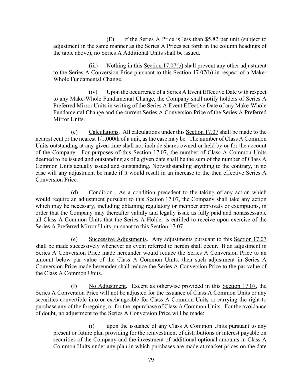 79 (E) if the Series A Price is less than $5.82 per unit (subject to adjustment in the same manner as the Series A Prices set forth in the column headings of the table above), no Series A Additional Units shall be issued. (iii) Nothing in this Section 17.07(b) shall prevent any other adjustment to the Series A Conversion Price pursuant to this Section 17.07(b) in respect of a Make- Whole Fundamental Change. (iv) Upon the occurrence of a Series A Event Effective Date with respect to any Make-Whole Fundamental Change, the Company shall notify holders of Series A Preferred Mirror Units in writing of the Series A Event Effective Date of any Make-Whole Fundamental Change and the current Series A Conversion Price of the Series A Preferred Mirror Units. (c) Calculations. All calculations under this Section 17.07 shall be made to the nearest cent or the nearest 1/1,000th of a unit, as the case may be. The number of Class A Common Units outstanding at any given time shall not include shares owned or held by or for the account of the Company. For purposes of this Section 17.07, the number of Class A Common Units deemed to be issued and outstanding as of a given date shall be the sum of the number of Class A Common Units actually issued and outstanding. Notwithstanding anything to the contrary, in no case will any adjustment be made if it would result in an increase to the then effective Series A Conversion Price. (d) Condition. As a condition precedent to the taking of any action which would require an adjustment pursuant to this Section 17.07, the Company shall take any action which may be necessary, including obtaining regulatory or member approvals or exemptions, in order that the Company may thereafter validly and legally issue as fully paid and nonassessable all Class A Common Units that the Series A Holder is entitled to receive upon exercise of the Series A Preferred Mirror Units pursuant to this Section 17.07. (e) Successive Adjustments. Any adjustments pursuant to this Section 17.07 shall be made successively whenever an event referred to herein shall occur. If an adjustment in Series A Conversion Price made hereunder would reduce the Series A Conversion Price to an amount below par value of the Class A Common Units, then such adjustment in Series A Conversion Price made hereunder shall reduce the Series A Conversion Price to the par value of the Class A Common Units. (f) No Adjustment. Except as otherwise provided in this Section 17.07, the Series A Conversion Price will not be adjusted for the issuance of Class A Common Units or any securities convertible into or exchangeable for Class A Common Units or carrying the right to purchase any of the foregoing, or for the repurchase of Class A Common Units. For the avoidance of doubt, no adjustment to the Series A Conversion Price will be made: (i) upon the issuance of any Class A Common Units pursuant to any present or future plan providing for the reinvestment of distributions or interest payable on securities of the Company and the investment of additional optional amounts in Class A Common Units under any plan in which purchases are made at market prices on the date
