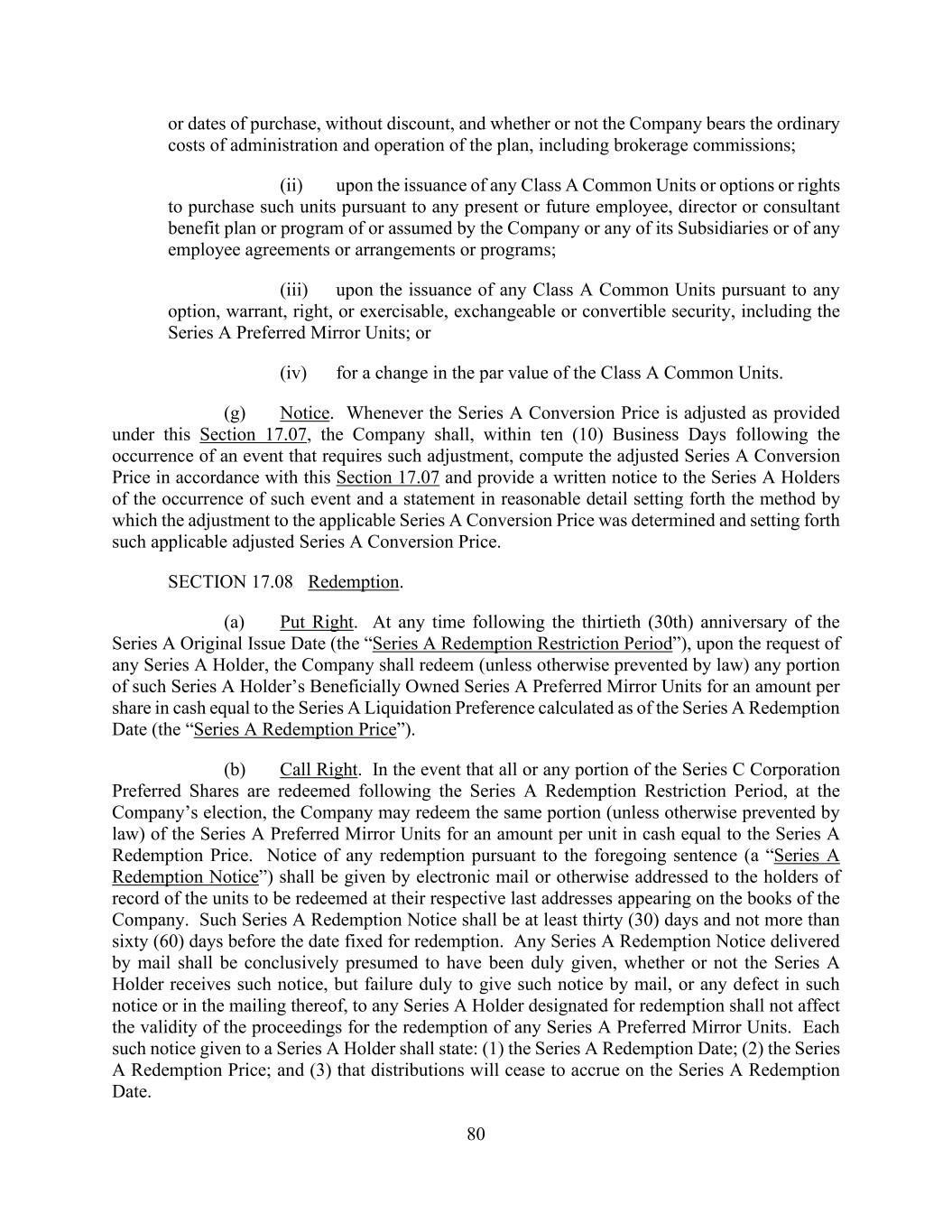 80 or dates of purchase, without discount, and whether or not the Company bears the ordinary costs of administration and operation of the plan, including brokerage commissions; (ii) upon the issuance of any Class A Common Units or options or rights to purchase such units pursuant to any present or future employee, director or consultant benefit plan or program of or assumed by the Company or any of its Subsidiaries or of any employee agreements or arrangements or programs; (iii) upon the issuance of any Class A Common Units pursuant to any option, warrant, right, or exercisable, exchangeable or convertible security, including the Series A Preferred Mirror Units; or (iv) for a change in the par value of the Class A Common Units. (g) Notice. Whenever the Series A Conversion Price is adjusted as provided under this Section 17.07, the Company shall, within ten (10) Business Days following the occurrence of an event that requires such adjustment, compute the adjusted Series A Conversion Price in accordance with this Section 17.07 and provide a written notice to the Series A Holders of the occurrence of such event and a statement in reasonable detail setting forth the method by which the adjustment to the applicable Series A Conversion Price was determined and setting forth such applicable adjusted Series A Conversion Price. SECTION 17.08 Redemption. (a) Put Right. At any time following the thirtieth (30th) anniversary of the Series A Original Issue Date (the “Series A Redemption Restriction Period”), upon the request of any Series A Holder, the Company shall redeem (unless otherwise prevented by law) any portion of such Series A Holder’s Beneficially Owned Series A Preferred Mirror Units for an amount per share in cash equal to the Series A Liquidation Preference calculated as of the Series A Redemption Date (the “Series A Redemption Price”). (b) Call Right. In the event that all or any portion of the Series C Corporation Preferred Shares are redeemed following the Series A Redemption Restriction Period, at the Company’s election, the Company may redeem the same portion (unless otherwise prevented by law) of the Series A Preferred Mirror Units for an amount per unit in cash equal to the Series A Redemption Price. Notice of any redemption pursuant to the foregoing sentence (a “Series A Redemption Notice”) shall be given by electronic mail or otherwise addressed to the holders of record of the units to be redeemed at their respective last addresses appearing on the books of the Company. Such Series A Redemption Notice shall be at least thirty (30) days and not more than sixty (60) days before the date fixed for redemption. Any Series A Redemption Notice delivered by mail shall be conclusively presumed to have been duly given, whether or not the Series A Holder receives such notice, but failure duly to give such notice by mail, or any defect in such notice or in the mailing thereof, to any Series A Holder designated for redemption shall not affect the validity of the proceedings for the redemption of any Series A Preferred Mirror Units. Each such notice given to a Series A Holder shall state: (1) the Series A Redemption Date; (2) the Series A Redemption Price; and (3) that distributions will cease to accrue on the Series A Redemption Date.