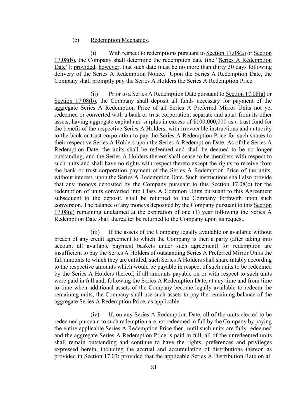 81 (c) Redemption Mechanics. (i) With respect to redemptions pursuant to Section 17.08(a) or Section 17.08(b), the Company shall determine the redemption date (the “Series A Redemption Date”); provided, however, that such date must be no more than thirty 30 days following delivery of the Series A Redemption Notice. Upon the Series A Redemption Date, the Company shall promptly pay the Series A Holders the Series A Redemption Price. (ii) Prior to a Series A Redemption Date pursuant to Section 17.08(a) or Section 17.08(b), the Company shall deposit all funds necessary for payment of the aggregate Series A Redemption Price of all Series A Preferred Mirror Units not yet redeemed or converted with a bank or trust corporation, separate and apart from its other assets, having aggregate capital and surplus in excess of $100,000,000 as a trust fund for the benefit of the respective Series A Holders, with irrevocable instructions and authority to the bank or trust corporation to pay the Series A Redemption Price for such shares to their respective Series A Holders upon the Series A Redemption Date. As of the Series A Redemption Date, the units shall be redeemed and shall be deemed to be no longer outstanding, and the Series A Holders thereof shall cease to be members with respect to such units and shall have no rights with respect thereto except the rights to receive from the bank or trust corporation payment of the Series A Redemption Price of the units, without interest, upon the Series A Redemption Date. Such instructions shall also provide that any moneys deposited by the Company pursuant to this Section 17.08(c) for the redemption of units converted into Class A Common Units pursuant to this Agreement subsequent to the deposit, shall be returned to the Company forthwith upon such conversion. The balance of any moneys deposited by the Company pursuant to this Section 17.08(c) remaining unclaimed at the expiration of one (1) year following the Series A Redemption Date shall thereafter be returned to the Company upon its request. (iii) If the assets of the Company legally available or available without breach of any credit agreement to which the Company is then a party (after taking into account all available payment baskets under such agreement) for redemption are insufficient to pay the Series A Holders of outstanding Series A Preferred Mirror Units the full amounts to which they are entitled, such Series A Holders shall share ratably according to the respective amounts which would be payable in respect of such units to be redeemed by the Series A Holders thereof, if all amounts payable on or with respect to such units were paid in full and, following the Series A Redemption Date, at any time and from time to time when additional assets of the Company become legally available to redeem the remaining units, the Company shall use such assets to pay the remaining balance of the aggregate Series A Redemption Price, as applicable. (iv) If, on any Series A Redemption Date, all of the units elected to be redeemed pursuant to such redemption are not redeemed in full by the Company by paying the entire applicable Series A Redemption Price then, until such units are fully redeemed and the aggregate Series A Redemption Price is paid in full, all of the unredeemed units shall remain outstanding and continue to have the rights, preferences and privileges expressed herein, including the accrual and accumulation of distributions thereon as provided in Section 17.03; provided that the applicable Series A Distribution Rate on all