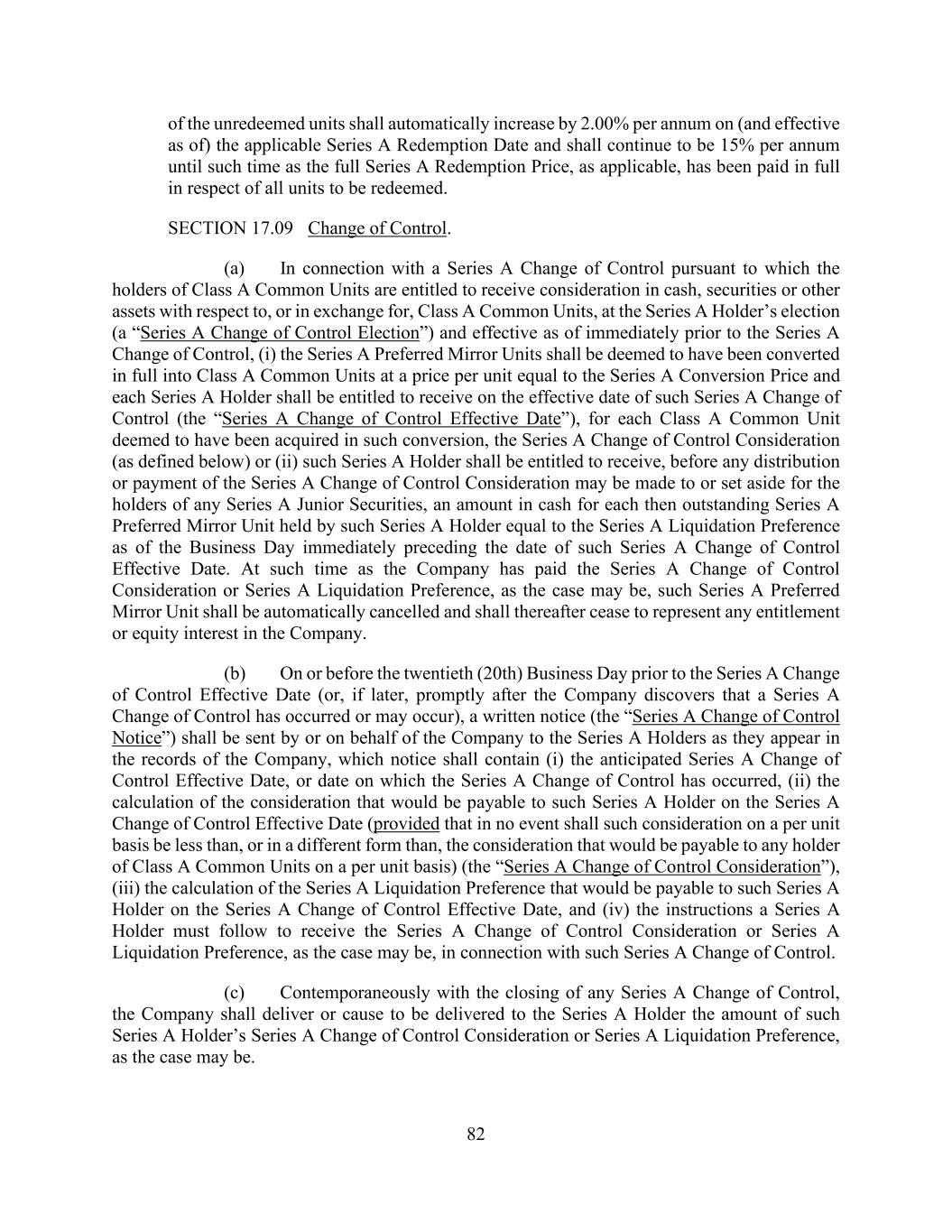 82 of the unredeemed units shall automatically increase by 2.00% per annum on (and effective as of) the applicable Series A Redemption Date and shall continue to be 15% per annum until such time as the full Series A Redemption Price, as applicable, has been paid in full in respect of all units to be redeemed. SECTION 17.09 Change of Control. (a) In connection with a Series A Change of Control pursuant to which the holders of Class A Common Units are entitled to receive consideration in cash, securities or other assets with respect to, or in exchange for, Class A Common Units, at the Series A Holder’s election (a “Series A Change of Control Election”) and effective as of immediately prior to the Series A Change of Control, (i) the Series A Preferred Mirror Units shall be deemed to have been converted in full into Class A Common Units at a price per unit equal to the Series A Conversion Price and each Series A Holder shall be entitled to receive on the effective date of such Series A Change of Control (the “Series A Change of Control Effective Date”), for each Class A Common Unit deemed to have been acquired in such conversion, the Series A Change of Control Consideration (as defined below) or (ii) such Series A Holder shall be entitled to receive, before any distribution or payment of the Series A Change of Control Consideration may be made to or set aside for the holders of any Series A Junior Securities, an amount in cash for each then outstanding Series A Preferred Mirror Unit held by such Series A Holder equal to the Series A Liquidation Preference as of the Business Day immediately preceding the date of such Series A Change of Control Effective Date. At such time as the Company has paid the Series A Change of Control Consideration or Series A Liquidation Preference, as the case may be, such Series A Preferred Mirror Unit shall be automatically cancelled and shall thereafter cease to represent any entitlement or equity interest in the Company. (b) On or before the twentieth (20th) Business Day prior to the Series A Change of Control Effective Date (or, if later, promptly after the Company discovers that a Series A Change of Control has occurred or may occur), a written notice (the “Series A Change of Control Notice”) shall be sent by or on behalf of the Company to the Series A Holders as they appear in the records of the Company, which notice shall contain (i) the anticipated Series A Change of Control Effective Date, or date on which the Series A Change of Control has occurred, (ii) the calculation of the consideration that would be payable to such Series A Holder on the Series A Change of Control Effective Date (provided that in no event shall such consideration on a per unit basis be less than, or in a different form than, the consideration that would be payable to any holder of Class A Common Units on a per unit basis) (the “Series A Change of Control Consideration”), (iii) the calculation of the Series A Liquidation Preference that would be payable to such Series A Holder on the Series A Change of Control Effective Date, and (iv) the instructions a Series A Holder must follow to receive the Series A Change of Control Consideration or Series A Liquidation Preference, as the case may be, in connection with such Series A Change of Control. (c) Contemporaneously with the closing of any Series A Change of Control, the Company shall deliver or cause to be delivered to the Series A Holder the amount of such Series A Holder’s Series A Change of Control Consideration or Series A Liquidation Preference, as the case may be.