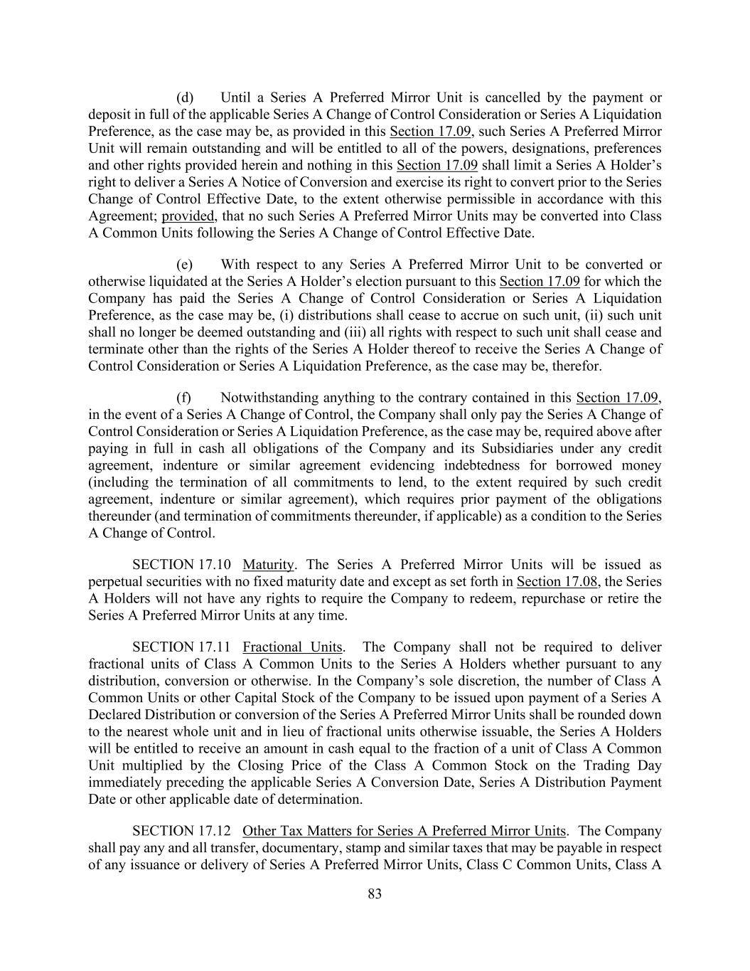 83 (d) Until a Series A Preferred Mirror Unit is cancelled by the payment or deposit in full of the applicable Series A Change of Control Consideration or Series A Liquidation Preference, as the case may be, as provided in this Section 17.09, such Series A Preferred Mirror Unit will remain outstanding and will be entitled to all of the powers, designations, preferences and other rights provided herein and nothing in this Section 17.09 shall limit a Series A Holder’s right to deliver a Series A Notice of Conversion and exercise its right to convert prior to the Series Change of Control Effective Date, to the extent otherwise permissible in accordance with this Agreement; provided, that no such Series A Preferred Mirror Units may be converted into Class A Common Units following the Series A Change of Control Effective Date. (e) With respect to any Series A Preferred Mirror Unit to be converted or otherwise liquidated at the Series A Holder’s election pursuant to this Section 17.09 for which the Company has paid the Series A Change of Control Consideration or Series A Liquidation Preference, as the case may be, (i) distributions shall cease to accrue on such unit, (ii) such unit shall no longer be deemed outstanding and (iii) all rights with respect to such unit shall cease and terminate other than the rights of the Series A Holder thereof to receive the Series A Change of Control Consideration or Series A Liquidation Preference, as the case may be, therefor. (f) Notwithstanding anything to the contrary contained in this Section 17.09, in the event of a Series A Change of Control, the Company shall only pay the Series A Change of Control Consideration or Series A Liquidation Preference, as the case may be, required above after paying in full in cash all obligations of the Company and its Subsidiaries under any credit agreement, indenture or similar agreement evidencing indebtedness for borrowed money (including the termination of all commitments to lend, to the extent required by such credit agreement, indenture or similar agreement), which requires prior payment of the obligations thereunder (and termination of commitments thereunder, if applicable) as a condition to the Series A Change of Control. SECTION 17.10 Maturity. The Series A Preferred Mirror Units will be issued as perpetual securities with no fixed maturity date and except as set forth in Section 17.08, the Series A Holders will not have any rights to require the Company to redeem, repurchase or retire the Series A Preferred Mirror Units at any time. SECTION 17.11 Fractional Units. The Company shall not be required to deliver fractional units of Class A Common Units to the Series A Holders whether pursuant to any distribution, conversion or otherwise. In the Company’s sole discretion, the number of Class A Common Units or other Capital Stock of the Company to be issued upon payment of a Series A Declared Distribution or conversion of the Series A Preferred Mirror Units shall be rounded down to the nearest whole unit and in lieu of fractional units otherwise issuable, the Series A Holders will be entitled to receive an amount in cash equal to the fraction of a unit of Class A Common Unit multiplied by the Closing Price of the Class A Common Stock on the Trading Day immediately preceding the applicable Series A Conversion Date, Series A Distribution Payment Date or other applicable date of determination. SECTION 17.12 Other Tax Matters for Series A Preferred Mirror Units. The Company shall pay any and all transfer, documentary, stamp and similar taxes that may be payable in respect of any issuance or delivery of Series A Preferred Mirror Units, Class C Common Units, Class A