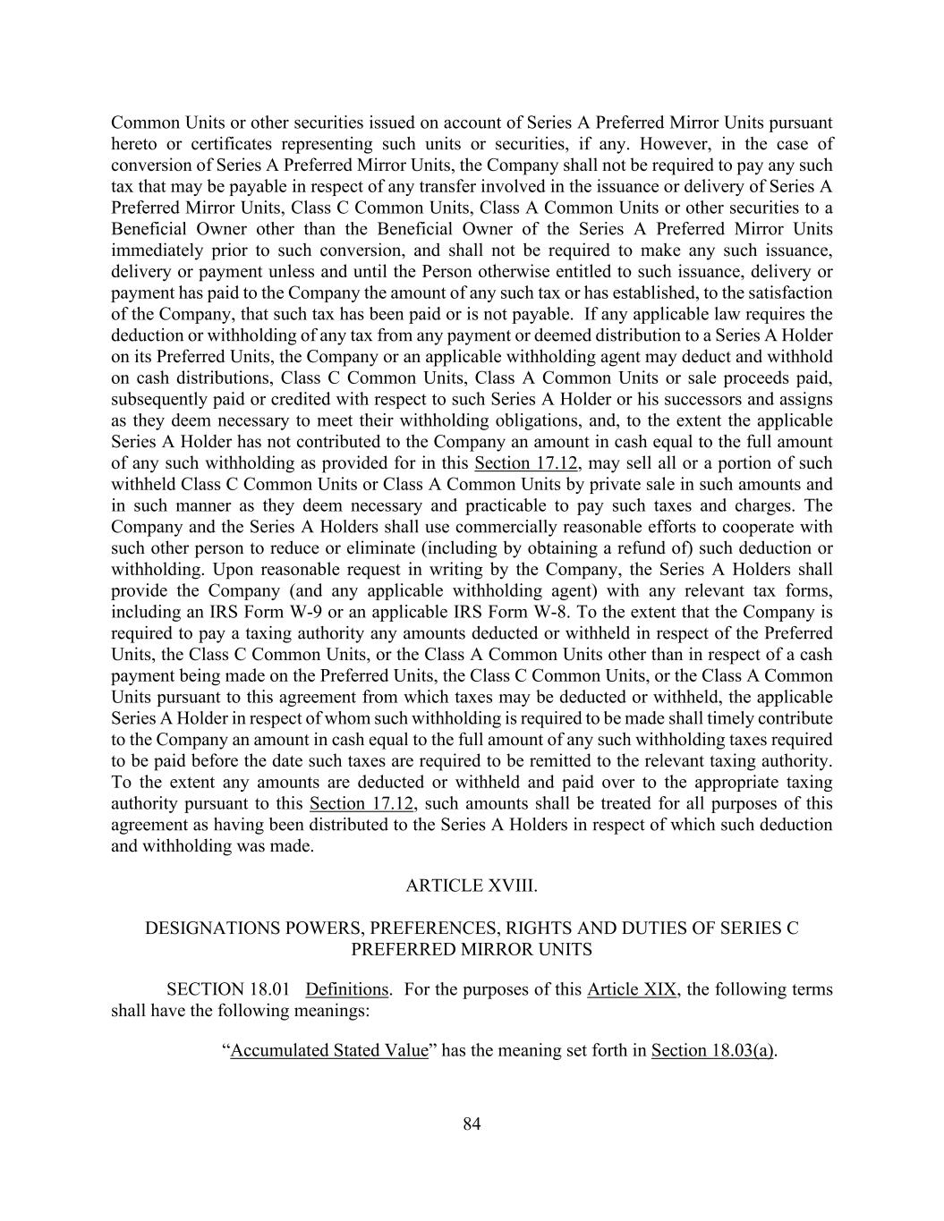 84 Common Units or other securities issued on account of Series A Preferred Mirror Units pursuant hereto or certificates representing such units or securities, if any. However, in the case of conversion of Series A Preferred Mirror Units, the Company shall not be required to pay any such tax that may be payable in respect of any transfer involved in the issuance or delivery of Series A Preferred Mirror Units, Class C Common Units, Class A Common Units or other securities to a Beneficial Owner other than the Beneficial Owner of the Series A Preferred Mirror Units immediately prior to such conversion, and shall not be required to make any such issuance, delivery or payment unless and until the Person otherwise entitled to such issuance, delivery or payment has paid to the Company the amount of any such tax or has established, to the satisfaction of the Company, that such tax has been paid or is not payable. If any applicable law requires the deduction or withholding of any tax from any payment or deemed distribution to a Series A Holder on its Preferred Units, the Company or an applicable withholding agent may deduct and withhold on cash distributions, Class C Common Units, Class A Common Units or sale proceeds paid, subsequently paid or credited with respect to such Series A Holder or his successors and assigns as they deem necessary to meet their withholding obligations, and, to the extent the applicable Series A Holder has not contributed to the Company an amount in cash equal to the full amount of any such withholding as provided for in this Section 17.12, may sell all or a portion of such withheld Class C Common Units or Class A Common Units by private sale in such amounts and in such manner as they deem necessary and practicable to pay such taxes and charges. The Company and the Series A Holders shall use commercially reasonable efforts to cooperate with such other person to reduce or eliminate (including by obtaining a refund of) such deduction or withholding. Upon reasonable request in writing by the Company, the Series A Holders shall provide the Company (and any applicable withholding agent) with any relevant tax forms, including an IRS Form W-9 or an applicable IRS Form W-8. To the extent that the Company is required to pay a taxing authority any amounts deducted or withheld in respect of the Preferred Units, the Class C Common Units, or the Class A Common Units other than in respect of a cash payment being made on the Preferred Units, the Class C Common Units, or the Class A Common Units pursuant to this agreement from which taxes may be deducted or withheld, the applicable Series A Holder in respect of whom such withholding is required to be made shall timely contribute to the Company an amount in cash equal to the full amount of any such withholding taxes required to be paid before the date such taxes are required to be remitted to the relevant taxing authority. To the extent any amounts are deducted or withheld and paid over to the appropriate taxing authority pursuant to this Section 17.12, such amounts shall be treated for all purposes of this agreement as having been distributed to the Series A Holders in respect of which such deduction and withholding was made. ARTICLE XVIII. DESIGNATIONS POWERS, PREFERENCES, RIGHTS AND DUTIES OF SERIES C PREFERRED MIRROR UNITS SECTION 18.01 Definitions. For the purposes of this Article XIX, the following terms shall have the following meanings: “Accumulated Stated Value” has the meaning set forth in Section 18.03(a).