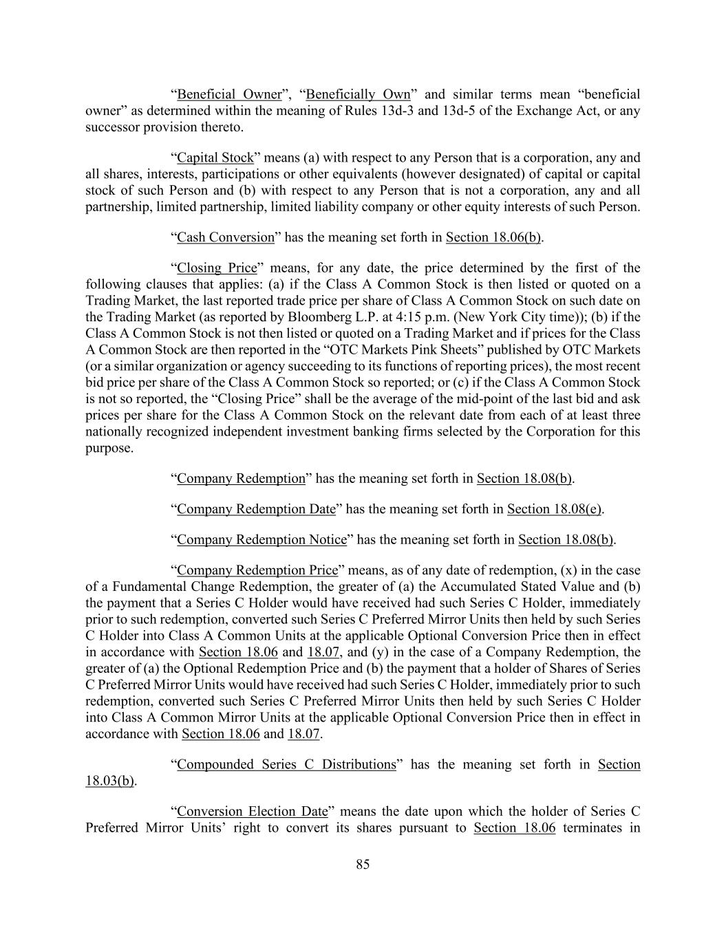 85 “Beneficial Owner”, “Beneficially Own” and similar terms mean “beneficial owner” as determined within the meaning of Rules 13d-3 and 13d-5 of the Exchange Act, or any successor provision thereto. “Capital Stock” means (a) with respect to any Person that is a corporation, any and all shares, interests, participations or other equivalents (however designated) of capital or capital stock of such Person and (b) with respect to any Person that is not a corporation, any and all partnership, limited partnership, limited liability company or other equity interests of such Person. “Cash Conversion” has the meaning set forth in Section 18.06(b). “Closing Price” means, for any date, the price determined by the first of the following clauses that applies: (a) if the Class A Common Stock is then listed or quoted on a Trading Market, the last reported trade price per share of Class A Common Stock on such date on the Trading Market (as reported by Bloomberg L.P. at 4:15 p.m. (New York City time)); (b) if the Class A Common Stock is not then listed or quoted on a Trading Market and if prices for the Class A Common Stock are then reported in the “OTC Markets Pink Sheets” published by OTC Markets (or a similar organization or agency succeeding to its functions of reporting prices), the most recent bid price per share of the Class A Common Stock so reported; or (c) if the Class A Common Stock is not so reported, the “Closing Price” shall be the average of the mid-point of the last bid and ask prices per share for the Class A Common Stock on the relevant date from each of at least three nationally recognized independent investment banking firms selected by the Corporation for this purpose. “Company Redemption” has the meaning set forth in Section 18.08(b). “Company Redemption Date” has the meaning set forth in Section 18.08(e). “Company Redemption Notice” has the meaning set forth in Section 18.08(b). “Company Redemption Price” means, as of any date of redemption, (x) in the case of a Fundamental Change Redemption, the greater of (a) the Accumulated Stated Value and (b) the payment that a Series C Holder would have received had such Series C Holder, immediately prior to such redemption, converted such Series C Preferred Mirror Units then held by such Series C Holder into Class A Common Units at the applicable Optional Conversion Price then in effect in accordance with Section 18.06 and 18.07, and (y) in the case of a Company Redemption, the greater of (a) the Optional Redemption Price and (b) the payment that a holder of Shares of Series C Preferred Mirror Units would have received had such Series C Holder, immediately prior to such redemption, converted such Series C Preferred Mirror Units then held by such Series C Holder into Class A Common Mirror Units at the applicable Optional Conversion Price then in effect in accordance with Section 18.06 and 18.07. “Compounded Series C Distributions” has the meaning set forth in Section 18.03(b). “Conversion Election Date” means the date upon which the holder of Series C Preferred Mirror Units’ right to convert its shares pursuant to Section 18.06 terminates in