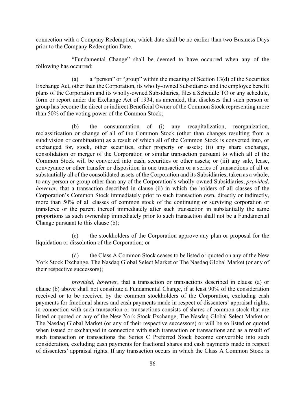 86 connection with a Company Redemption, which date shall be no earlier than two Business Days prior to the Company Redemption Date. “Fundamental Change” shall be deemed to have occurred when any of the following has occurred: (a) a “person” or “group” within the meaning of Section 13(d) of the Securities Exchange Act, other than the Corporation, its wholly-owned Subsidiaries and the employee benefit plans of the Corporation and its wholly-owned Subsidiaries, files a Schedule TO or any schedule, form or report under the Exchange Act of 1934, as amended, that discloses that such person or group has become the direct or indirect Beneficial Owner of the Common Stock representing more than 50% of the voting power of the Common Stock; (b) the consummation of (i) any recapitalization, reorganization, reclassification or change of all of the Common Stock (other than changes resulting from a subdivision or combination) as a result of which all of the Common Stock is converted into, or exchanged for, stock, other securities, other property or assets; (ii) any share exchange, consolidation or merger of the Corporation or similar transaction pursuant to which all of the Common Stock will be converted into cash, securities or other assets; or (iii) any sale, lease, conveyance or other transfer or disposition in one transaction or a series of transactions of all or substantially all of the consolidated assets of the Corporation and its Subsidiaries, taken as a whole, to any person or group other than any of the Corporation’s wholly-owned Subsidiaries; provided, however, that a transaction described in clause (ii) in which the holders of all classes of the Corporation’s Common Stock immediately prior to such transaction own, directly or indirectly, more than 50% of all classes of common stock of the continuing or surviving corporation or transferee or the parent thereof immediately after such transaction in substantially the same proportions as such ownership immediately prior to such transaction shall not be a Fundamental Change pursuant to this clause (b); (c) the stockholders of the Corporation approve any plan or proposal for the liquidation or dissolution of the Corporation; or (d) the Class A Common Stock ceases to be listed or quoted on any of the New York Stock Exchange, The Nasdaq Global Select Market or The Nasdaq Global Market (or any of their respective successors); provided, however, that a transaction or transactions described in clause (a) or clause (b) above shall not constitute a Fundamental Change, if at least 90% of the consideration received or to be received by the common stockholders of the Corporation, excluding cash payments for fractional shares and cash payments made in respect of dissenters’ appraisal rights, in connection with such transaction or transactions consists of shares of common stock that are listed or quoted on any of the New York Stock Exchange, The Nasdaq Global Select Market or The Nasdaq Global Market (or any of their respective successors) or will be so listed or quoted when issued or exchanged in connection with such transaction or transactions and as a result of such transaction or transactions the Series C Preferred Stock become convertible into such consideration, excluding cash payments for fractional shares and cash payments made in respect of dissenters’ appraisal rights. If any transaction occurs in which the Class A Common Stock is