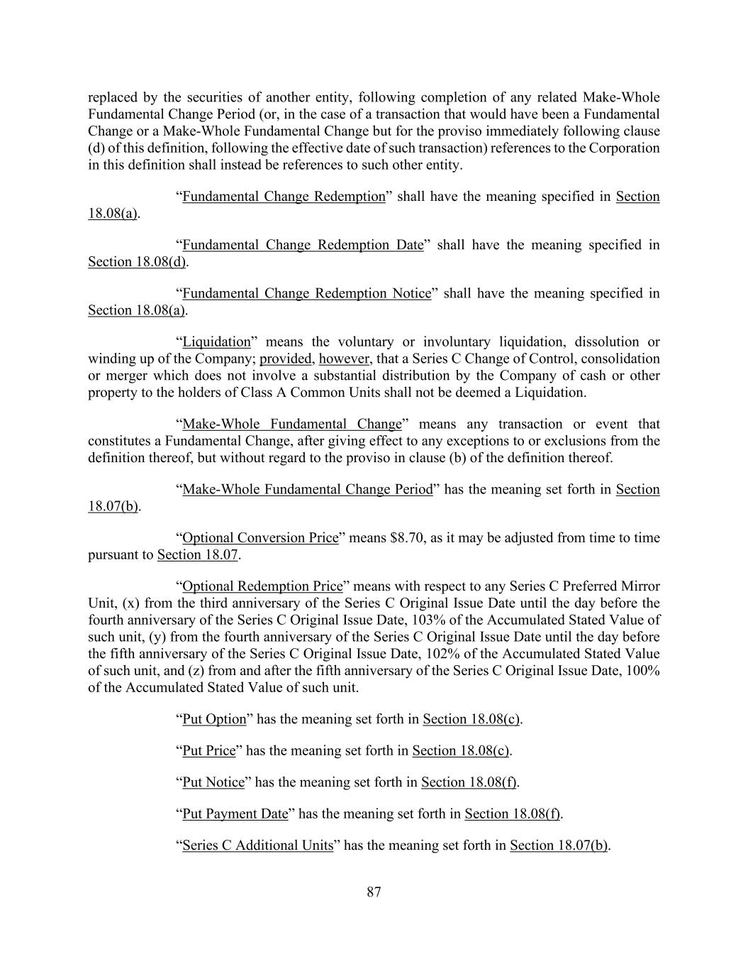 87 replaced by the securities of another entity, following completion of any related Make-Whole Fundamental Change Period (or, in the case of a transaction that would have been a Fundamental Change or a Make-Whole Fundamental Change but for the proviso immediately following clause (d) of this definition, following the effective date of such transaction) references to the Corporation in this definition shall instead be references to such other entity. “Fundamental Change Redemption” shall have the meaning specified in Section 18.08(a). “Fundamental Change Redemption Date” shall have the meaning specified in Section 18.08(d). “Fundamental Change Redemption Notice” shall have the meaning specified in Section 18.08(a). “Liquidation” means the voluntary or involuntary liquidation, dissolution or winding up of the Company; provided, however, that a Series C Change of Control, consolidation or merger which does not involve a substantial distribution by the Company of cash or other property to the holders of Class A Common Units shall not be deemed a Liquidation. “Make-Whole Fundamental Change” means any transaction or event that constitutes a Fundamental Change, after giving effect to any exceptions to or exclusions from the definition thereof, but without regard to the proviso in clause (b) of the definition thereof. “Make-Whole Fundamental Change Period” has the meaning set forth in Section 18.07(b). “Optional Conversion Price” means $8.70, as it may be adjusted from time to time pursuant to Section 18.07. “Optional Redemption Price” means with respect to any Series C Preferred Mirror Unit, (x) from the third anniversary of the Series C Original Issue Date until the day before the fourth anniversary of the Series C Original Issue Date, 103% of the Accumulated Stated Value of such unit, (y) from the fourth anniversary of the Series C Original Issue Date until the day before the fifth anniversary of the Series C Original Issue Date, 102% of the Accumulated Stated Value of such unit, and (z) from and after the fifth anniversary of the Series C Original Issue Date, 100% of the Accumulated Stated Value of such unit. “Put Option” has the meaning set forth in Section 18.08(c). “Put Price” has the meaning set forth in Section 18.08(c). “Put Notice” has the meaning set forth in Section 18.08(f). “Put Payment Date” has the meaning set forth in Section 18.08(f). “Series C Additional Units” has the meaning set forth in Section 18.07(b).