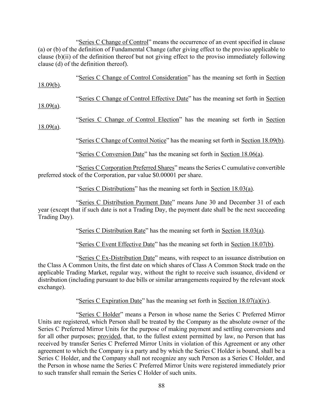 88 “Series C Change of Control” means the occurrence of an event specified in clause (a) or (b) of the definition of Fundamental Change (after giving effect to the proviso applicable to clause (b)(ii) of the definition thereof but not giving effect to the proviso immediately following clause (d) of the definition thereof). “Series C Change of Control Consideration” has the meaning set forth in Section 18.09(b). “Series C Change of Control Effective Date” has the meaning set forth in Section 18.09(a). “Series C Change of Control Election” has the meaning set forth in Section 18.09(a). “Series C Change of Control Notice” has the meaning set forth in Section 18.09(b). “Series C Conversion Date” has the meaning set forth in Section 18.06(a). “Series C Corporation Preferred Shares” means the Series C cumulative convertible preferred stock of the Corporation, par value $0.00001 per share. “Series C Distributions” has the meaning set forth in Section 18.03(a). “Series C Distribution Payment Date” means June 30 and December 31 of each year (except that if such date is not a Trading Day, the payment date shall be the next succeeding Trading Day). “Series C Distribution Rate” has the meaning set forth in Section 18.03(a). “Series C Event Effective Date” has the meaning set forth in Section 18.07(b). “Series C Ex-Distribution Date” means, with respect to an issuance distribution on the Class A Common Units, the first date on which shares of Class A Common Stock trade on the applicable Trading Market, regular way, without the right to receive such issuance, dividend or distribution (including pursuant to due bills or similar arrangements required by the relevant stock exchange). “Series C Expiration Date” has the meaning set forth in Section 18.07(a)(iv). “Series C Holder” means a Person in whose name the Series C Preferred Mirror Units are registered, which Person shall be treated by the Company as the absolute owner of the Series C Preferred Mirror Units for the purpose of making payment and settling conversions and for all other purposes; provided, that, to the fullest extent permitted by law, no Person that has received by transfer Series C Preferred Mirror Units in violation of this Agreement or any other agreement to which the Company is a party and by which the Series C Holder is bound, shall be a Series C Holder, and the Company shall not recognize any such Person as a Series C Holder, and the Person in whose name the Series C Preferred Mirror Units were registered immediately prior to such transfer shall remain the Series C Holder of such units.