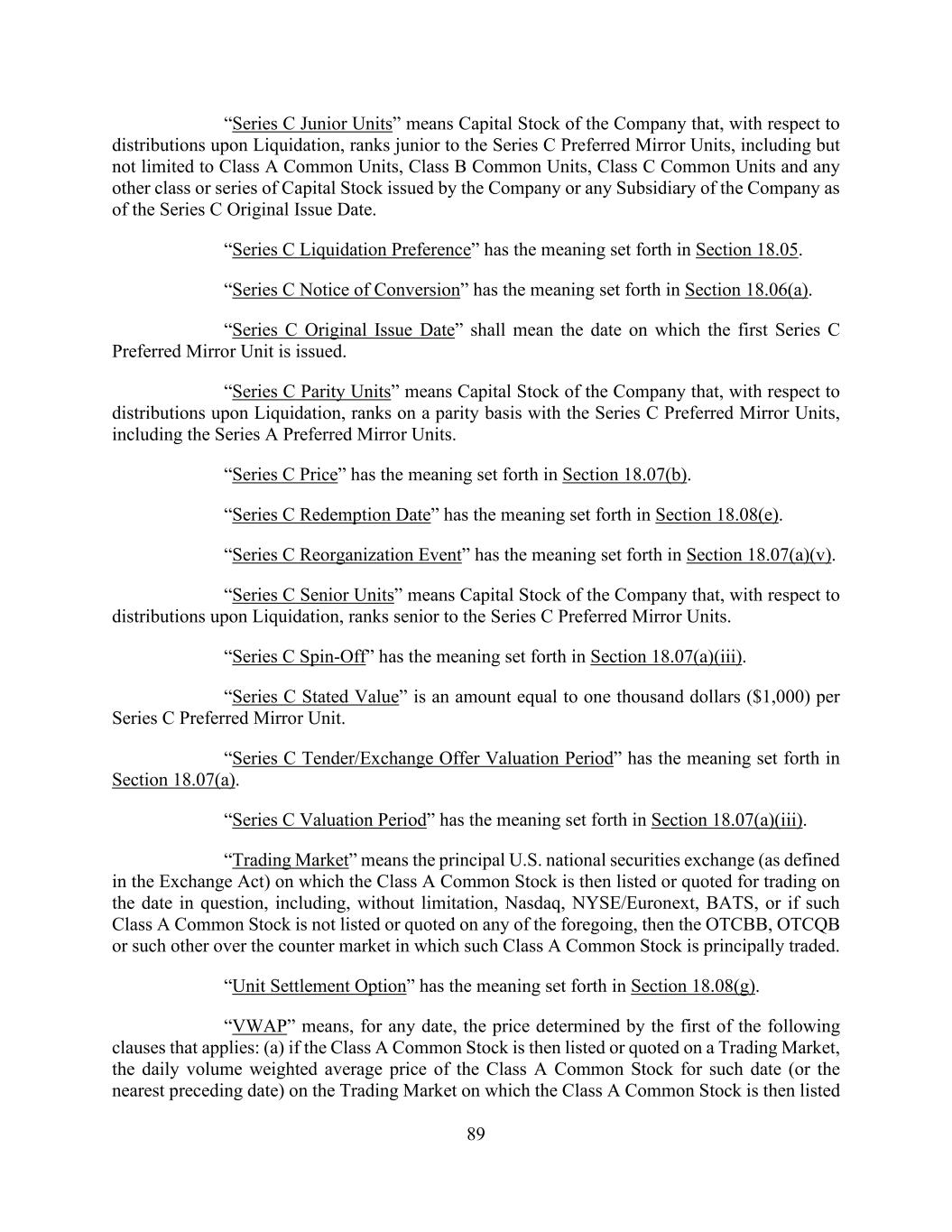 89 “Series C Junior Units” means Capital Stock of the Company that, with respect to distributions upon Liquidation, ranks junior to the Series C Preferred Mirror Units, including but not limited to Class A Common Units, Class B Common Units, Class C Common Units and any other class or series of Capital Stock issued by the Company or any Subsidiary of the Company as of the Series C Original Issue Date. “Series C Liquidation Preference” has the meaning set forth in Section 18.05. “Series C Notice of Conversion” has the meaning set forth in Section 18.06(a). “Series C Original Issue Date” shall mean the date on which the first Series C Preferred Mirror Unit is issued. “Series C Parity Units” means Capital Stock of the Company that, with respect to distributions upon Liquidation, ranks on a parity basis with the Series C Preferred Mirror Units, including the Series A Preferred Mirror Units. “Series C Price” has the meaning set forth in Section 18.07(b). “Series C Redemption Date” has the meaning set forth in Section 18.08(e). “Series C Reorganization Event” has the meaning set forth in Section 18.07(a)(v). “Series C Senior Units” means Capital Stock of the Company that, with respect to distributions upon Liquidation, ranks senior to the Series C Preferred Mirror Units. “Series C Spin-Off” has the meaning set forth in Section 18.07(a)(iii). “Series C Stated Value” is an amount equal to one thousand dollars ($1,000) per Series C Preferred Mirror Unit. “Series C Tender/Exchange Offer Valuation Period” has the meaning set forth in Section 18.07(a). “Series C Valuation Period” has the meaning set forth in Section 18.07(a)(iii). “Trading Market” means the principal U.S. national securities exchange (as defined in the Exchange Act) on which the Class A Common Stock is then listed or quoted for trading on the date in question, including, without limitation, Nasdaq, NYSE/Euronext, BATS, or if such Class A Common Stock is not listed or quoted on any of the foregoing, then the OTCBB, OTCQB or such other over the counter market in which such Class A Common Stock is principally traded. “Unit Settlement Option” has the meaning set forth in Section 18.08(g). “VWAP” means, for any date, the price determined by the first of the following clauses that applies: (a) if the Class A Common Stock is then listed or quoted on a Trading Market, the daily volume weighted average price of the Class A Common Stock for such date (or the nearest preceding date) on the Trading Market on which the Class A Common Stock is then listed