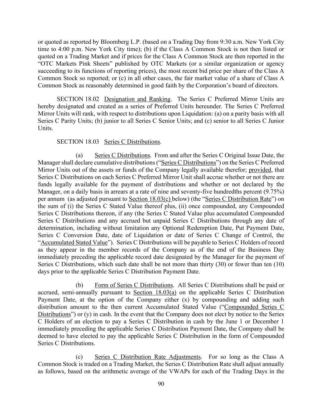 90 or quoted as reported by Bloomberg L.P. (based on a Trading Day from 9:30 a.m. New York City time to 4:00 p.m. New York City time); (b) if the Class A Common Stock is not then listed or quoted on a Trading Market and if prices for the Class A Common Stock are then reported in the “OTC Markets Pink Sheets” published by OTC Markets (or a similar organization or agency succeeding to its functions of reporting prices), the most recent bid price per share of the Class A Common Stock so reported; or (c) in all other cases, the fair market value of a share of Class A Common Stock as reasonably determined in good faith by the Corporation’s board of directors. SECTION 18.02 Designation and Ranking. The Series C Preferred Mirror Units are hereby designated and created as a series of Preferred Units hereunder. The Series C Preferred Mirror Units will rank, with respect to distributions upon Liquidation: (a) on a parity basis with all Series C Parity Units; (b) junior to all Series C Senior Units; and (c) senior to all Series C Junior Units. SECTION 18.03 Series C Distributions. (a) Series C Distributions. From and after the Series C Original Issue Date, the Manager shall declare cumulative distributions (“Series C Distributions”) on the Series C Preferred Mirror Units out of the assets or funds of the Company legally available therefor; provided, that Series C Distributions on each Series C Preferred Mirror Unit shall accrue whether or not there are funds legally available for the payment of distributions and whether or not declared by the Manager, on a daily basis in arrears at a rate of nine and seventy-five hundredths percent (9.75%) per annum (as adjusted pursuant to Section 18.03(c) below) (the “Series C Distribution Rate”) on the sum of (i) the Series C Stated Value thereof plus, (ii) once compounded, any Compounded Series C Distributions thereon, if any (the Series C Stated Value plus accumulated Compounded Series C Distributions and any accrued but unpaid Series C Distributions through any date of determination, including without limitation any Optional Redemption Date, Put Payment Date, Series C Conversion Date, date of Liquidation or date of Series C Change of Control, the “Accumulated Stated Value”). Series C Distributions will be payable to Series C Holders of record as they appear in the member records of the Company as of the end of the Business Day immediately preceding the applicable record date designated by the Manager for the payment of Series C Distributions, which such date shall be not more than thirty (30) or fewer than ten (10) days prior to the applicable Series C Distribution Payment Date. (b) Form of Series C Distributions. All Series C Distributions shall be paid or accrued, semi-annually pursuant to Section 18.03(a) on the applicable Series C Distribution Payment Date, at the option of the Company either (x) by compounding and adding such distribution amount to the then current Accumulated Stated Value (“Compounded Series C Distributions”) or (y) in cash. In the event that the Company does not elect by notice to the Series C Holders of an election to pay a Series C Distribution in cash by the June 1 or December 1 immediately preceding the applicable Series C Distribution Payment Date, the Company shall be deemed to have elected to pay the applicable Series C Distribution in the form of Compounded Series C Distributions. (c) Series C Distribution Rate Adjustments. For so long as the Class A Common Stock is traded on a Trading Market, the Series C Distribution Rate shall adjust annually as follows, based on the arithmetic average of the VWAPs for each of the Trading Days in the
