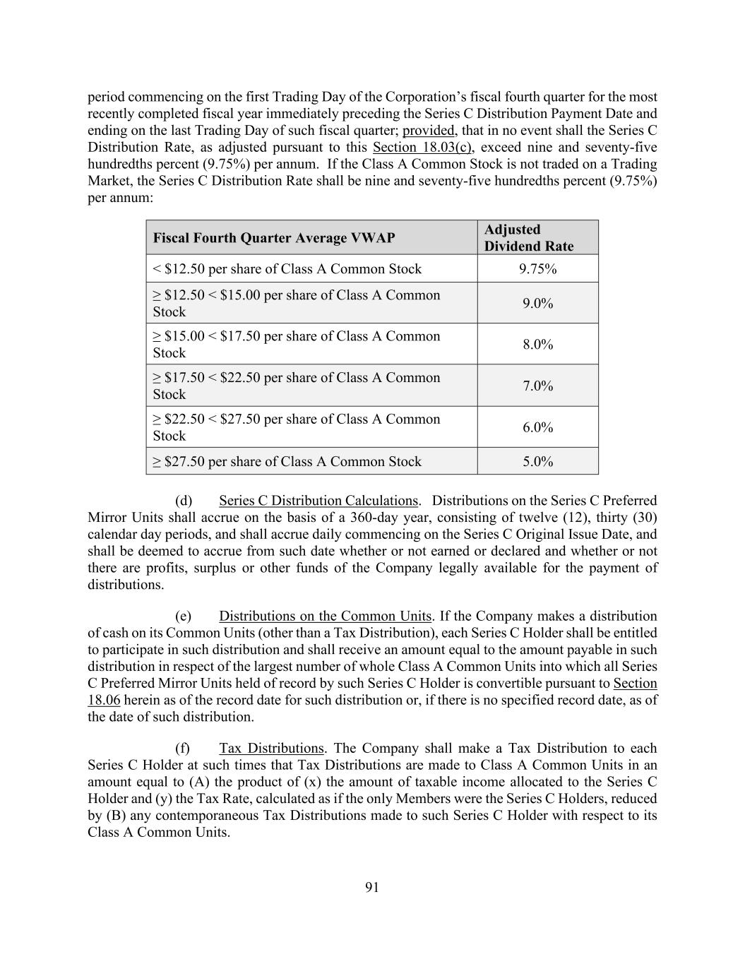 91 period commencing on the first Trading Day of the Corporation’s fiscal fourth quarter for the most recently completed fiscal year immediately preceding the Series C Distribution Payment Date and ending on the last Trading Day of such fiscal quarter; provided, that in no event shall the Series C Distribution Rate, as adjusted pursuant to this Section 18.03(c), exceed nine and seventy-five hundredths percent (9.75%) per annum. If the Class A Common Stock is not traded on a Trading Market, the Series C Distribution Rate shall be nine and seventy-five hundredths percent (9.75%) per annum: Fiscal Fourth Quarter Average VWAP Adjusted Dividend Rate < $12.50 per share of Class A Common Stock 9.75% ≥ $12.50 < $15.00 per share of Class A Common Stock 9.0% ≥ $15.00 < $17.50 per share of Class A Common Stock 8.0% ≥ $17.50 < $22.50 per share of Class A Common Stock 7.0% ≥ $22.50 < $27.50 per share of Class A Common Stock 6.0% ≥ $27.50 per share of Class A Common Stock 5.0% (d) Series C Distribution Calculations. Distributions on the Series C Preferred Mirror Units shall accrue on the basis of a 360-day year, consisting of twelve (12), thirty (30) calendar day periods, and shall accrue daily commencing on the Series C Original Issue Date, and shall be deemed to accrue from such date whether or not earned or declared and whether or not there are profits, surplus or other funds of the Company legally available for the payment of distributions. (e) Distributions on the Common Units. If the Company makes a distribution of cash on its Common Units (other than a Tax Distribution), each Series C Holder shall be entitled to participate in such distribution and shall receive an amount equal to the amount payable in such distribution in respect of the largest number of whole Class A Common Units into which all Series C Preferred Mirror Units held of record by such Series C Holder is convertible pursuant to Section 18.06 herein as of the record date for such distribution or, if there is no specified record date, as of the date of such distribution. (f) Tax Distributions. The Company shall make a Tax Distribution to each Series C Holder at such times that Tax Distributions are made to Class A Common Units in an amount equal to (A) the product of (x) the amount of taxable income allocated to the Series C Holder and (y) the Tax Rate, calculated as if the only Members were the Series C Holders, reduced by (B) any contemporaneous Tax Distributions made to such Series C Holder with respect to its Class A Common Units.