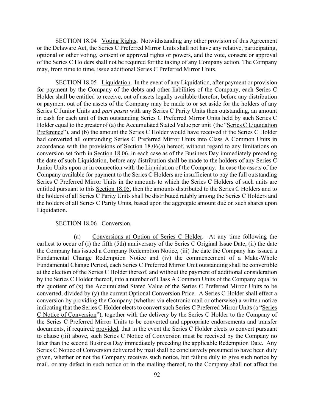 92 SECTION 18.04 Voting Rights. Notwithstanding any other provision of this Agreement or the Delaware Act, the Series C Preferred Mirror Units shall not have any relative, participating, optional or other voting, consent or approval rights or powers, and the vote, consent or approval of the Series C Holders shall not be required for the taking of any Company action. The Company may, from time to time, issue additional Series C Preferred Mirror Units. SECTION 18.05 Liquidation. In the event of any Liquidation, after payment or provision for payment by the Company of the debts and other liabilities of the Company, each Series C Holder shall be entitled to receive, out of assets legally available therefor, before any distribution or payment out of the assets of the Company may be made to or set aside for the holders of any Series C Junior Units and pari passu with any Series C Parity Units then outstanding, an amount in cash for each unit of then outstanding Series C Preferred Mirror Units held by such Series C Holder equal to the greater of (a) the Accumulated Stated Value per unit (the “Series C Liquidation Preference”), and (b) the amount the Series C Holder would have received if the Series C Holder had converted all outstanding Series C Preferred Mirror Units into Class A Common Units in accordance with the provisions of Section 18.06(a) hereof, without regard to any limitations on conversion set forth in Section 18.06, in each case as of the Business Day immediately preceding the date of such Liquidation, before any distribution shall be made to the holders of any Series C Junior Units upon or in connection with the Liquidation of the Company. In case the assets of the Company available for payment to the Series C Holders are insufficient to pay the full outstanding Series C Preferred Mirror Units in the amounts to which the Series C Holders of such units are entitled pursuant to this Section 18.05, then the amounts distributed to the Series C Holders and to the holders of all Series C Parity Units shall be distributed ratably among the Series C Holders and the holders of all Series C Parity Units, based upon the aggregate amount due on such shares upon Liquidation. SECTION 18.06 Conversion. (a) Conversions at Option of Series C Holder. At any time following the earliest to occur of (i) the fifth (5th) anniversary of the Series C Original Issue Date, (ii) the date the Company has issued a Company Redemption Notice, (iii) the date the Company has issued a Fundamental Change Redemption Notice and (iv) the commencement of a Make-Whole Fundamental Change Period, each Series C Preferred Mirror Unit outstanding shall be convertible at the election of the Series C Holder thereof, and without the payment of additional consideration by the Series C Holder thereof, into a number of Class A Common Units of the Company equal to the quotient of (x) the Accumulated Stated Value of the Series C Preferred Mirror Units to be converted, divided by (y) the current Optional Conversion Price. A Series C Holder shall effect a conversion by providing the Company (whether via electronic mail or otherwise) a written notice indicating that the Series C Holder elects to convert such Series C Preferred Mirror Units (a “Series C Notice of Conversion”), together with the delivery by the Series C Holder to the Company of the Series C Preferred Mirror Units to be converted and appropriate endorsements and transfer documents, if required; provided, that in the event the Series C Holder elects to convert pursuant to clause (iii) above, such Series C Notice of Conversion must be received by the Company no later than the second Business Day immediately preceding the applicable Redemption Date. Any Series C Notice of Conversion delivered by mail shall be conclusively presumed to have been duly given, whether or not the Company receives such notice, but failure duly to give such notice by mail, or any defect in such notice or in the mailing thereof, to the Company shall not affect the