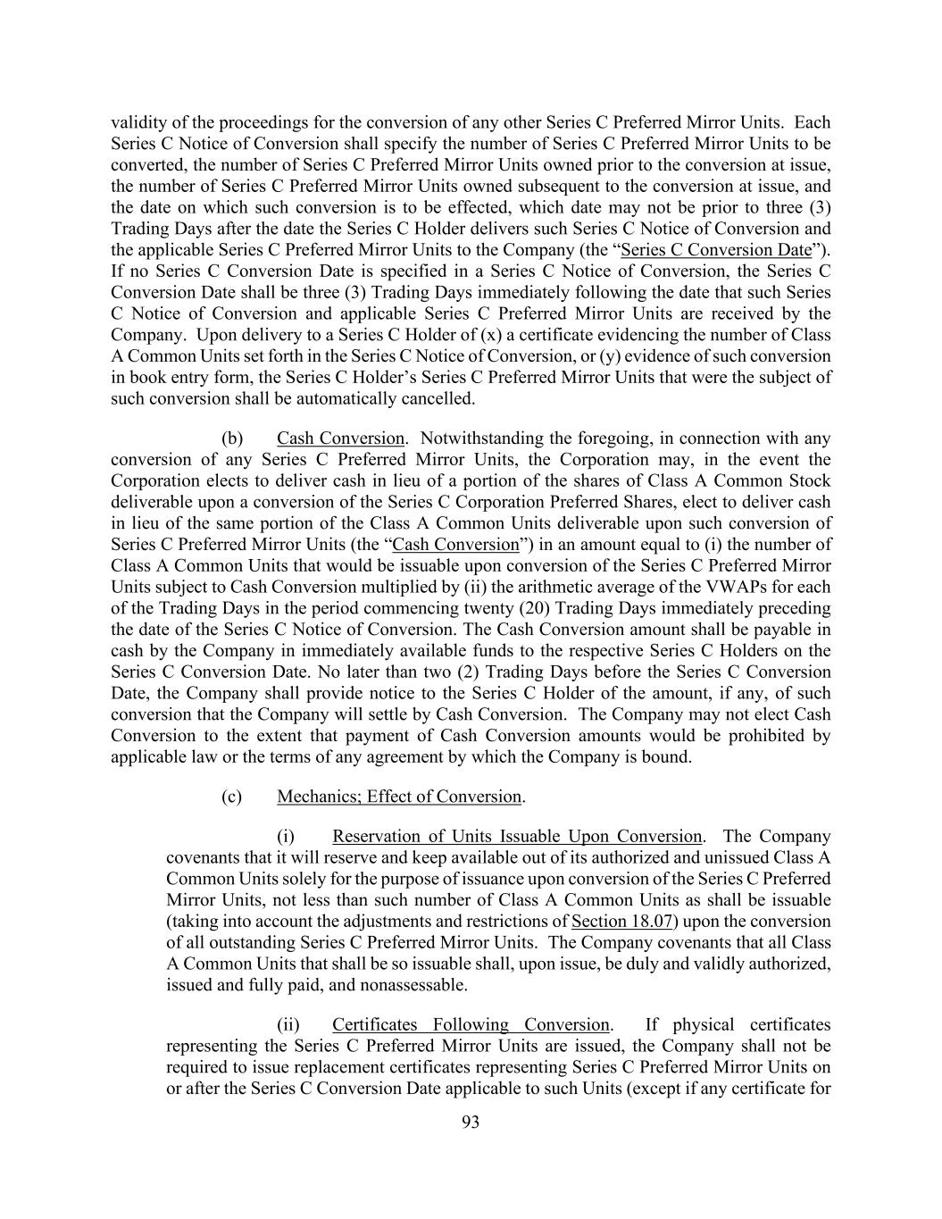 93 validity of the proceedings for the conversion of any other Series C Preferred Mirror Units. Each Series C Notice of Conversion shall specify the number of Series C Preferred Mirror Units to be converted, the number of Series C Preferred Mirror Units owned prior to the conversion at issue, the number of Series C Preferred Mirror Units owned subsequent to the conversion at issue, and the date on which such conversion is to be effected, which date may not be prior to three (3) Trading Days after the date the Series C Holder delivers such Series C Notice of Conversion and the applicable Series C Preferred Mirror Units to the Company (the “Series C Conversion Date”). If no Series C Conversion Date is specified in a Series C Notice of Conversion, the Series C Conversion Date shall be three (3) Trading Days immediately following the date that such Series C Notice of Conversion and applicable Series C Preferred Mirror Units are received by the Company. Upon delivery to a Series C Holder of (x) a certificate evidencing the number of Class A Common Units set forth in the Series C Notice of Conversion, or (y) evidence of such conversion in book entry form, the Series C Holder’s Series C Preferred Mirror Units that were the subject of such conversion shall be automatically cancelled. (b) Cash Conversion. Notwithstanding the foregoing, in connection with any conversion of any Series C Preferred Mirror Units, the Corporation may, in the event the Corporation elects to deliver cash in lieu of a portion of the shares of Class A Common Stock deliverable upon a conversion of the Series C Corporation Preferred Shares, elect to deliver cash in lieu of the same portion of the Class A Common Units deliverable upon such conversion of Series C Preferred Mirror Units (the “Cash Conversion”) in an amount equal to (i) the number of Class A Common Units that would be issuable upon conversion of the Series C Preferred Mirror Units subject to Cash Conversion multiplied by (ii) the arithmetic average of the VWAPs for each of the Trading Days in the period commencing twenty (20) Trading Days immediately preceding the date of the Series C Notice of Conversion. The Cash Conversion amount shall be payable in cash by the Company in immediately available funds to the respective Series C Holders on the Series C Conversion Date. No later than two (2) Trading Days before the Series C Conversion Date, the Company shall provide notice to the Series C Holder of the amount, if any, of such conversion that the Company will settle by Cash Conversion. The Company may not elect Cash Conversion to the extent that payment of Cash Conversion amounts would be prohibited by applicable law or the terms of any agreement by which the Company is bound. (c) Mechanics; Effect of Conversion. (i) Reservation of Units Issuable Upon Conversion. The Company covenants that it will reserve and keep available out of its authorized and unissued Class A Common Units solely for the purpose of issuance upon conversion of the Series C Preferred Mirror Units, not less than such number of Class A Common Units as shall be issuable (taking into account the adjustments and restrictions of Section 18.07) upon the conversion of all outstanding Series C Preferred Mirror Units. The Company covenants that all Class A Common Units that shall be so issuable shall, upon issue, be duly and validly authorized, issued and fully paid, and nonassessable. (ii) Certificates Following Conversion. If physical certificates representing the Series C Preferred Mirror Units are issued, the Company shall not be required to issue replacement certificates representing Series C Preferred Mirror Units on or after the Series C Conversion Date applicable to such Units (except if any certificate for