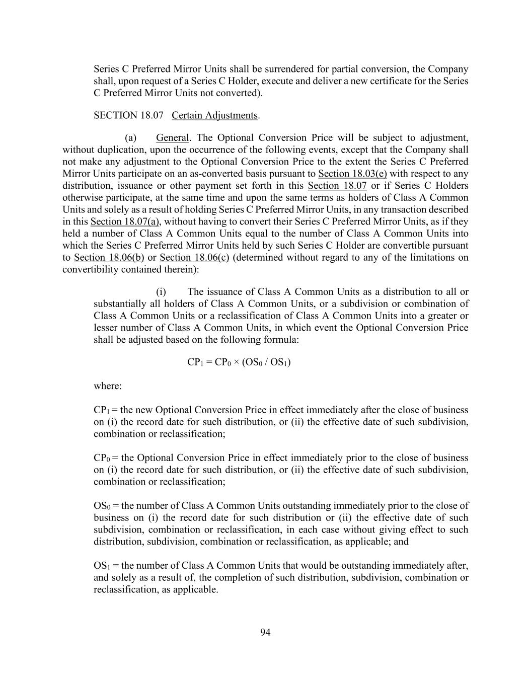 94 Series C Preferred Mirror Units shall be surrendered for partial conversion, the Company shall, upon request of a Series C Holder, execute and deliver a new certificate for the Series C Preferred Mirror Units not converted). SECTION 18.07 Certain Adjustments. (a) General. The Optional Conversion Price will be subject to adjustment, without duplication, upon the occurrence of the following events, except that the Company shall not make any adjustment to the Optional Conversion Price to the extent the Series C Preferred Mirror Units participate on an as-converted basis pursuant to Section 18.03(e) with respect to any distribution, issuance or other payment set forth in this Section 18.07 or if Series C Holders otherwise participate, at the same time and upon the same terms as holders of Class A Common Units and solely as a result of holding Series C Preferred Mirror Units, in any transaction described in this Section 18.07(a), without having to convert their Series C Preferred Mirror Units, as if they held a number of Class A Common Units equal to the number of Class A Common Units into which the Series C Preferred Mirror Units held by such Series C Holder are convertible pursuant to Section 18.06(b) or Section 18.06(c) (determined without regard to any of the limitations on convertibility contained therein): (i) The issuance of Class A Common Units as a distribution to all or substantially all holders of Class A Common Units, or a subdivision or combination of Class A Common Units or a reclassification of Class A Common Units into a greater or lesser number of Class A Common Units, in which event the Optional Conversion Price shall be adjusted based on the following formula: CP1 = CP0 × (OS0 / OS1) where: CP1 = the new Optional Conversion Price in effect immediately after the close of business on (i) the record date for such distribution, or (ii) the effective date of such subdivision, combination or reclassification; CP0 = the Optional Conversion Price in effect immediately prior to the close of business on (i) the record date for such distribution, or (ii) the effective date of such subdivision, combination or reclassification; OS0 = the number of Class A Common Units outstanding immediately prior to the close of business on (i) the record date for such distribution or (ii) the effective date of such subdivision, combination or reclassification, in each case without giving effect to such distribution, subdivision, combination or reclassification, as applicable; and OS1 = the number of Class A Common Units that would be outstanding immediately after, and solely as a result of, the completion of such distribution, subdivision, combination or reclassification, as applicable.