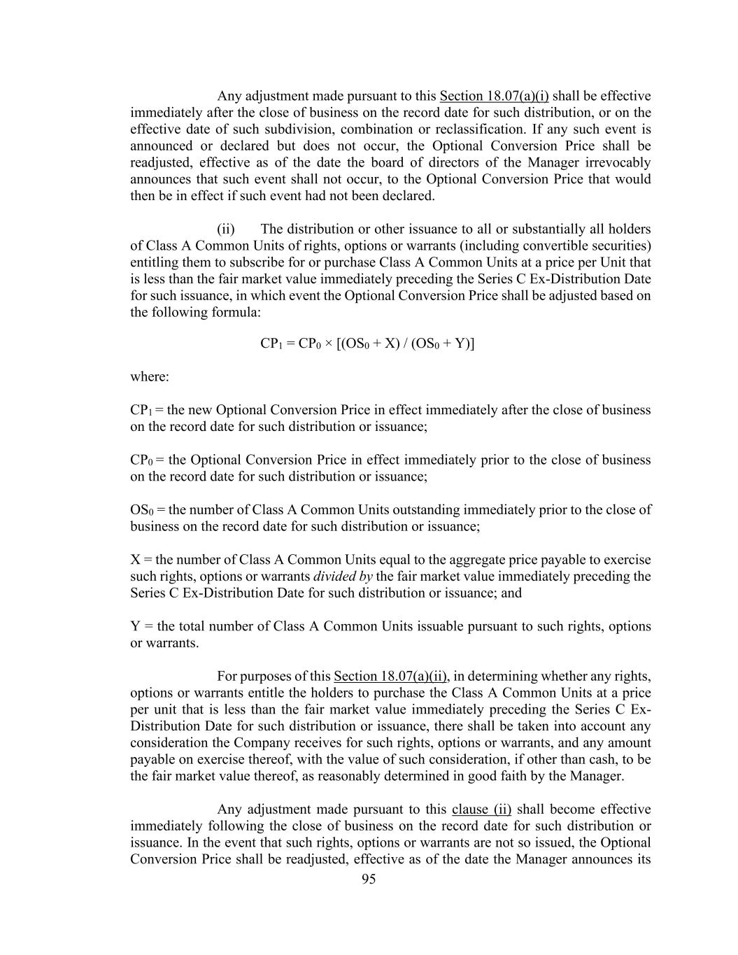 95 Any adjustment made pursuant to this Section 18.07(a)(i) shall be effective immediately after the close of business on the record date for such distribution, or on the effective date of such subdivision, combination or reclassification. If any such event is announced or declared but does not occur, the Optional Conversion Price shall be readjusted, effective as of the date the board of directors of the Manager irrevocably announces that such event shall not occur, to the Optional Conversion Price that would then be in effect if such event had not been declared. (ii) The distribution or other issuance to all or substantially all holders of Class A Common Units of rights, options or warrants (including convertible securities) entitling them to subscribe for or purchase Class A Common Units at a price per Unit that is less than the fair market value immediately preceding the Series C Ex-Distribution Date for such issuance, in which event the Optional Conversion Price shall be adjusted based on the following formula: CP1 = CP0 × [(OS0 + X) / (OS0 + Y)] where: CP1 = the new Optional Conversion Price in effect immediately after the close of business on the record date for such distribution or issuance; CP0 = the Optional Conversion Price in effect immediately prior to the close of business on the record date for such distribution or issuance; OS0 = the number of Class A Common Units outstanding immediately prior to the close of business on the record date for such distribution or issuance; X = the number of Class A Common Units equal to the aggregate price payable to exercise such rights, options or warrants divided by the fair market value immediately preceding the Series C Ex-Distribution Date for such distribution or issuance; and Y = the total number of Class A Common Units issuable pursuant to such rights, options or warrants. For purposes of this Section 18.07(a)(ii), in determining whether any rights, options or warrants entitle the holders to purchase the Class A Common Units at a price per unit that is less than the fair market value immediately preceding the Series C Ex- Distribution Date for such distribution or issuance, there shall be taken into account any consideration the Company receives for such rights, options or warrants, and any amount payable on exercise thereof, with the value of such consideration, if other than cash, to be the fair market value thereof, as reasonably determined in good faith by the Manager. Any adjustment made pursuant to this clause (ii) shall become effective immediately following the close of business on the record date for such distribution or issuance. In the event that such rights, options or warrants are not so issued, the Optional Conversion Price shall be readjusted, effective as of the date the Manager announces its