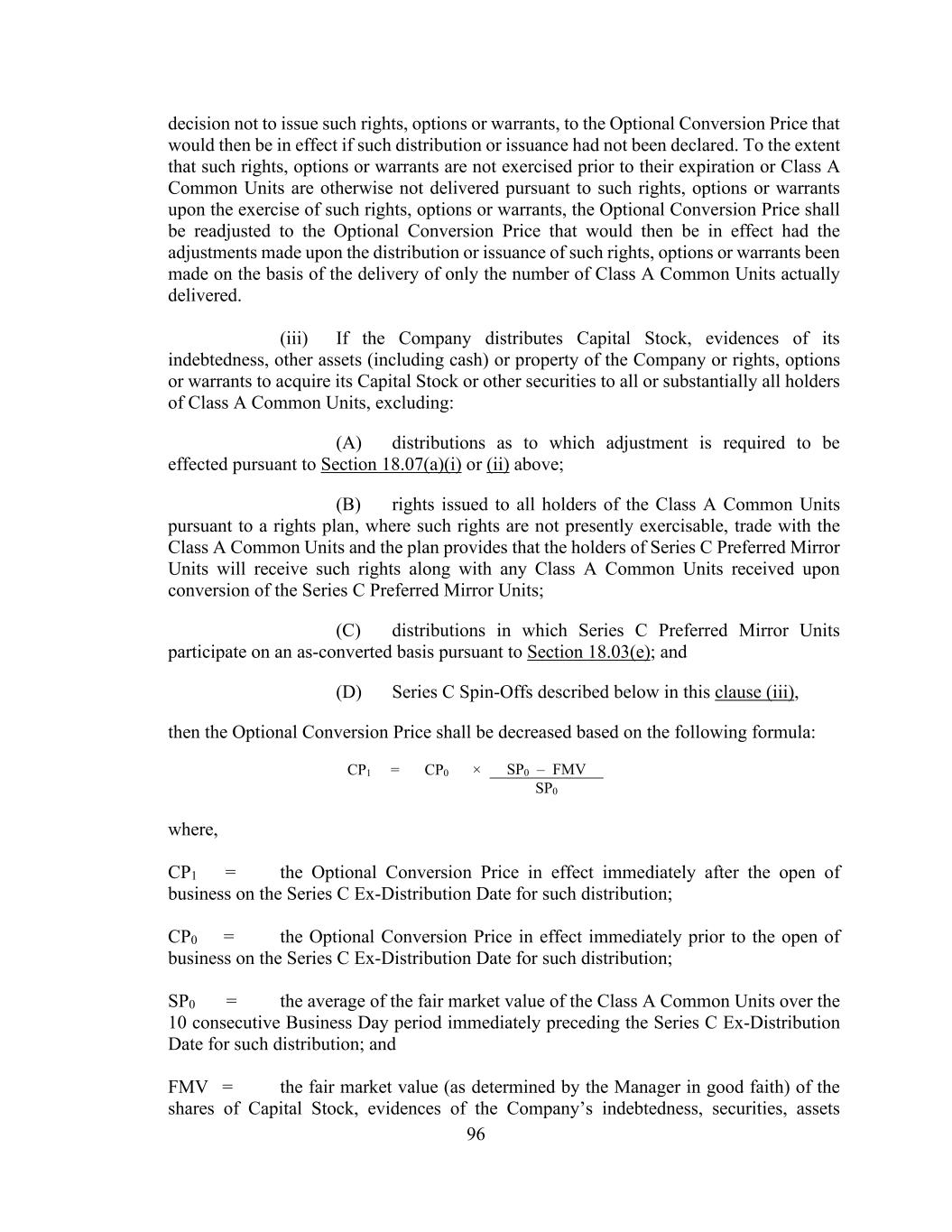 96 decision not to issue such rights, options or warrants, to the Optional Conversion Price that would then be in effect if such distribution or issuance had not been declared. To the extent that such rights, options or warrants are not exercised prior to their expiration or Class A Common Units are otherwise not delivered pursuant to such rights, options or warrants upon the exercise of such rights, options or warrants, the Optional Conversion Price shall be readjusted to the Optional Conversion Price that would then be in effect had the adjustments made upon the distribution or issuance of such rights, options or warrants been made on the basis of the delivery of only the number of Class A Common Units actually delivered. (iii) If the Company distributes Capital Stock, evidences of its indebtedness, other assets (including cash) or property of the Company or rights, options or warrants to acquire its Capital Stock or other securities to all or substantially all holders of Class A Common Units, excluding: (A) distributions as to which adjustment is required to be effected pursuant to Section 18.07(a)(i) or (ii) above; (B) rights issued to all holders of the Class A Common Units pursuant to a rights plan, where such rights are not presently exercisable, trade with the Class A Common Units and the plan provides that the holders of Series C Preferred Mirror Units will receive such rights along with any Class A Common Units received upon conversion of the Series C Preferred Mirror Units; (C) distributions in which Series C Preferred Mirror Units participate on an as-converted basis pursuant to Section 18.03(e); and (D) Series C Spin-Offs described below in this clause (iii), then the Optional Conversion Price shall be decreased based on the following formula: CP1 = CP0 × SP0 – FMV SP0 where, CP1 = the Optional Conversion Price in effect immediately after the open of business on the Series C Ex-Distribution Date for such distribution; CP0 = the Optional Conversion Price in effect immediately prior to the open of business on the Series C Ex-Distribution Date for such distribution; SP0 = the average of the fair market value of the Class A Common Units over the 10 consecutive Business Day period immediately preceding the Series C Ex-Distribution Date for such distribution; and FMV = the fair market value (as determined by the Manager in good faith) of the shares of Capital Stock, evidences of the Company’s indebtedness, securities, assets