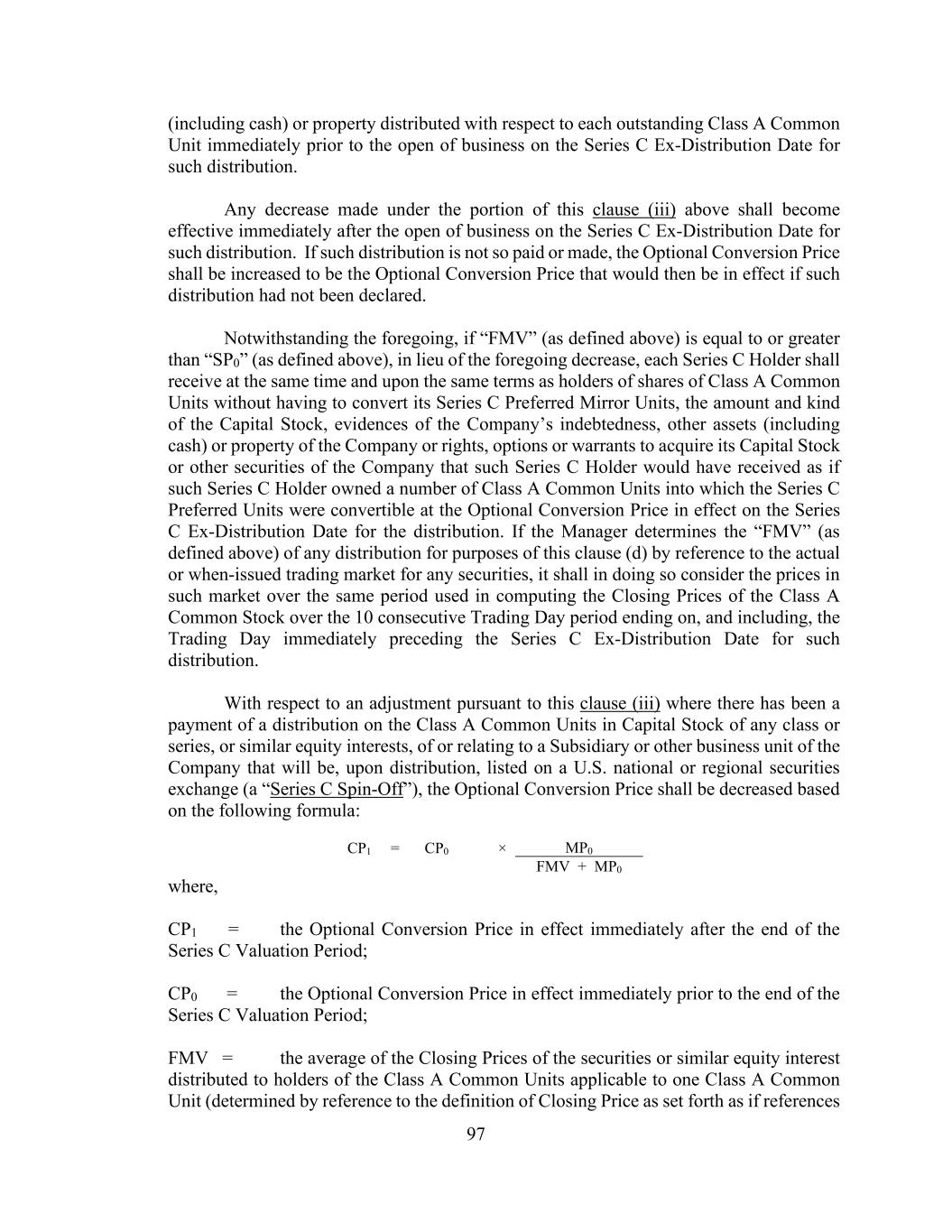 97 (including cash) or property distributed with respect to each outstanding Class A Common Unit immediately prior to the open of business on the Series C Ex-Distribution Date for such distribution. Any decrease made under the portion of this clause (iii) above shall become effective immediately after the open of business on the Series C Ex-Distribution Date for such distribution. If such distribution is not so paid or made, the Optional Conversion Price shall be increased to be the Optional Conversion Price that would then be in effect if such distribution had not been declared. Notwithstanding the foregoing, if “FMV” (as defined above) is equal to or greater than “SP0” (as defined above), in lieu of the foregoing decrease, each Series C Holder shall receive at the same time and upon the same terms as holders of shares of Class A Common Units without having to convert its Series C Preferred Mirror Units, the amount and kind of the Capital Stock, evidences of the Company’s indebtedness, other assets (including cash) or property of the Company or rights, options or warrants to acquire its Capital Stock or other securities of the Company that such Series C Holder would have received as if such Series C Holder owned a number of Class A Common Units into which the Series C Preferred Units were convertible at the Optional Conversion Price in effect on the Series C Ex-Distribution Date for the distribution. If the Manager determines the “FMV” (as defined above) of any distribution for purposes of this clause (d) by reference to the actual or when-issued trading market for any securities, it shall in doing so consider the prices in such market over the same period used in computing the Closing Prices of the Class A Common Stock over the 10 consecutive Trading Day period ending on, and including, the Trading Day immediately preceding the Series C Ex-Distribution Date for such distribution. With respect to an adjustment pursuant to this clause (iii) where there has been a payment of a distribution on the Class A Common Units in Capital Stock of any class or series, or similar equity interests, of or relating to a Subsidiary or other business unit of the Company that will be, upon distribution, listed on a U.S. national or regional securities exchange (a “Series C Spin-Off”), the Optional Conversion Price shall be decreased based on the following formula: CP1 = CP0 × MP0 FMV + MP0 where, CP1 = the Optional Conversion Price in effect immediately after the end of the Series C Valuation Period; CP0 = the Optional Conversion Price in effect immediately prior to the end of the Series C Valuation Period; FMV = the average of the Closing Prices of the securities or similar equity interest distributed to holders of the Class A Common Units applicable to one Class A Common Unit (determined by reference to the definition of Closing Price as set forth as if references