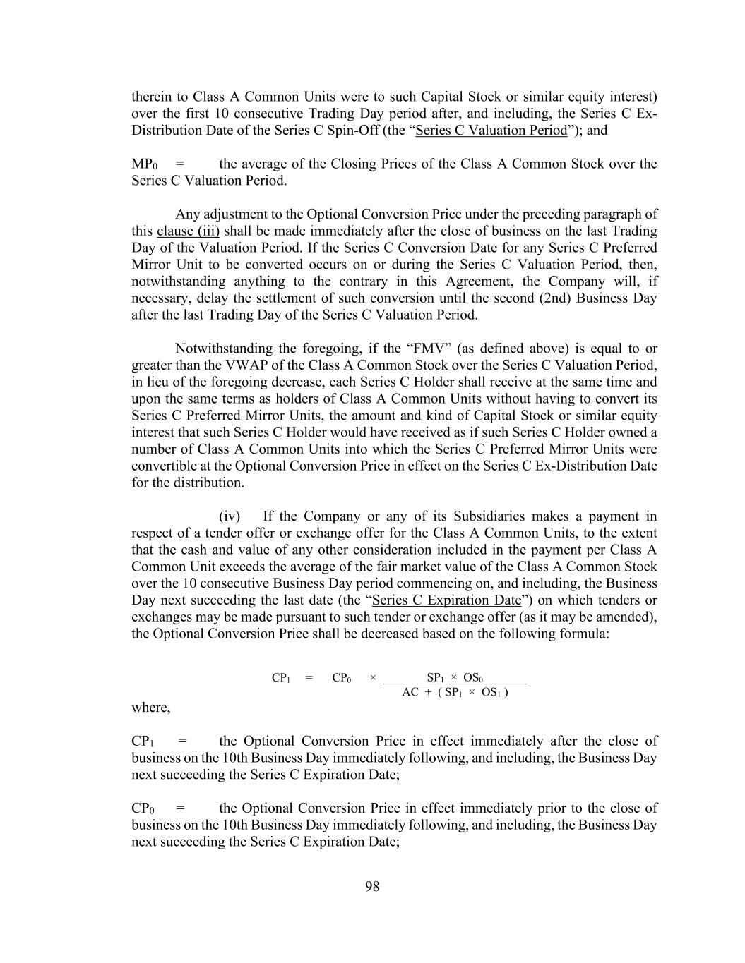98 therein to Class A Common Units were to such Capital Stock or similar equity interest) over the first 10 consecutive Trading Day period after, and including, the Series C Ex- Distribution Date of the Series C Spin-Off (the “Series C Valuation Period”); and MP0 = the average of the Closing Prices of the Class A Common Stock over the Series C Valuation Period. Any adjustment to the Optional Conversion Price under the preceding paragraph of this clause (iii) shall be made immediately after the close of business on the last Trading Day of the Valuation Period. If the Series C Conversion Date for any Series C Preferred Mirror Unit to be converted occurs on or during the Series C Valuation Period, then, notwithstanding anything to the contrary in this Agreement, the Company will, if necessary, delay the settlement of such conversion until the second (2nd) Business Day after the last Trading Day of the Series C Valuation Period. Notwithstanding the foregoing, if the “FMV” (as defined above) is equal to or greater than the VWAP of the Class A Common Stock over the Series C Valuation Period, in lieu of the foregoing decrease, each Series C Holder shall receive at the same time and upon the same terms as holders of Class A Common Units without having to convert its Series C Preferred Mirror Units, the amount and kind of Capital Stock or similar equity interest that such Series C Holder would have received as if such Series C Holder owned a number of Class A Common Units into which the Series C Preferred Mirror Units were convertible at the Optional Conversion Price in effect on the Series C Ex-Distribution Date for the distribution. (iv) If the Company or any of its Subsidiaries makes a payment in respect of a tender offer or exchange offer for the Class A Common Units, to the extent that the cash and value of any other consideration included in the payment per Class A Common Unit exceeds the average of the fair market value of the Class A Common Stock over the 10 consecutive Business Day period commencing on, and including, the Business Day next succeeding the last date (the “Series C Expiration Date”) on which tenders or exchanges may be made pursuant to such tender or exchange offer (as it may be amended), the Optional Conversion Price shall be decreased based on the following formula: CP1 = CP0 × SP1 × OS0 AC + ( SP1 × OS1 ) where, CP1 = the Optional Conversion Price in effect immediately after the close of business on the 10th Business Day immediately following, and including, the Business Day next succeeding the Series C Expiration Date; CP0 = the Optional Conversion Price in effect immediately prior to the close of business on the 10th Business Day immediately following, and including, the Business Day next succeeding the Series C Expiration Date;