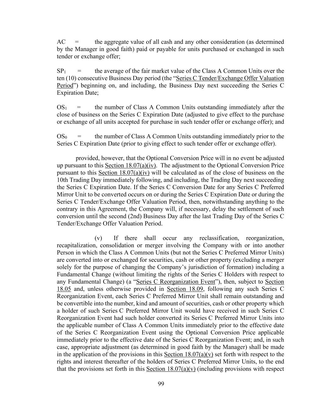 99 AC = the aggregate value of all cash and any other consideration (as determined by the Manager in good faith) paid or payable for units purchased or exchanged in such tender or exchange offer; SP1 = the average of the fair market value of the Class A Common Units over the ten (10) consecutive Business Day period (the “Series C Tender/Exchange Offer Valuation Period”) beginning on, and including, the Business Day next succeeding the Series C Expiration Date; OS1 = the number of Class A Common Units outstanding immediately after the close of business on the Series C Expiration Date (adjusted to give effect to the purchase or exchange of all units accepted for purchase in such tender offer or exchange offer); and OS0 = the number of Class A Common Units outstanding immediately prior to the Series C Expiration Date (prior to giving effect to such tender offer or exchange offer). provided, however, that the Optional Conversion Price will in no event be adjusted up pursuant to this Section 18.07(a)(iv). The adjustment to the Optional Conversion Price pursuant to this Section 18.07(a)(iv) will be calculated as of the close of business on the 10th Trading Day immediately following, and including, the Trading Day next succeeding the Series C Expiration Date. If the Series C Conversion Date for any Series C Preferred Mirror Unit to be converted occurs on or during the Series C Expiration Date or during the Series C Tender/Exchange Offer Valuation Period, then, notwithstanding anything to the contrary in this Agreement, the Company will, if necessary, delay the settlement of such conversion until the second (2nd) Business Day after the last Trading Day of the Series C Tender/Exchange Offer Valuation Period. (v) If there shall occur any reclassification, reorganization, recapitalization, consolidation or merger involving the Company with or into another Person in which the Class A Common Units (but not the Series C Preferred Mirror Units) are converted into or exchanged for securities, cash or other property (excluding a merger solely for the purpose of changing the Company’s jurisdiction of formation) including a Fundamental Change (without limiting the rights of the Series C Holders with respect to any Fundamental Change) (a “Series C Reorganization Event”), then, subject to Section 18.05 and, unless otherwise provided in Section 18.09, following any such Series C Reorganization Event, each Series C Preferred Mirror Unit shall remain outstanding and be convertible into the number, kind and amount of securities, cash or other property which a holder of such Series C Preferred Mirror Unit would have received in such Series C Reorganization Event had such holder converted its Series C Preferred Mirror Units into the applicable number of Class A Common Units immediately prior to the effective date of the Series C Reorganization Event using the Optional Conversion Price applicable immediately prior to the effective date of the Series C Reorganization Event; and, in such case, appropriate adjustment (as determined in good faith by the Manager) shall be made in the application of the provisions in this Section 18.07(a)(v) set forth with respect to the rights and interest thereafter of the holders of Series C Preferred Mirror Units, to the end that the provisions set forth in this Section 18.07(a)(v) (including provisions with respect