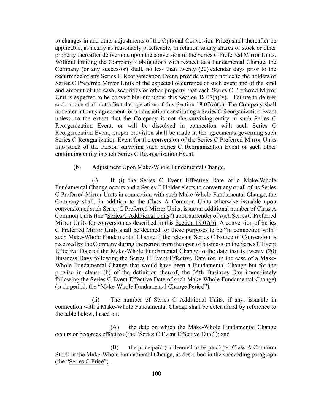 100 to changes in and other adjustments of the Optional Conversion Price) shall thereafter be applicable, as nearly as reasonably practicable, in relation to any shares of stock or other property thereafter deliverable upon the conversion of the Series C Preferred Mirror Units. Without limiting the Company’s obligations with respect to a Fundamental Change, the Company (or any successor) shall, no less than twenty (20) calendar days prior to the occurrence of any Series C Reorganization Event, provide written notice to the holders of Series C Preferred Mirror Units of the expected occurrence of such event and of the kind and amount of the cash, securities or other property that each Series C Preferred Mirror Unit is expected to be convertible into under this Section 18.07(a)(v). Failure to deliver such notice shall not affect the operation of this Section 18.07(a)(v). The Company shall not enter into any agreement for a transaction constituting a Series C Reorganization Event unless, to the extent that the Company is not the surviving entity in such Series C Reorganization Event, or will be dissolved in connection with such Series C Reorganization Event, proper provision shall be made in the agreements governing such Series C Reorganization Event for the conversion of the Series C Preferred Mirror Units into stock of the Person surviving such Series C Reorganization Event or such other continuing entity in such Series C Reorganization Event. (b) Adjustment Upon Make-Whole Fundamental Change. (i) If (i) the Series C Event Effective Date of a Make-Whole Fundamental Change occurs and a Series C Holder elects to convert any or all of its Series C Preferred Mirror Units in connection with such Make-Whole Fundamental Change, the Company shall, in addition to the Class A Common Units otherwise issuable upon conversion of such Series C Preferred Mirror Units, issue an additional number of Class A Common Units (the “Series C Additional Units”) upon surrender of such Series C Preferred Mirror Units for conversion as described in this Section 18.07(b). A conversion of Series C Preferred Mirror Units shall be deemed for these purposes to be “in connection with” such Make-Whole Fundamental Change if the relevant Series C Notice of Conversion is received by the Company during the period from the open of business on the Series C Event Effective Date of the Make-Whole Fundamental Change to the date that is twenty (20) Business Days following the Series C Event Effective Date (or, in the case of a Make- Whole Fundamental Change that would have been a Fundamental Change but for the proviso in clause (b) of the definition thereof, the 35th Business Day immediately following the Series C Event Effective Date of such Make-Whole Fundamental Change) (such period, the “Make-Whole Fundamental Change Period”). (ii) The number of Series C Additional Units, if any, issuable in connection with a Make-Whole Fundamental Change shall be determined by reference to the table below, based on: (A) the date on which the Make-Whole Fundamental Change occurs or becomes effective (the “Series C Event Effective Date”); and (B) the price paid (or deemed to be paid) per Class A Common Stock in the Make-Whole Fundamental Change, as described in the succeeding paragraph (the “Series C Price”).