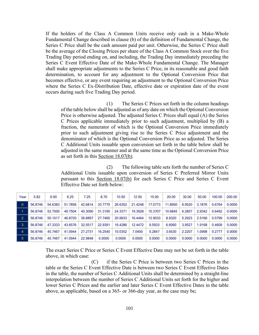 101 If the holders of the Class A Common Units receive only cash in a Make-Whole Fundamental Change described in clause (b) of the definition of Fundamental Change, the Series C Price shall be the cash amount paid per unit. Otherwise, the Series C Price shall be the average of the Closing Prices per share of the Class A Common Stock over the five Trading Day period ending on, and including, the Trading Day immediately preceding the Series C Event Effective Date of the Make-Whole Fundamental Change. The Manager shall make appropriate adjustments to the Series C Price, in its reasonable and good faith determination, to account for any adjustment to the Optional Conversion Price that becomes effective, or any event requiring an adjustment to the Optional Conversion Price where the Series C Ex-Distribution Date, effective date or expiration date of the event occurs during such five Trading Day period. (1) The Series C Prices set forth in the column headings of the table below shall be adjusted as of any date on which the Optional Conversion Price is otherwise adjusted. The adjusted Series C Prices shall equal (A) the Series C Prices applicable immediately prior to such adjustment, multiplied by (B) a fraction, the numerator of which is the Optional Conversion Price immediately prior to such adjustment giving rise to the Series C Price adjustment and the denominator of which is the Optional Conversion Price as so adjusted. The Series C Additional Units issuable upon conversion set forth in the table below shall be adjusted in the same manner and at the same time as the Optional Conversion Price as set forth in this Section 18.07(b). (2) The following table sets forth the number of Series C Additional Units issuable upon conversion of Series C Preferred Mirror Units pursuant to this Section 18.07(b) for each Series C Price and Series C Event Effective Date set forth below: Year 5.82 6.00 6.25 7.25 8.70 10.50 12.50 15.00 20.00 30.00 50.00 100.00 200.00 0 56.8746 54.6383 51.7856 42.6814 33.7770 26.6352 21.4248 17.0773 11.8950 6.9520 3.1876 0.6764 0.0000 1 56.8746 52.7500 49.7504 40.3090 31.3195 24.3371 19.3928 15.3707 10.6845 6.2857 2.9342 0.6492 0.0000 2 56.8746 50.1017 46.8720 36.8897 27.7460 20.9933 16.4464 12.9033 8.9320 5.2923 2.5166 0.5799 0.0000 3 56.8746 47.3333 43.6576 32.5517 22.9391 16.4286 12.4472 9.5933 6.6060 3.9527 1.9168 0.4609 0.0000 4 56.8746 45.7467 41.0944 27.2731 16.2540 10.0352 7.0400 5.2847 3.6530 2.2207 1.0998 0.2777 0.0000 5 56.8746 45.7467 41.0944 22.9848 0.0000 0.0000 0.0000 0.0000 0.0000 0.0000 0.0000 0.0000 0.0000 The exact Series C Price or Series C Event Effective Date may not be set forth in the table above, in which case: (C) if the Series C Price is between two Series C Prices in the table or the Series C Event Effective Date is between two Series C Event Effective Dates in the table, the number of Series C Additional Units shall be determined by a straight-line interpolation between the number of Series C Additional Units set forth for the higher and lower Series C Prices and the earlier and later Series C Event Effective Dates in the table above, as applicable, based on a 365- or 366-day year, as the case may be;