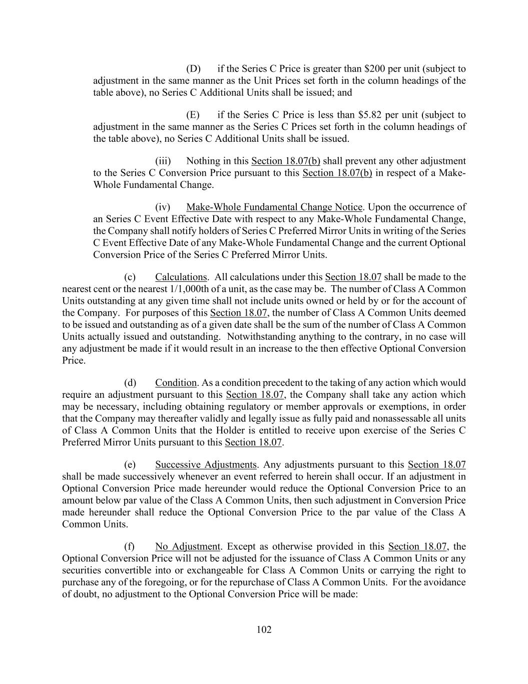 102 (D) if the Series C Price is greater than $200 per unit (subject to adjustment in the same manner as the Unit Prices set forth in the column headings of the table above), no Series C Additional Units shall be issued; and (E) if the Series C Price is less than $5.82 per unit (subject to adjustment in the same manner as the Series C Prices set forth in the column headings of the table above), no Series C Additional Units shall be issued. (iii) Nothing in this Section 18.07(b) shall prevent any other adjustment to the Series C Conversion Price pursuant to this Section 18.07(b) in respect of a Make- Whole Fundamental Change. (iv) Make-Whole Fundamental Change Notice. Upon the occurrence of an Series C Event Effective Date with respect to any Make-Whole Fundamental Change, the Company shall notify holders of Series C Preferred Mirror Units in writing of the Series C Event Effective Date of any Make-Whole Fundamental Change and the current Optional Conversion Price of the Series C Preferred Mirror Units. (c) Calculations. All calculations under this Section 18.07 shall be made to the nearest cent or the nearest 1/1,000th of a unit, as the case may be. The number of Class A Common Units outstanding at any given time shall not include units owned or held by or for the account of the Company. For purposes of this Section 18.07, the number of Class A Common Units deemed to be issued and outstanding as of a given date shall be the sum of the number of Class A Common Units actually issued and outstanding. Notwithstanding anything to the contrary, in no case will any adjustment be made if it would result in an increase to the then effective Optional Conversion Price. (d) Condition. As a condition precedent to the taking of any action which would require an adjustment pursuant to this Section 18.07, the Company shall take any action which may be necessary, including obtaining regulatory or member approvals or exemptions, in order that the Company may thereafter validly and legally issue as fully paid and nonassessable all units of Class A Common Units that the Holder is entitled to receive upon exercise of the Series C Preferred Mirror Units pursuant to this Section 18.07. (e) Successive Adjustments. Any adjustments pursuant to this Section 18.07 shall be made successively whenever an event referred to herein shall occur. If an adjustment in Optional Conversion Price made hereunder would reduce the Optional Conversion Price to an amount below par value of the Class A Common Units, then such adjustment in Conversion Price made hereunder shall reduce the Optional Conversion Price to the par value of the Class A Common Units. (f) No Adjustment. Except as otherwise provided in this Section 18.07, the Optional Conversion Price will not be adjusted for the issuance of Class A Common Units or any securities convertible into or exchangeable for Class A Common Units or carrying the right to purchase any of the foregoing, or for the repurchase of Class A Common Units. For the avoidance of doubt, no adjustment to the Optional Conversion Price will be made:
