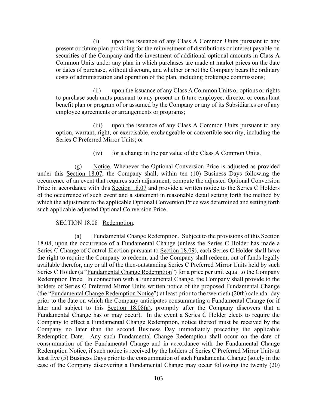103 (i) upon the issuance of any Class A Common Units pursuant to any present or future plan providing for the reinvestment of distributions or interest payable on securities of the Company and the investment of additional optional amounts in Class A Common Units under any plan in which purchases are made at market prices on the date or dates of purchase, without discount, and whether or not the Company bears the ordinary costs of administration and operation of the plan, including brokerage commissions; (ii) upon the issuance of any Class A Common Units or options or rights to purchase such units pursuant to any present or future employee, director or consultant benefit plan or program of or assumed by the Company or any of its Subsidiaries or of any employee agreements or arrangements or programs; (iii) upon the issuance of any Class A Common Units pursuant to any option, warrant, right, or exercisable, exchangeable or convertible security, including the Series C Preferred Mirror Units; or (iv) for a change in the par value of the Class A Common Units. (g) Notice. Whenever the Optional Conversion Price is adjusted as provided under this Section 18.07, the Company shall, within ten (10) Business Days following the occurrence of an event that requires such adjustment, compute the adjusted Optional Conversion Price in accordance with this Section 18.07 and provide a written notice to the Series C Holders of the occurrence of such event and a statement in reasonable detail setting forth the method by which the adjustment to the applicable Optional Conversion Price was determined and setting forth such applicable adjusted Optional Conversion Price. SECTION 18.08 Redemption. (a) Fundamental Change Redemption. Subject to the provisions of this Section 18.08, upon the occurrence of a Fundamental Change (unless the Series C Holder has made a Series C Change of Control Election pursuant to Section 18.09), each Series C Holder shall have the right to require the Company to redeem, and the Company shall redeem, out of funds legally available therefor, any or all of the then-outstanding Series C Preferred Mirror Units held by such Series C Holder (a “Fundamental Change Redemption”) for a price per unit equal to the Company Redemption Price. In connection with a Fundamental Change, the Company shall provide to the holders of Series C Preferred Mirror Units written notice of the proposed Fundamental Change (the “Fundamental Change Redemption Notice”) at least prior to the twentieth (20th) calendar day prior to the date on which the Company anticipates consummating a Fundamental Change (or if later and subject to this Section 18.08(a), promptly after the Company discovers that a Fundamental Change has or may occur). In the event a Series C Holder elects to require the Company to effect a Fundamental Change Redemption, notice thereof must be received by the Company no later than the second Business Day immediately preceding the applicable Redemption Date. Any such Fundamental Change Redemption shall occur on the date of consummation of the Fundamental Change and in accordance with the Fundamental Change Redemption Notice, if such notice is received by the holders of Series C Preferred Mirror Units at least five (5) Business Days prior to the consummation of such Fundamental Change (solely in the case of the Company discovering a Fundamental Change may occur following the twenty (20)