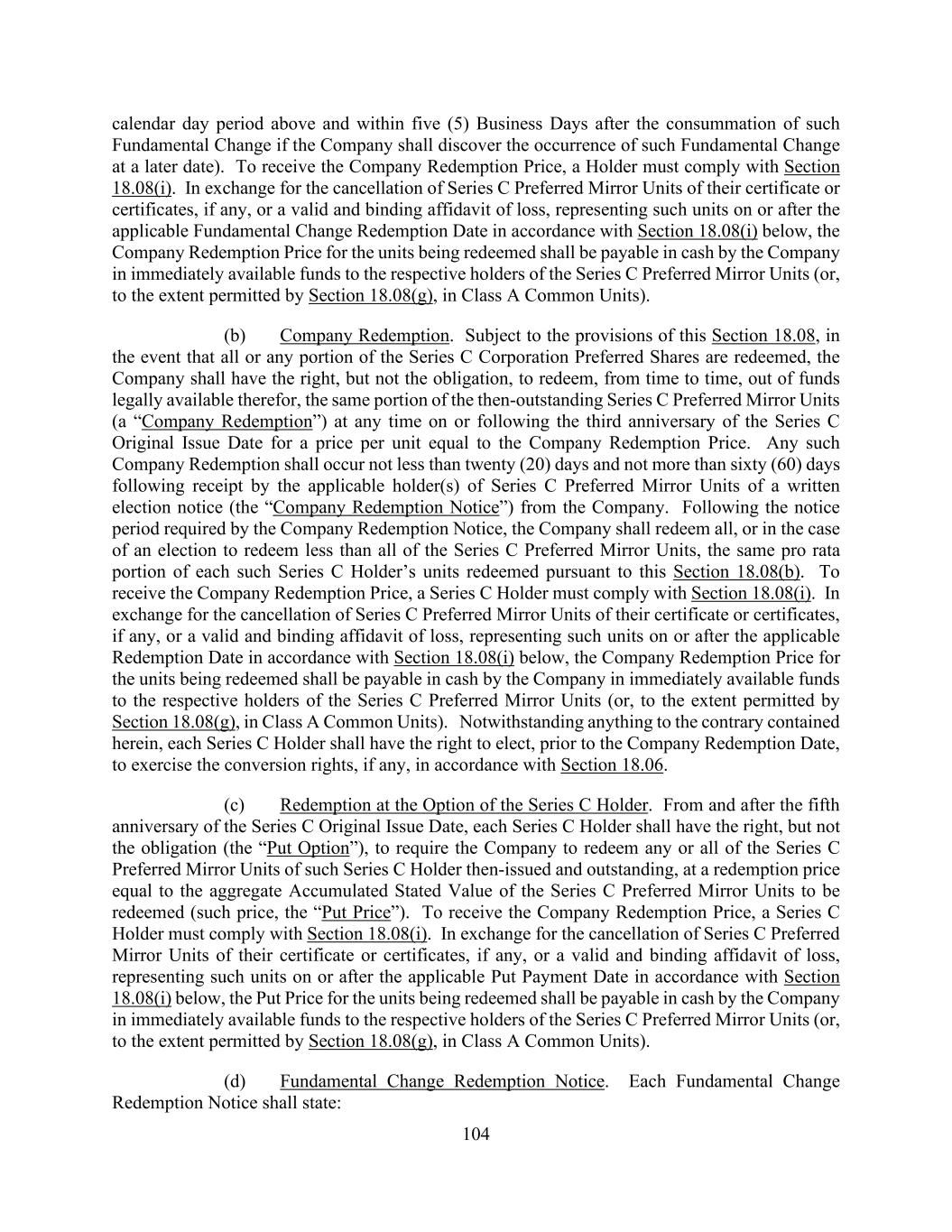 104 calendar day period above and within five (5) Business Days after the consummation of such Fundamental Change if the Company shall discover the occurrence of such Fundamental Change at a later date). To receive the Company Redemption Price, a Holder must comply with Section 18.08(i). In exchange for the cancellation of Series C Preferred Mirror Units of their certificate or certificates, if any, or a valid and binding affidavit of loss, representing such units on or after the applicable Fundamental Change Redemption Date in accordance with Section 18.08(i) below, the Company Redemption Price for the units being redeemed shall be payable in cash by the Company in immediately available funds to the respective holders of the Series C Preferred Mirror Units (or, to the extent permitted by Section 18.08(g), in Class A Common Units). (b) Company Redemption. Subject to the provisions of this Section 18.08, in the event that all or any portion of the Series C Corporation Preferred Shares are redeemed, the Company shall have the right, but not the obligation, to redeem, from time to time, out of funds legally available therefor, the same portion of the then-outstanding Series C Preferred Mirror Units (a “Company Redemption”) at any time on or following the third anniversary of the Series C Original Issue Date for a price per unit equal to the Company Redemption Price. Any such Company Redemption shall occur not less than twenty (20) days and not more than sixty (60) days following receipt by the applicable holder(s) of Series C Preferred Mirror Units of a written election notice (the “Company Redemption Notice”) from the Company. Following the notice period required by the Company Redemption Notice, the Company shall redeem all, or in the case of an election to redeem less than all of the Series C Preferred Mirror Units, the same pro rata portion of each such Series C Holder’s units redeemed pursuant to this Section 18.08(b). To receive the Company Redemption Price, a Series C Holder must comply with Section 18.08(i). In exchange for the cancellation of Series C Preferred Mirror Units of their certificate or certificates, if any, or a valid and binding affidavit of loss, representing such units on or after the applicable Redemption Date in accordance with Section 18.08(i) below, the Company Redemption Price for the units being redeemed shall be payable in cash by the Company in immediately available funds to the respective holders of the Series C Preferred Mirror Units (or, to the extent permitted by Section 18.08(g), in Class A Common Units). Notwithstanding anything to the contrary contained herein, each Series C Holder shall have the right to elect, prior to the Company Redemption Date, to exercise the conversion rights, if any, in accordance with Section 18.06. (c) Redemption at the Option of the Series C Holder. From and after the fifth anniversary of the Series C Original Issue Date, each Series C Holder shall have the right, but not the obligation (the “Put Option”), to require the Company to redeem any or all of the Series C Preferred Mirror Units of such Series C Holder then-issued and outstanding, at a redemption price equal to the aggregate Accumulated Stated Value of the Series C Preferred Mirror Units to be redeemed (such price, the “Put Price”). To receive the Company Redemption Price, a Series C Holder must comply with Section 18.08(i). In exchange for the cancellation of Series C Preferred Mirror Units of their certificate or certificates, if any, or a valid and binding affidavit of loss, representing such units on or after the applicable Put Payment Date in accordance with Section 18.08(i) below, the Put Price for the units being redeemed shall be payable in cash by the Company in immediately available funds to the respective holders of the Series C Preferred Mirror Units (or, to the extent permitted by Section 18.08(g), in Class A Common Units). (d) Fundamental Change Redemption Notice. Each Fundamental Change Redemption Notice shall state: