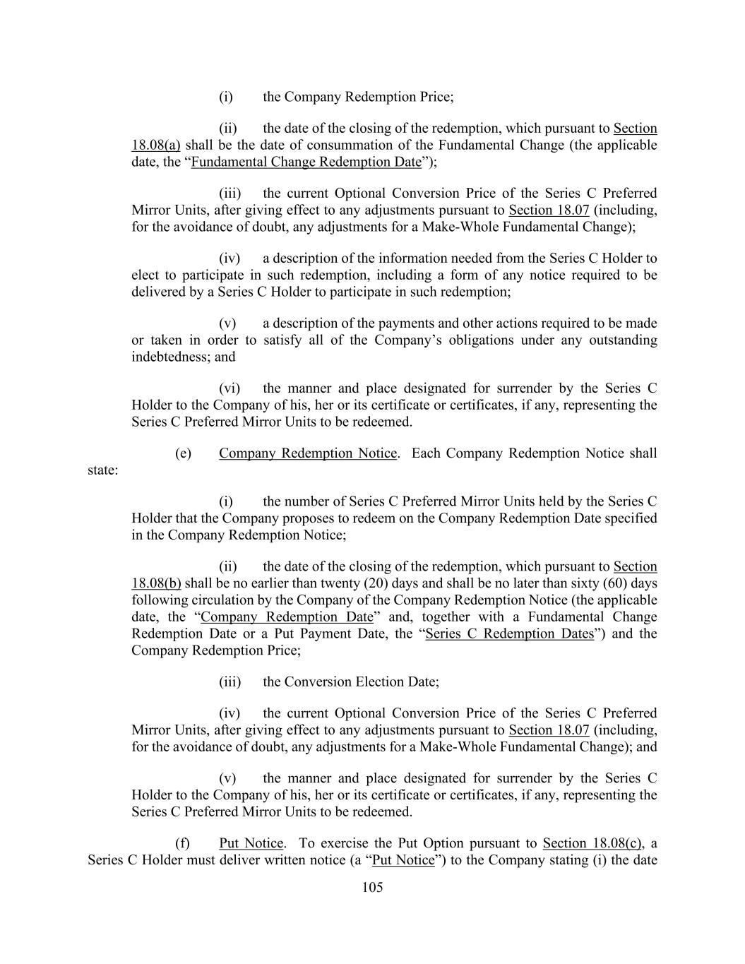 105 (i) the Company Redemption Price; (ii) the date of the closing of the redemption, which pursuant to Section 18.08(a) shall be the date of consummation of the Fundamental Change (the applicable date, the “Fundamental Change Redemption Date”); (iii) the current Optional Conversion Price of the Series C Preferred Mirror Units, after giving effect to any adjustments pursuant to Section 18.07 (including, for the avoidance of doubt, any adjustments for a Make-Whole Fundamental Change); (iv) a description of the information needed from the Series C Holder to elect to participate in such redemption, including a form of any notice required to be delivered by a Series C Holder to participate in such redemption; (v) a description of the payments and other actions required to be made or taken in order to satisfy all of the Company’s obligations under any outstanding indebtedness; and (vi) the manner and place designated for surrender by the Series C Holder to the Company of his, her or its certificate or certificates, if any, representing the Series C Preferred Mirror Units to be redeemed. (e) Company Redemption Notice. Each Company Redemption Notice shall state: (i) the number of Series C Preferred Mirror Units held by the Series C Holder that the Company proposes to redeem on the Company Redemption Date specified in the Company Redemption Notice; (ii) the date of the closing of the redemption, which pursuant to Section 18.08(b) shall be no earlier than twenty (20) days and shall be no later than sixty (60) days following circulation by the Company of the Company Redemption Notice (the applicable date, the “Company Redemption Date” and, together with a Fundamental Change Redemption Date or a Put Payment Date, the “Series C Redemption Dates”) and the Company Redemption Price; (iii) the Conversion Election Date; (iv) the current Optional Conversion Price of the Series C Preferred Mirror Units, after giving effect to any adjustments pursuant to Section 18.07 (including, for the avoidance of doubt, any adjustments for a Make-Whole Fundamental Change); and (v) the manner and place designated for surrender by the Series C Holder to the Company of his, her or its certificate or certificates, if any, representing the Series C Preferred Mirror Units to be redeemed. (f) Put Notice. To exercise the Put Option pursuant to Section 18.08(c), a Series C Holder must deliver written notice (a “Put Notice”) to the Company stating (i) the date