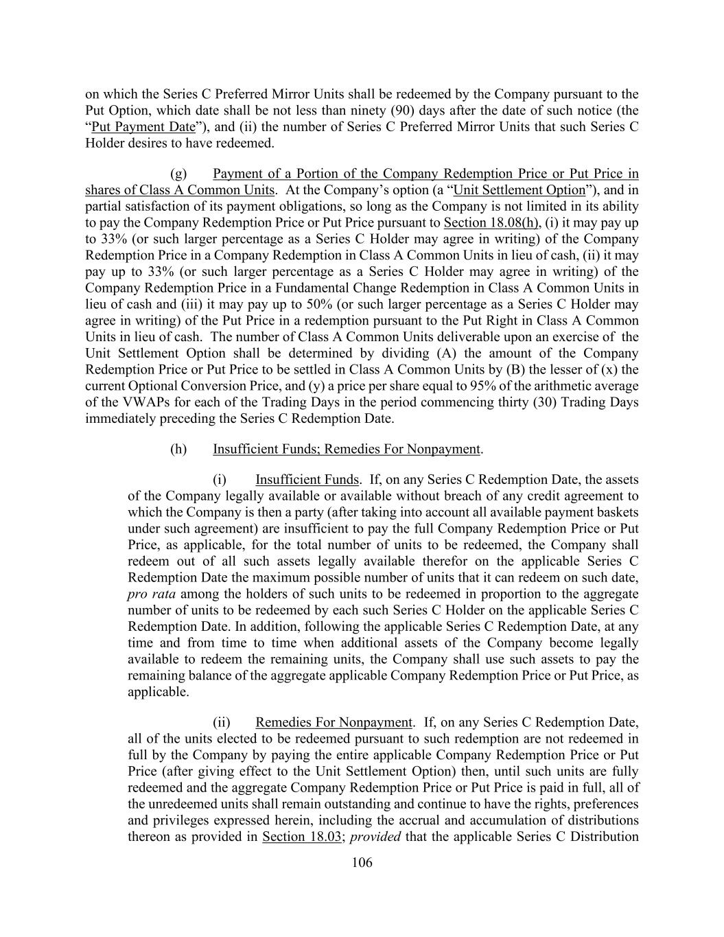 106 on which the Series C Preferred Mirror Units shall be redeemed by the Company pursuant to the Put Option, which date shall be not less than ninety (90) days after the date of such notice (the “Put Payment Date”), and (ii) the number of Series C Preferred Mirror Units that such Series C Holder desires to have redeemed. (g) Payment of a Portion of the Company Redemption Price or Put Price in shares of Class A Common Units. At the Company’s option (a “Unit Settlement Option”), and in partial satisfaction of its payment obligations, so long as the Company is not limited in its ability to pay the Company Redemption Price or Put Price pursuant to Section 18.08(h), (i) it may pay up to 33% (or such larger percentage as a Series C Holder may agree in writing) of the Company Redemption Price in a Company Redemption in Class A Common Units in lieu of cash, (ii) it may pay up to 33% (or such larger percentage as a Series C Holder may agree in writing) of the Company Redemption Price in a Fundamental Change Redemption in Class A Common Units in lieu of cash and (iii) it may pay up to 50% (or such larger percentage as a Series C Holder may agree in writing) of the Put Price in a redemption pursuant to the Put Right in Class A Common Units in lieu of cash. The number of Class A Common Units deliverable upon an exercise of the Unit Settlement Option shall be determined by dividing (A) the amount of the Company Redemption Price or Put Price to be settled in Class A Common Units by (B) the lesser of (x) the current Optional Conversion Price, and (y) a price per share equal to 95% of the arithmetic average of the VWAPs for each of the Trading Days in the period commencing thirty (30) Trading Days immediately preceding the Series C Redemption Date. (h) Insufficient Funds; Remedies For Nonpayment. (i) Insufficient Funds. If, on any Series C Redemption Date, the assets of the Company legally available or available without breach of any credit agreement to which the Company is then a party (after taking into account all available payment baskets under such agreement) are insufficient to pay the full Company Redemption Price or Put Price, as applicable, for the total number of units to be redeemed, the Company shall redeem out of all such assets legally available therefor on the applicable Series C Redemption Date the maximum possible number of units that it can redeem on such date, pro rata among the holders of such units to be redeemed in proportion to the aggregate number of units to be redeemed by each such Series C Holder on the applicable Series C Redemption Date. In addition, following the applicable Series C Redemption Date, at any time and from time to time when additional assets of the Company become legally available to redeem the remaining units, the Company shall use such assets to pay the remaining balance of the aggregate applicable Company Redemption Price or Put Price, as applicable. (ii) Remedies For Nonpayment. If, on any Series C Redemption Date, all of the units elected to be redeemed pursuant to such redemption are not redeemed in full by the Company by paying the entire applicable Company Redemption Price or Put Price (after giving effect to the Unit Settlement Option) then, until such units are fully redeemed and the aggregate Company Redemption Price or Put Price is paid in full, all of the unredeemed units shall remain outstanding and continue to have the rights, preferences and privileges expressed herein, including the accrual and accumulation of distributions thereon as provided in Section 18.03; provided that the applicable Series C Distribution