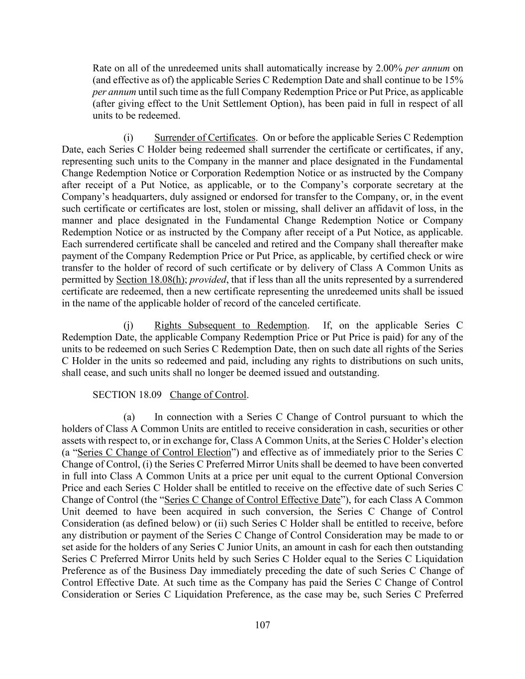 107 Rate on all of the unredeemed units shall automatically increase by 2.00% per annum on (and effective as of) the applicable Series C Redemption Date and shall continue to be 15% per annum until such time as the full Company Redemption Price or Put Price, as applicable (after giving effect to the Unit Settlement Option), has been paid in full in respect of all units to be redeemed. (i) Surrender of Certificates. On or before the applicable Series C Redemption Date, each Series C Holder being redeemed shall surrender the certificate or certificates, if any, representing such units to the Company in the manner and place designated in the Fundamental Change Redemption Notice or Corporation Redemption Notice or as instructed by the Company after receipt of a Put Notice, as applicable, or to the Company’s corporate secretary at the Company’s headquarters, duly assigned or endorsed for transfer to the Company, or, in the event such certificate or certificates are lost, stolen or missing, shall deliver an affidavit of loss, in the manner and place designated in the Fundamental Change Redemption Notice or Company Redemption Notice or as instructed by the Company after receipt of a Put Notice, as applicable. Each surrendered certificate shall be canceled and retired and the Company shall thereafter make payment of the Company Redemption Price or Put Price, as applicable, by certified check or wire transfer to the holder of record of such certificate or by delivery of Class A Common Units as permitted by Section 18.08(h); provided, that if less than all the units represented by a surrendered certificate are redeemed, then a new certificate representing the unredeemed units shall be issued in the name of the applicable holder of record of the canceled certificate. (j) Rights Subsequent to Redemption. If, on the applicable Series C Redemption Date, the applicable Company Redemption Price or Put Price is paid) for any of the units to be redeemed on such Series C Redemption Date, then on such date all rights of the Series C Holder in the units so redeemed and paid, including any rights to distributions on such units, shall cease, and such units shall no longer be deemed issued and outstanding. SECTION 18.09 Change of Control. (a) In connection with a Series C Change of Control pursuant to which the holders of Class A Common Units are entitled to receive consideration in cash, securities or other assets with respect to, or in exchange for, Class A Common Units, at the Series C Holder’s election (a “Series C Change of Control Election”) and effective as of immediately prior to the Series C Change of Control, (i) the Series C Preferred Mirror Units shall be deemed to have been converted in full into Class A Common Units at a price per unit equal to the current Optional Conversion Price and each Series C Holder shall be entitled to receive on the effective date of such Series C Change of Control (the “Series C Change of Control Effective Date”), for each Class A Common Unit deemed to have been acquired in such conversion, the Series C Change of Control Consideration (as defined below) or (ii) such Series C Holder shall be entitled to receive, before any distribution or payment of the Series C Change of Control Consideration may be made to or set aside for the holders of any Series C Junior Units, an amount in cash for each then outstanding Series C Preferred Mirror Units held by such Series C Holder equal to the Series C Liquidation Preference as of the Business Day immediately preceding the date of such Series C Change of Control Effective Date. At such time as the Company has paid the Series C Change of Control Consideration or Series C Liquidation Preference, as the case may be, such Series C Preferred