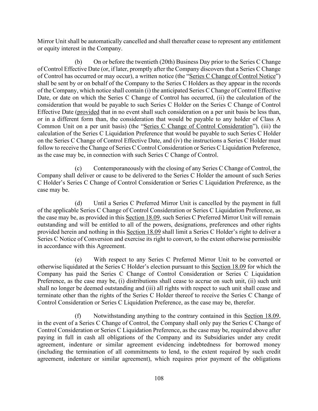 108 Mirror Unit shall be automatically cancelled and shall thereafter cease to represent any entitlement or equity interest in the Company. (b) On or before the twentieth (20th) Business Day prior to the Series C Change of Control Effective Date (or, if later, promptly after the Company discovers that a Series C Change of Control has occurred or may occur), a written notice (the “Series C Change of Control Notice”) shall be sent by or on behalf of the Company to the Series C Holders as they appear in the records of the Company, which notice shall contain (i) the anticipated Series C Change of Control Effective Date, or date on which the Series C Change of Control has occurred, (ii) the calculation of the consideration that would be payable to such Series C Holder on the Series C Change of Control Effective Date (provided that in no event shall such consideration on a per unit basis be less than, or in a different form than, the consideration that would be payable to any holder of Class A Common Unit on a per unit basis) (the “Series C Change of Control Consideration”), (iii) the calculation of the Series C Liquidation Preference that would be payable to such Series C Holder on the Series C Change of Control Effective Date, and (iv) the instructions a Series C Holder must follow to receive the Change of Series C Control Consideration or Series C Liquidation Preference, as the case may be, in connection with such Series C Change of Control. (c) Contemporaneously with the closing of any Series C Change of Control, the Company shall deliver or cause to be delivered to the Series C Holder the amount of such Series C Holder’s Series C Change of Control Consideration or Series C Liquidation Preference, as the case may be. (d) Until a Series C Preferred Mirror Unit is cancelled by the payment in full of the applicable Series C Change of Control Consideration or Series C Liquidation Preference, as the case may be, as provided in this Section 18.09, such Series C Preferred Mirror Unit will remain outstanding and will be entitled to all of the powers, designations, preferences and other rights provided herein and nothing in this Section 18.09 shall limit a Series C Holder’s right to deliver a Series C Notice of Conversion and exercise its right to convert, to the extent otherwise permissible in accordance with this Agreement. (e) With respect to any Series C Preferred Mirror Unit to be converted or otherwise liquidated at the Series C Holder’s election pursuant to this Section 18.09 for which the Company has paid the Series C Change of Control Consideration or Series C Liquidation Preference, as the case may be, (i) distributions shall cease to accrue on such unit, (ii) such unit shall no longer be deemed outstanding and (iii) all rights with respect to such unit shall cease and terminate other than the rights of the Series C Holder thereof to receive the Series C Change of Control Consideration or Series C Liquidation Preference, as the case may be, therefor. (f) Notwithstanding anything to the contrary contained in this Section 18.09, in the event of a Series C Change of Control, the Company shall only pay the Series C Change of Control Consideration or Series C Liquidation Preference, as the case may be, required above after paying in full in cash all obligations of the Company and its Subsidiaries under any credit agreement, indenture or similar agreement evidencing indebtedness for borrowed money (including the termination of all commitments to lend, to the extent required by such credit agreement, indenture or similar agreement), which requires prior payment of the obligations