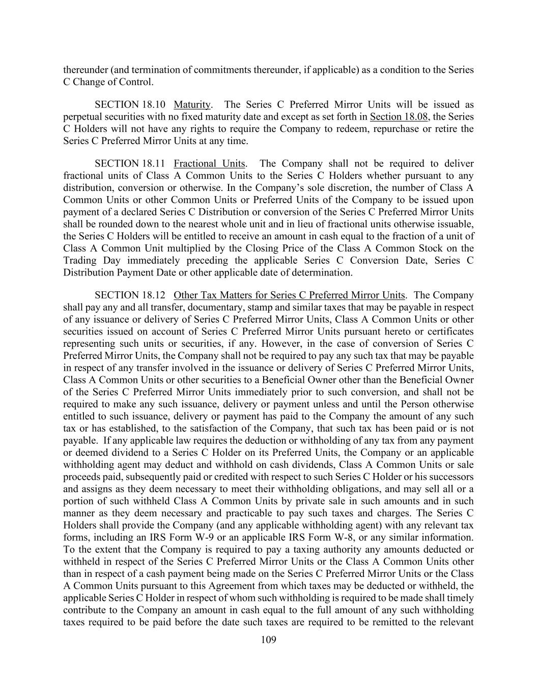 109 thereunder (and termination of commitments thereunder, if applicable) as a condition to the Series C Change of Control. SECTION 18.10 Maturity. The Series C Preferred Mirror Units will be issued as perpetual securities with no fixed maturity date and except as set forth in Section 18.08, the Series C Holders will not have any rights to require the Company to redeem, repurchase or retire the Series C Preferred Mirror Units at any time. SECTION 18.11 Fractional Units. The Company shall not be required to deliver fractional units of Class A Common Units to the Series C Holders whether pursuant to any distribution, conversion or otherwise. In the Company’s sole discretion, the number of Class A Common Units or other Common Units or Preferred Units of the Company to be issued upon payment of a declared Series C Distribution or conversion of the Series C Preferred Mirror Units shall be rounded down to the nearest whole unit and in lieu of fractional units otherwise issuable, the Series C Holders will be entitled to receive an amount in cash equal to the fraction of a unit of Class A Common Unit multiplied by the Closing Price of the Class A Common Stock on the Trading Day immediately preceding the applicable Series C Conversion Date, Series C Distribution Payment Date or other applicable date of determination. SECTION 18.12 Other Tax Matters for Series C Preferred Mirror Units. The Company shall pay any and all transfer, documentary, stamp and similar taxes that may be payable in respect of any issuance or delivery of Series C Preferred Mirror Units, Class A Common Units or other securities issued on account of Series C Preferred Mirror Units pursuant hereto or certificates representing such units or securities, if any. However, in the case of conversion of Series C Preferred Mirror Units, the Company shall not be required to pay any such tax that may be payable in respect of any transfer involved in the issuance or delivery of Series C Preferred Mirror Units, Class A Common Units or other securities to a Beneficial Owner other than the Beneficial Owner of the Series C Preferred Mirror Units immediately prior to such conversion, and shall not be required to make any such issuance, delivery or payment unless and until the Person otherwise entitled to such issuance, delivery or payment has paid to the Company the amount of any such tax or has established, to the satisfaction of the Company, that such tax has been paid or is not payable. If any applicable law requires the deduction or withholding of any tax from any payment or deemed dividend to a Series C Holder on its Preferred Units, the Company or an applicable withholding agent may deduct and withhold on cash dividends, Class A Common Units or sale proceeds paid, subsequently paid or credited with respect to such Series C Holder or his successors and assigns as they deem necessary to meet their withholding obligations, and may sell all or a portion of such withheld Class A Common Units by private sale in such amounts and in such manner as they deem necessary and practicable to pay such taxes and charges. The Series C Holders shall provide the Company (and any applicable withholding agent) with any relevant tax forms, including an IRS Form W-9 or an applicable IRS Form W-8, or any similar information. To the extent that the Company is required to pay a taxing authority any amounts deducted or withheld in respect of the Series C Preferred Mirror Units or the Class A Common Units other than in respect of a cash payment being made on the Series C Preferred Mirror Units or the Class A Common Units pursuant to this Agreement from which taxes may be deducted or withheld, the applicable Series C Holder in respect of whom such withholding is required to be made shall timely contribute to the Company an amount in cash equal to the full amount of any such withholding taxes required to be paid before the date such taxes are required to be remitted to the relevant