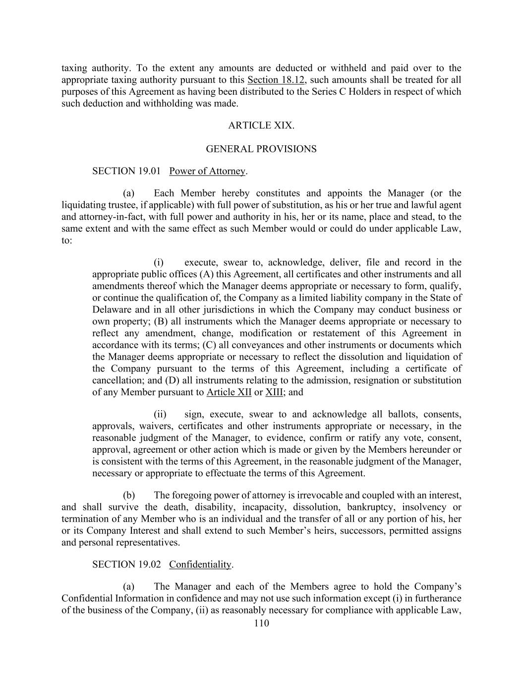 110 taxing authority. To the extent any amounts are deducted or withheld and paid over to the appropriate taxing authority pursuant to this Section 18.12, such amounts shall be treated for all purposes of this Agreement as having been distributed to the Series C Holders in respect of which such deduction and withholding was made. ARTICLE XIX. GENERAL PROVISIONS SECTION 19.01 Power of Attorney. (a) Each Member hereby constitutes and appoints the Manager (or the liquidating trustee, if applicable) with full power of substitution, as his or her true and lawful agent and attorney-in-fact, with full power and authority in his, her or its name, place and stead, to the same extent and with the same effect as such Member would or could do under applicable Law, to: (i) execute, swear to, acknowledge, deliver, file and record in the appropriate public offices (A) this Agreement, all certificates and other instruments and all amendments thereof which the Manager deems appropriate or necessary to form, qualify, or continue the qualification of, the Company as a limited liability company in the State of Delaware and in all other jurisdictions in which the Company may conduct business or own property; (B) all instruments which the Manager deems appropriate or necessary to reflect any amendment, change, modification or restatement of this Agreement in accordance with its terms; (C) all conveyances and other instruments or documents which the Manager deems appropriate or necessary to reflect the dissolution and liquidation of the Company pursuant to the terms of this Agreement, including a certificate of cancellation; and (D) all instruments relating to the admission, resignation or substitution of any Member pursuant to Article XII or XIII; and (ii) sign, execute, swear to and acknowledge all ballots, consents, approvals, waivers, certificates and other instruments appropriate or necessary, in the reasonable judgment of the Manager, to evidence, confirm or ratify any vote, consent, approval, agreement or other action which is made or given by the Members hereunder or is consistent with the terms of this Agreement, in the reasonable judgment of the Manager, necessary or appropriate to effectuate the terms of this Agreement. (b) The foregoing power of attorney is irrevocable and coupled with an interest, and shall survive the death, disability, incapacity, dissolution, bankruptcy, insolvency or termination of any Member who is an individual and the transfer of all or any portion of his, her or its Company Interest and shall extend to such Member’s heirs, successors, permitted assigns and personal representatives. SECTION 19.02 Confidentiality. (a) The Manager and each of the Members agree to hold the Company’s Confidential Information in confidence and may not use such information except (i) in furtherance of the business of the Company, (ii) as reasonably necessary for compliance with applicable Law,