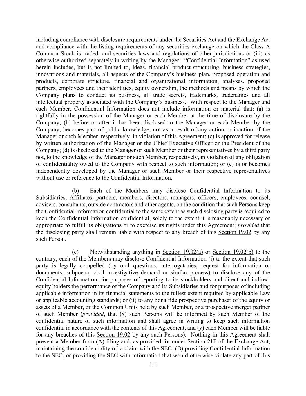 111 including compliance with disclosure requirements under the Securities Act and the Exchange Act and compliance with the listing requirements of any securities exchange on which the Class A Common Stock is traded, and securities laws and regulations of other jurisdictions or (iii) as otherwise authorized separately in writing by the Manager. “Confidential Information” as used herein includes, but is not limited to, ideas, financial product structuring, business strategies, innovations and materials, all aspects of the Company’s business plan, proposed operation and products, corporate structure, financial and organizational information, analyses, proposed partners, employees and their identities, equity ownership, the methods and means by which the Company plans to conduct its business, all trade secrets, trademarks, tradenames and all intellectual property associated with the Company’s business. With respect to the Manager and each Member, Confidential Information does not include information or material that: (a) is rightfully in the possession of the Manager or each Member at the time of disclosure by the Company; (b) before or after it has been disclosed to the Manager or each Member by the Company, becomes part of public knowledge, not as a result of any action or inaction of the Manager or such Member, respectively, in violation of this Agreement; (c) is approved for release by written authorization of the Manager or the Chief Executive Officer or the President of the Company; (d) is disclosed to the Manager or such Member or their representatives by a third party not, to the knowledge of the Manager or such Member, respectively, in violation of any obligation of confidentiality owed to the Company with respect to such information; or (e) is or becomes independently developed by the Manager or such Member or their respective representatives without use or reference to the Confidential Information. (b) Each of the Members may disclose Confidential Information to its Subsidiaries, Affiliates, partners, members, directors, managers, officers, employees, counsel, advisers, consultants, outside contractors and other agents, on the condition that such Persons keep the Confidential Information confidential to the same extent as such disclosing party is required to keep the Confidential Information confidential, solely to the extent it is reasonably necessary or appropriate to fulfill its obligations or to exercise its rights under this Agreement; provided that the disclosing party shall remain liable with respect to any breach of this Section 19.02 by any such Person. (c) Notwithstanding anything in Section 19.02(a) or Section 19.02(b) to the contrary, each of the Members may disclose Confidential Information (i) to the extent that such party is legally compelled (by oral questions, interrogatories, request for information or documents, subpoena, civil investigative demand or similar process) to disclose any of the Confidential Information, for purposes of reporting to its stockholders and direct and indirect equity holders the performance of the Company and its Subsidiaries and for purposes of including applicable information in its financial statements to the fullest extent required by applicable Law or applicable accounting standards; or (ii) to any bona fide prospective purchaser of the equity or assets of a Member, or the Common Units held by such Member, or a prospective merger partner of such Member (provided, that (x) such Persons will be informed by such Member of the confidential nature of such information and shall agree in writing to keep such information confidential in accordance with the contents of this Agreement, and (y) each Member will be liable for any breaches of this Section 19.02 by any such Persons). Nothing in this Agreement shall prevent a Member from (A) filing and, as provided for under Section 21F of the Exchange Act, maintaining the confidentiality of, a claim with the SEC; (B) providing Confidential Information to the SEC, or providing the SEC with information that would otherwise violate any part of this