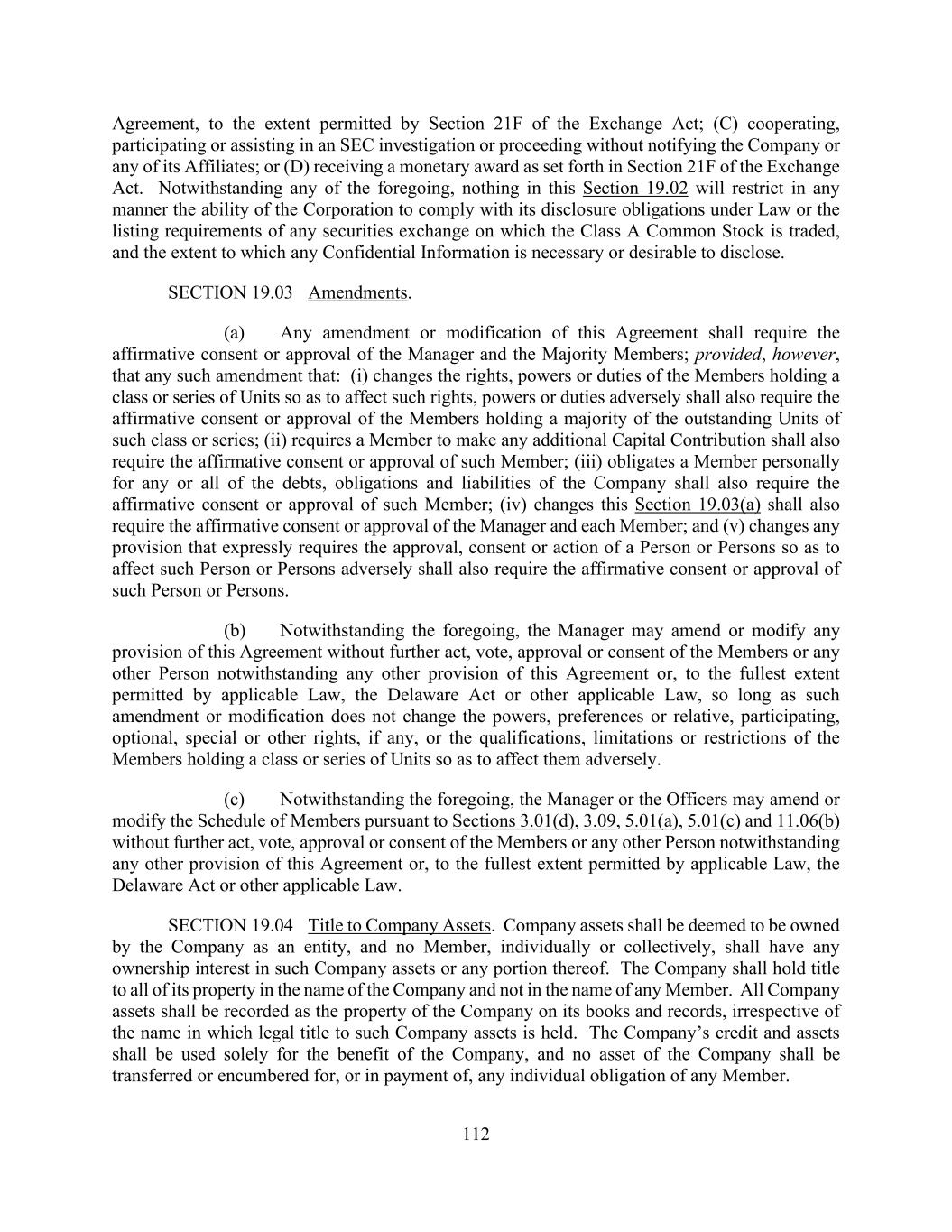 112 Agreement, to the extent permitted by Section 21F of the Exchange Act; (C) cooperating, participating or assisting in an SEC investigation or proceeding without notifying the Company or any of its Affiliates; or (D) receiving a monetary award as set forth in Section 21F of the Exchange Act. Notwithstanding any of the foregoing, nothing in this Section 19.02 will restrict in any manner the ability of the Corporation to comply with its disclosure obligations under Law or the listing requirements of any securities exchange on which the Class A Common Stock is traded, and the extent to which any Confidential Information is necessary or desirable to disclose. SECTION 19.03 Amendments. (a) Any amendment or modification of this Agreement shall require the affirmative consent or approval of the Manager and the Majority Members; provided, however, that any such amendment that: (i) changes the rights, powers or duties of the Members holding a class or series of Units so as to affect such rights, powers or duties adversely shall also require the affirmative consent or approval of the Members holding a majority of the outstanding Units of such class or series; (ii) requires a Member to make any additional Capital Contribution shall also require the affirmative consent or approval of such Member; (iii) obligates a Member personally for any or all of the debts, obligations and liabilities of the Company shall also require the affirmative consent or approval of such Member; (iv) changes this Section 19.03(a) shall also require the affirmative consent or approval of the Manager and each Member; and (v) changes any provision that expressly requires the approval, consent or action of a Person or Persons so as to affect such Person or Persons adversely shall also require the affirmative consent or approval of such Person or Persons. (b) Notwithstanding the foregoing, the Manager may amend or modify any provision of this Agreement without further act, vote, approval or consent of the Members or any other Person notwithstanding any other provision of this Agreement or, to the fullest extent permitted by applicable Law, the Delaware Act or other applicable Law, so long as such amendment or modification does not change the powers, preferences or relative, participating, optional, special or other rights, if any, or the qualifications, limitations or restrictions of the Members holding a class or series of Units so as to affect them adversely. (c) Notwithstanding the foregoing, the Manager or the Officers may amend or modify the Schedule of Members pursuant to Sections 3.01(d), 3.09, 5.01(a), 5.01(c) and 11.06(b) without further act, vote, approval or consent of the Members or any other Person notwithstanding any other provision of this Agreement or, to the fullest extent permitted by applicable Law, the Delaware Act or other applicable Law. SECTION 19.04 Title to Company Assets. Company assets shall be deemed to be owned by the Company as an entity, and no Member, individually or collectively, shall have any ownership interest in such Company assets or any portion thereof. The Company shall hold title to all of its property in the name of the Company and not in the name of any Member. All Company assets shall be recorded as the property of the Company on its books and records, irrespective of the name in which legal title to such Company assets is held. The Company’s credit and assets shall be used solely for the benefit of the Company, and no asset of the Company shall be transferred or encumbered for, or in payment of, any individual obligation of any Member.