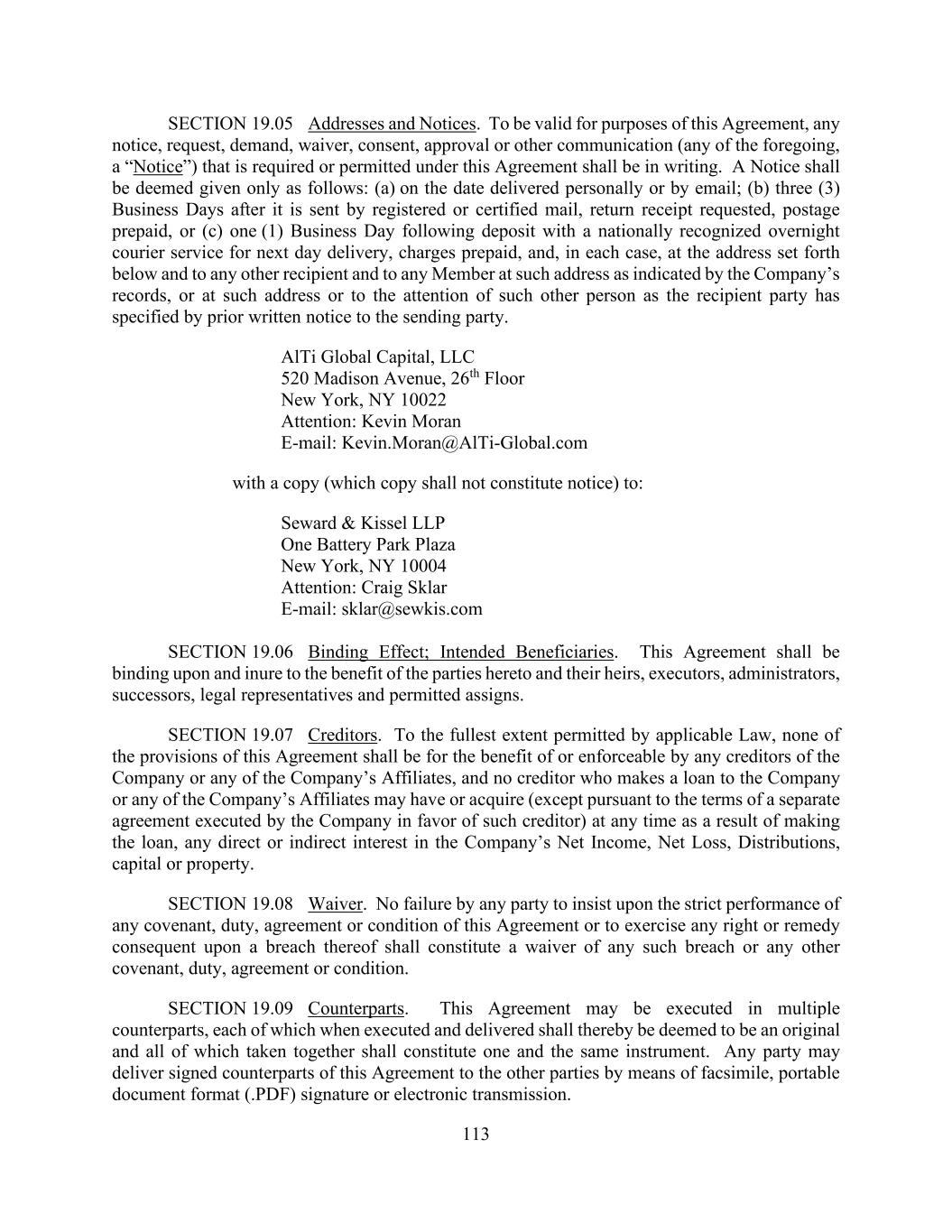 113 SECTION 19.05 Addresses and Notices. To be valid for purposes of this Agreement, any notice, request, demand, waiver, consent, approval or other communication (any of the foregoing, a “Notice”) that is required or permitted under this Agreement shall be in writing. A Notice shall be deemed given only as follows: (a) on the date delivered personally or by email; (b) three (3) Business Days after it is sent by registered or certified mail, return receipt requested, postage prepaid, or (c) one (1) Business Day following deposit with a nationally recognized overnight courier service for next day delivery, charges prepaid, and, in each case, at the address set forth below and to any other recipient and to any Member at such address as indicated by the Company’s records, or at such address or to the attention of such other person as the recipient party has specified by prior written notice to the sending party. AlTi Global Capital, LLC 520 Madison Avenue, 26th Floor New York, NY 10022 Attention: Kevin Moran E-mail: Kevin.Moran@AlTi-Global.com with a copy (which copy shall not constitute notice) to: Seward & Kissel LLP One Battery Park Plaza New York, NY 10004 Attention: Craig Sklar E-mail: sklar@sewkis.com SECTION 19.06 Binding Effect; Intended Beneficiaries. This Agreement shall be binding upon and inure to the benefit of the parties hereto and their heirs, executors, administrators, successors, legal representatives and permitted assigns. SECTION 19.07 Creditors. To the fullest extent permitted by applicable Law, none of the provisions of this Agreement shall be for the benefit of or enforceable by any creditors of the Company or any of the Company’s Affiliates, and no creditor who makes a loan to the Company or any of the Company’s Affiliates may have or acquire (except pursuant to the terms of a separate agreement executed by the Company in favor of such creditor) at any time as a result of making the loan, any direct or indirect interest in the Company’s Net Income, Net Loss, Distributions, capital or property. SECTION 19.08 Waiver. No failure by any party to insist upon the strict performance of any covenant, duty, agreement or condition of this Agreement or to exercise any right or remedy consequent upon a breach thereof shall constitute a waiver of any such breach or any other covenant, duty, agreement or condition. SECTION 19.09 Counterparts. This Agreement may be executed in multiple counterparts, each of which when executed and delivered shall thereby be deemed to be an original and all of which taken together shall constitute one and the same instrument. Any party may deliver signed counterparts of this Agreement to the other parties by means of facsimile, portable document format (.PDF) signature or electronic transmission.