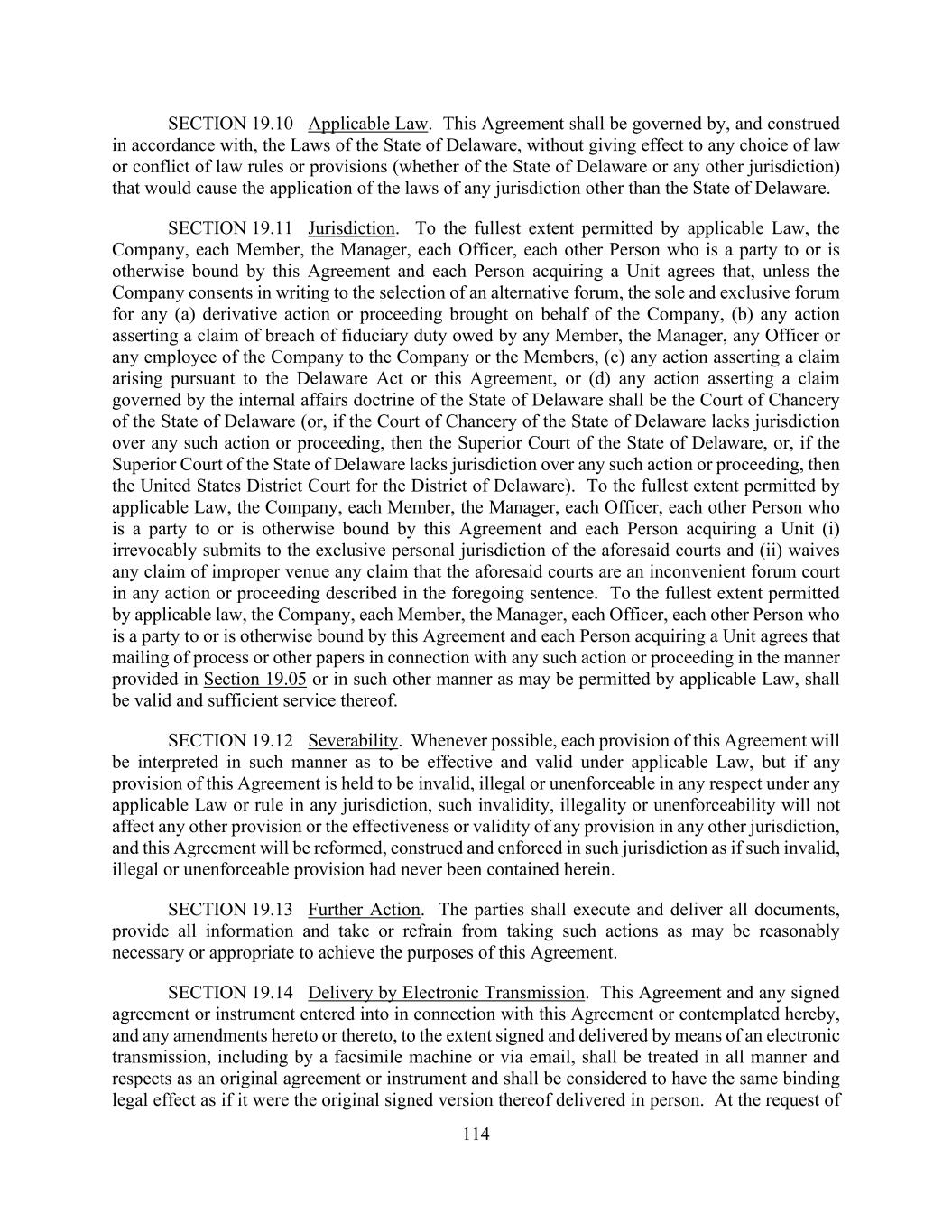 114 SECTION 19.10 Applicable Law. This Agreement shall be governed by, and construed in accordance with, the Laws of the State of Delaware, without giving effect to any choice of law or conflict of law rules or provisions (whether of the State of Delaware or any other jurisdiction) that would cause the application of the laws of any jurisdiction other than the State of Delaware. SECTION 19.11 Jurisdiction. To the fullest extent permitted by applicable Law, the Company, each Member, the Manager, each Officer, each other Person who is a party to or is otherwise bound by this Agreement and each Person acquiring a Unit agrees that, unless the Company consents in writing to the selection of an alternative forum, the sole and exclusive forum for any (a) derivative action or proceeding brought on behalf of the Company, (b) any action asserting a claim of breach of fiduciary duty owed by any Member, the Manager, any Officer or any employee of the Company to the Company or the Members, (c) any action asserting a claim arising pursuant to the Delaware Act or this Agreement, or (d) any action asserting a claim governed by the internal affairs doctrine of the State of Delaware shall be the Court of Chancery of the State of Delaware (or, if the Court of Chancery of the State of Delaware lacks jurisdiction over any such action or proceeding, then the Superior Court of the State of Delaware, or, if the Superior Court of the State of Delaware lacks jurisdiction over any such action or proceeding, then the United States District Court for the District of Delaware). To the fullest extent permitted by applicable Law, the Company, each Member, the Manager, each Officer, each other Person who is a party to or is otherwise bound by this Agreement and each Person acquiring a Unit (i) irrevocably submits to the exclusive personal jurisdiction of the aforesaid courts and (ii) waives any claim of improper venue any claim that the aforesaid courts are an inconvenient forum court in any action or proceeding described in the foregoing sentence. To the fullest extent permitted by applicable law, the Company, each Member, the Manager, each Officer, each other Person who is a party to or is otherwise bound by this Agreement and each Person acquiring a Unit agrees that mailing of process or other papers in connection with any such action or proceeding in the manner provided in Section 19.05 or in such other manner as may be permitted by applicable Law, shall be valid and sufficient service thereof. SECTION 19.12 Severability. Whenever possible, each provision of this Agreement will be interpreted in such manner as to be effective and valid under applicable Law, but if any provision of this Agreement is held to be invalid, illegal or unenforceable in any respect under any applicable Law or rule in any jurisdiction, such invalidity, illegality or unenforceability will not affect any other provision or the effectiveness or validity of any provision in any other jurisdiction, and this Agreement will be reformed, construed and enforced in such jurisdiction as if such invalid, illegal or unenforceable provision had never been contained herein. SECTION 19.13 Further Action. The parties shall execute and deliver all documents, provide all information and take or refrain from taking such actions as may be reasonably necessary or appropriate to achieve the purposes of this Agreement. SECTION 19.14 Delivery by Electronic Transmission. This Agreement and any signed agreement or instrument entered into in connection with this Agreement or contemplated hereby, and any amendments hereto or thereto, to the extent signed and delivered by means of an electronic transmission, including by a facsimile machine or via email, shall be treated in all manner and respects as an original agreement or instrument and shall be considered to have the same binding legal effect as if it were the original signed version thereof delivered in person. At the request of